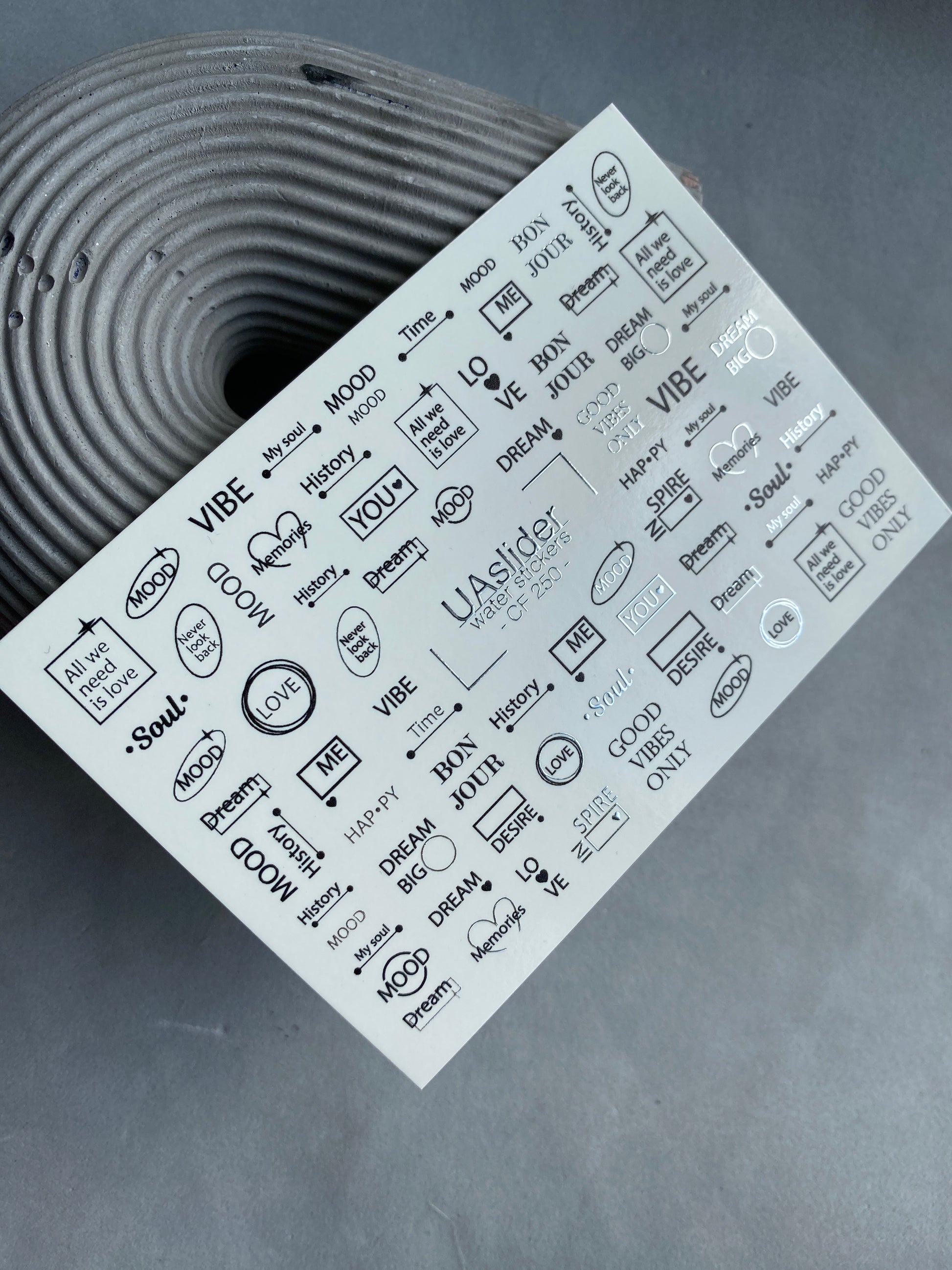Nail Water Decal CF-250 | Minimalist Water Slide Nail Decals | Black & Silver Quotes and WordsCF_250