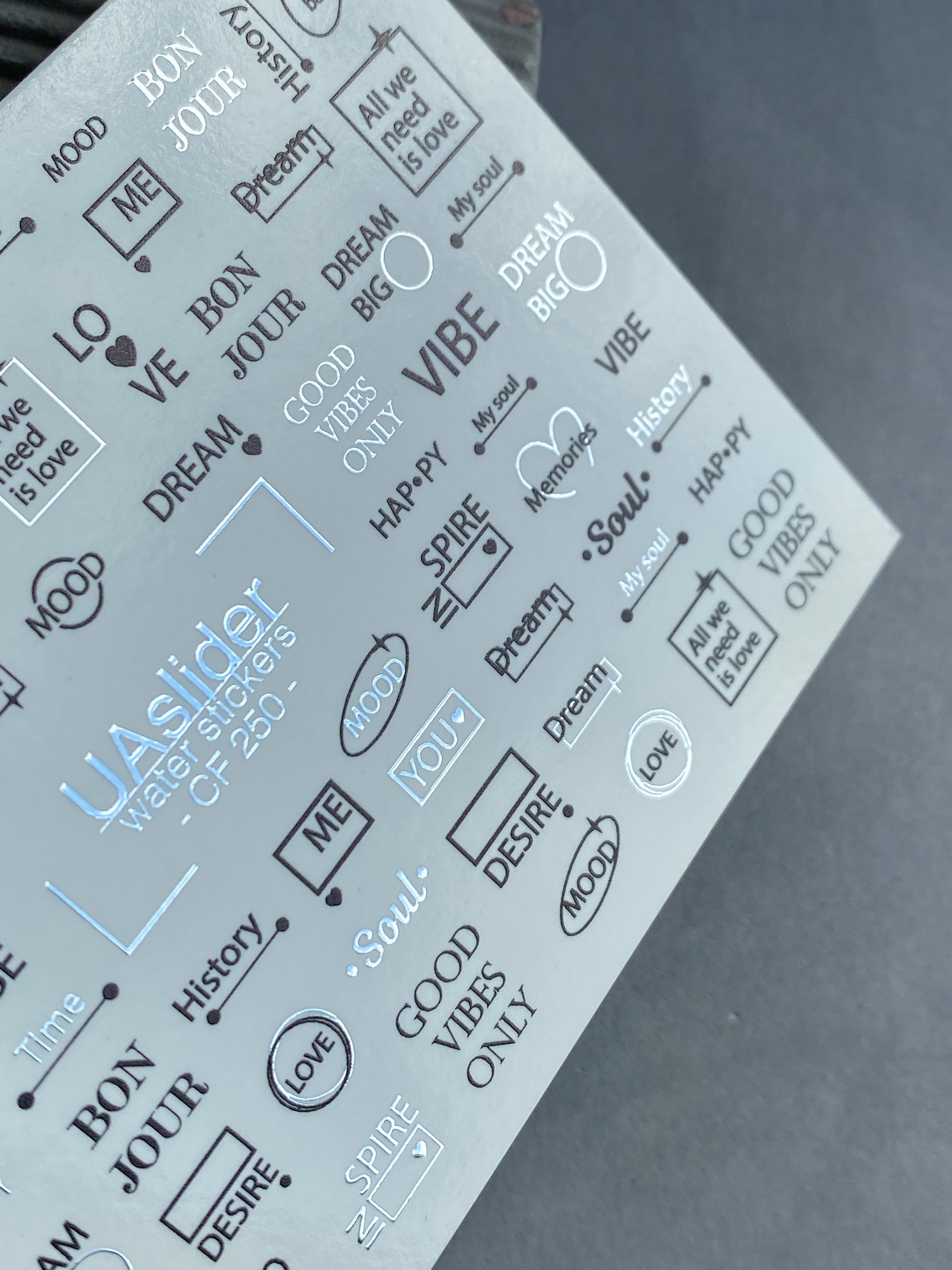 Nail Water Decal CF-250 | Minimalist Water Slide Nail Decals | Black & Silver Quotes and Words