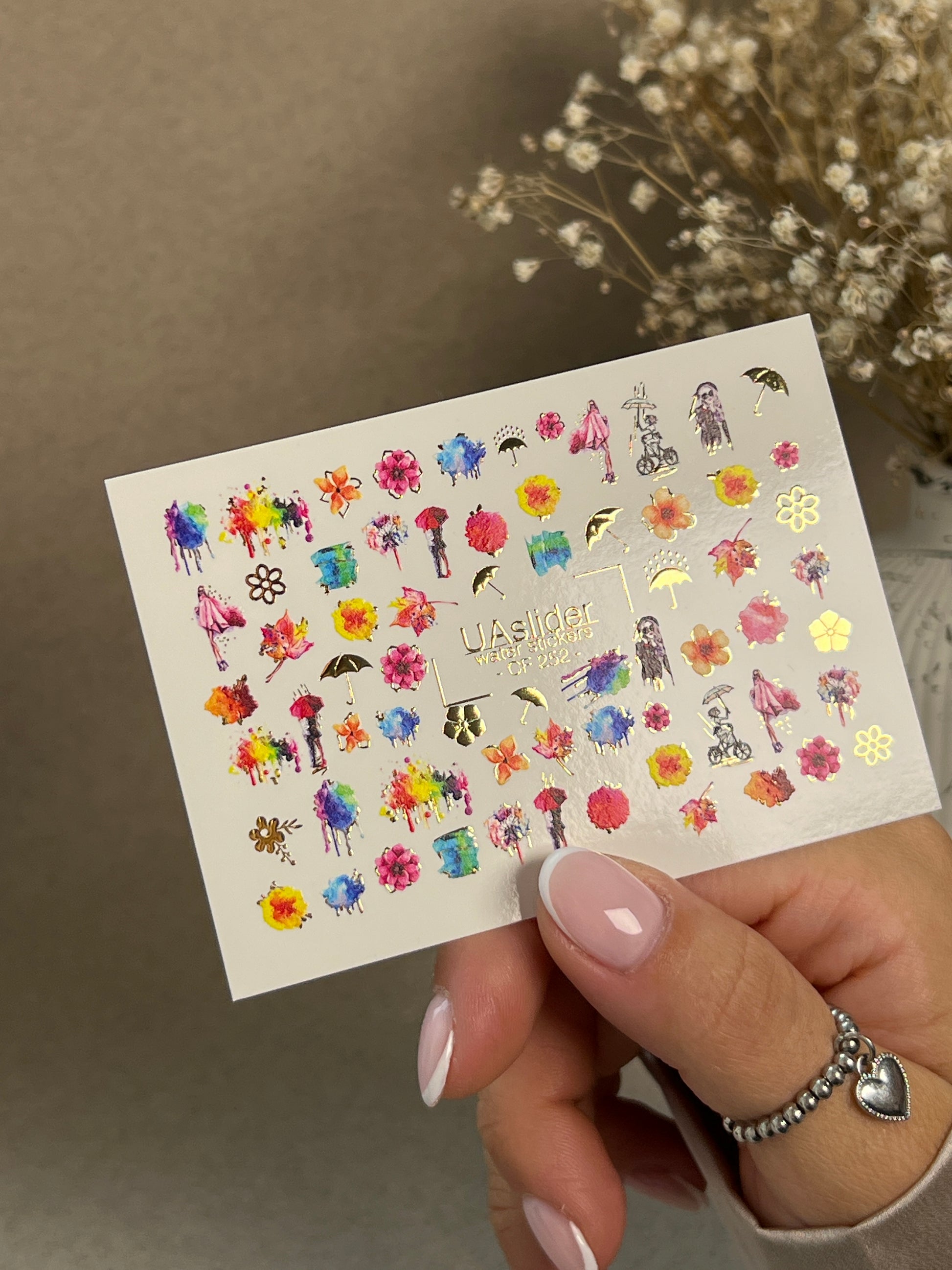 Watercolor water slide nail decals with vibrant flowers, artistic splashes, and charming rainy-day silhouettes. This set includes umbrellas, girls with coats, and colorful paint effects that bring a creative touch to any manicure.