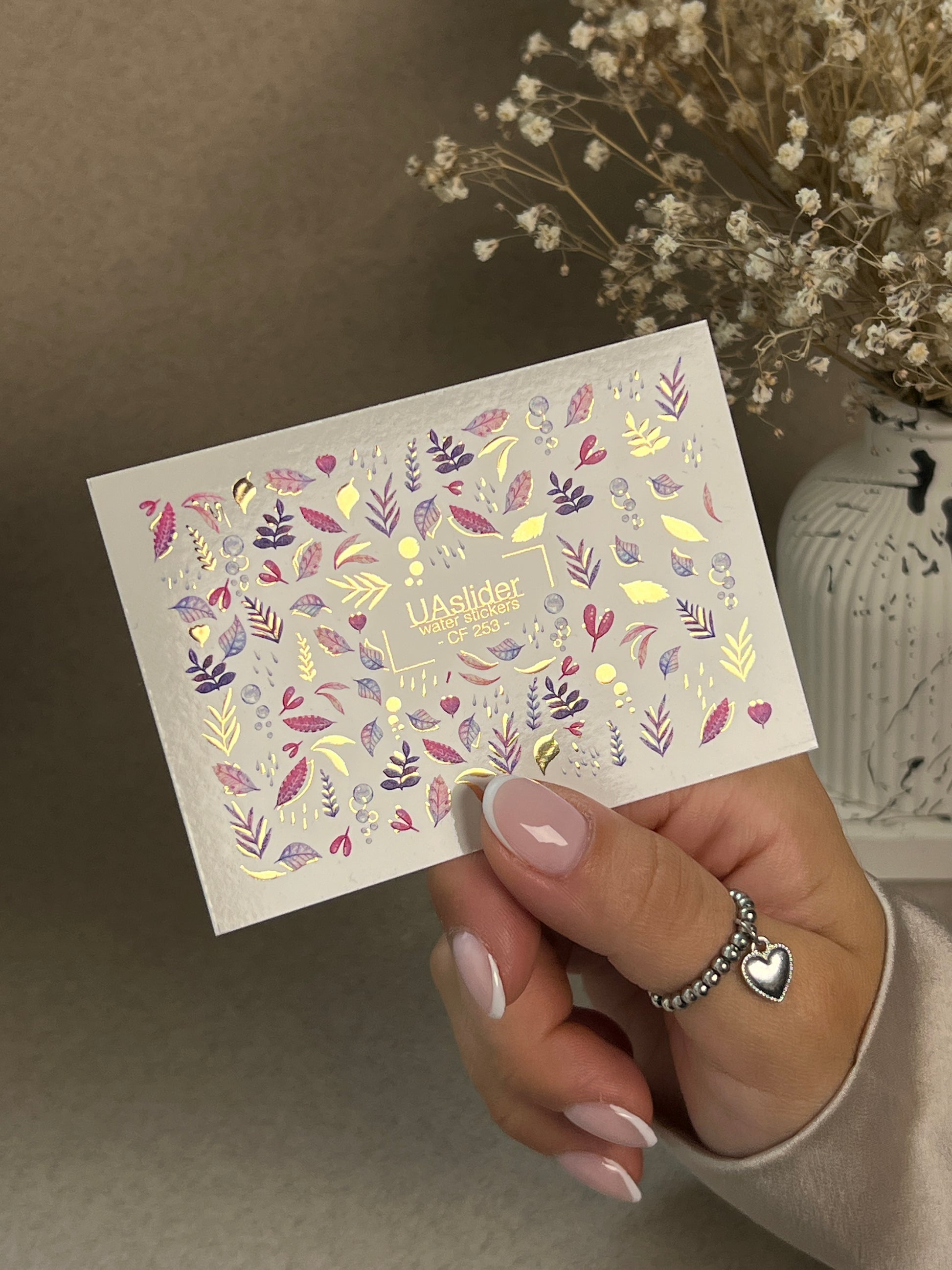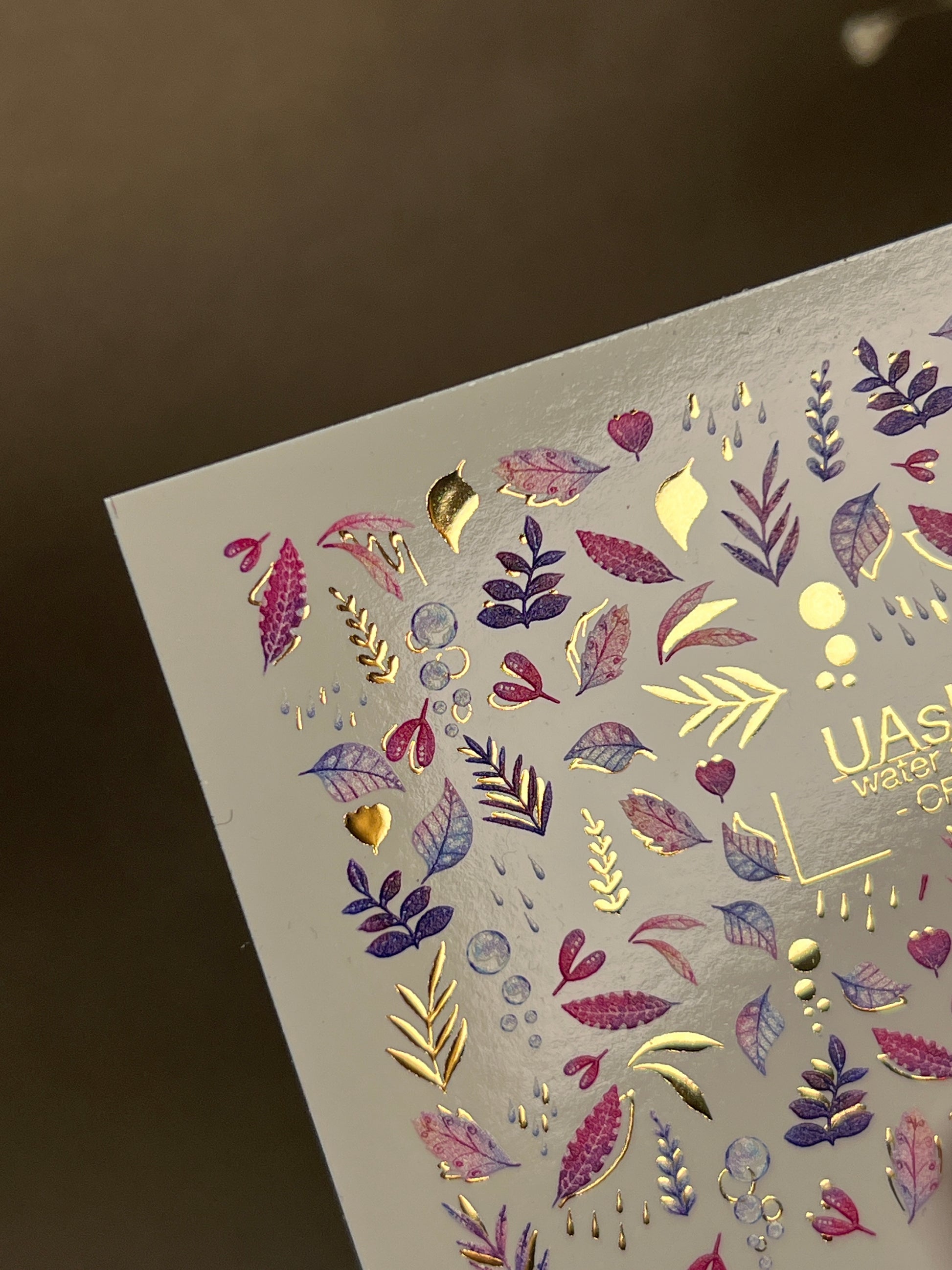 Botanical water slide nail decals featuring delicate pink and purple leaves with shimmering gold foil accents. Additional details like tiny droplets and natural elements add depth and elegance to the design.