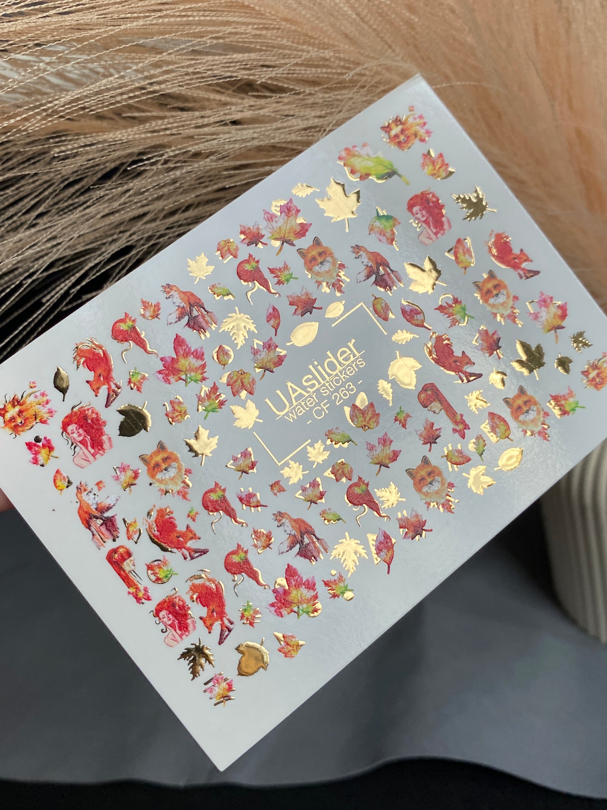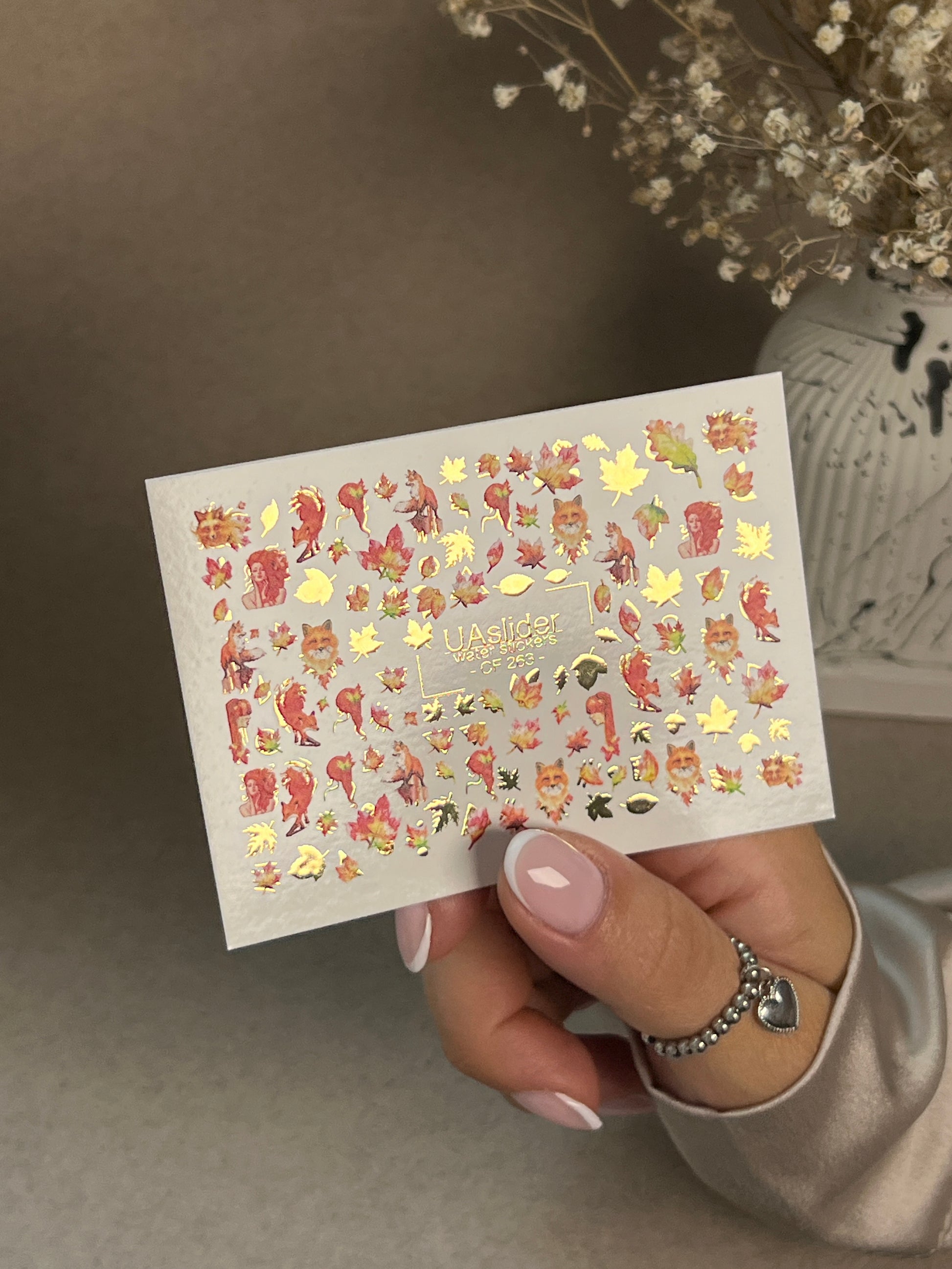Autumn water slide nail decals featuring cozy seasonal motifs — foxes, squirrels, mushrooms, and colorful fall leaves with shimmering gold foil accents. This playful set adds warmth and charm to any autumn manicure.