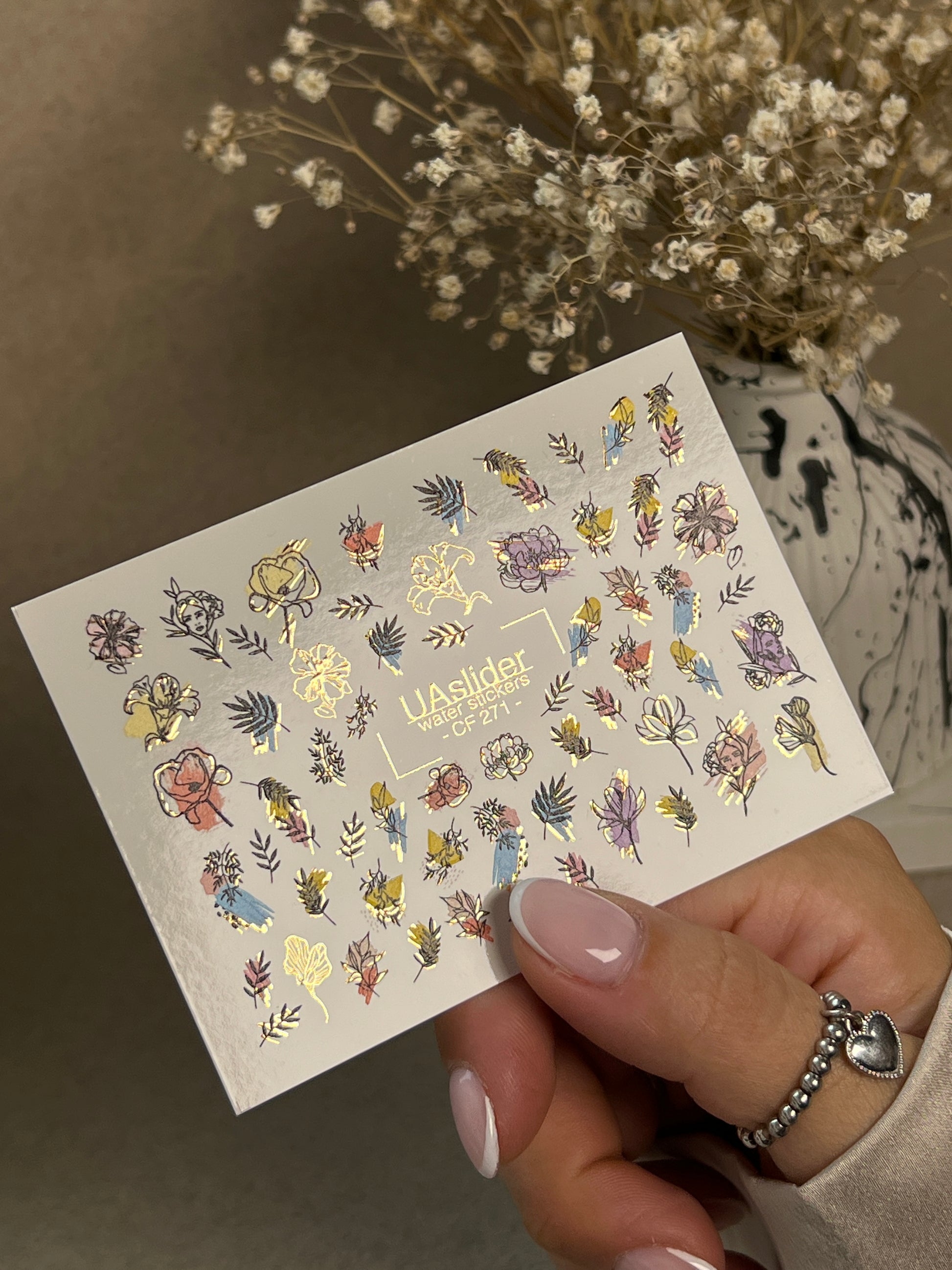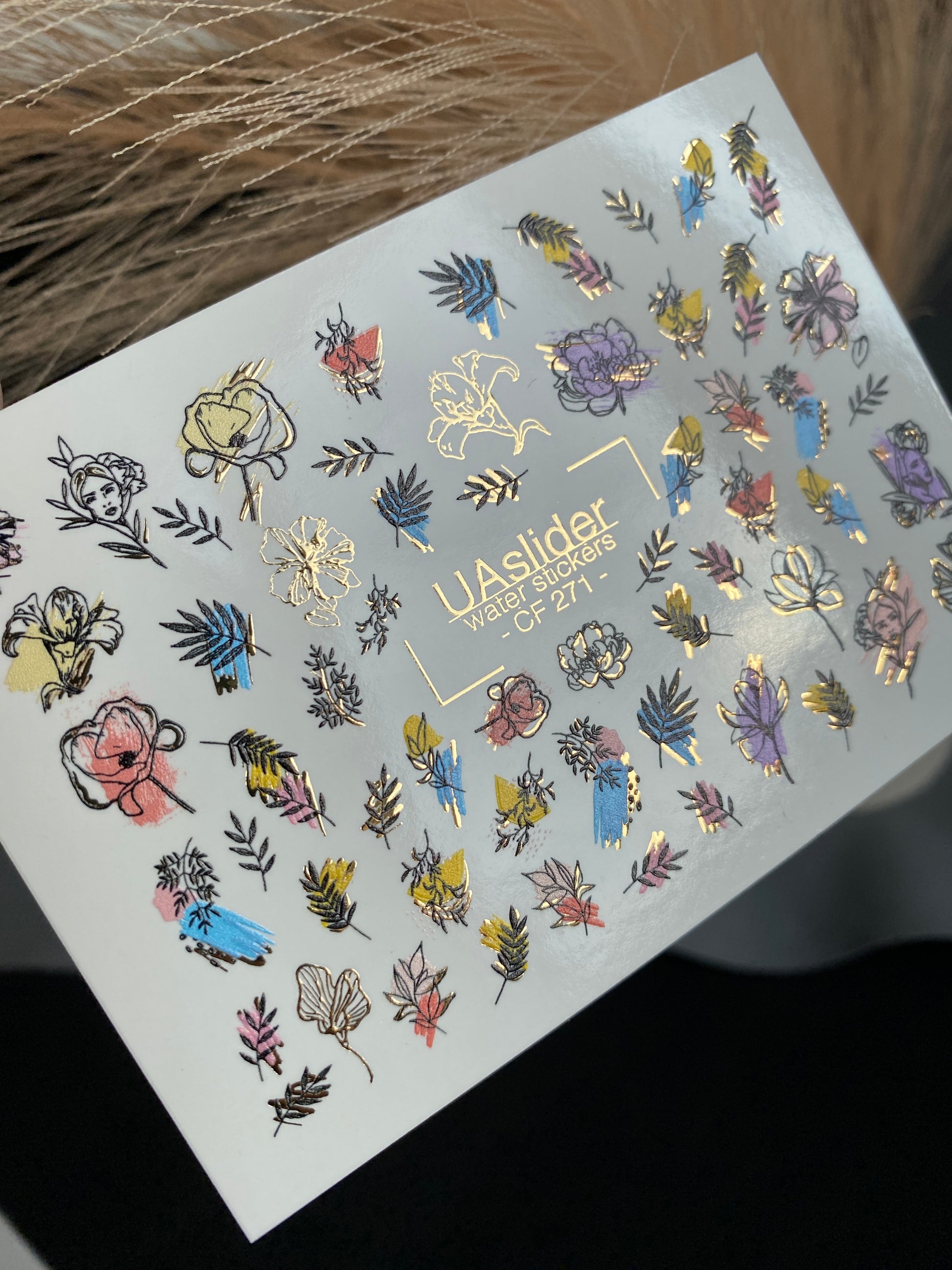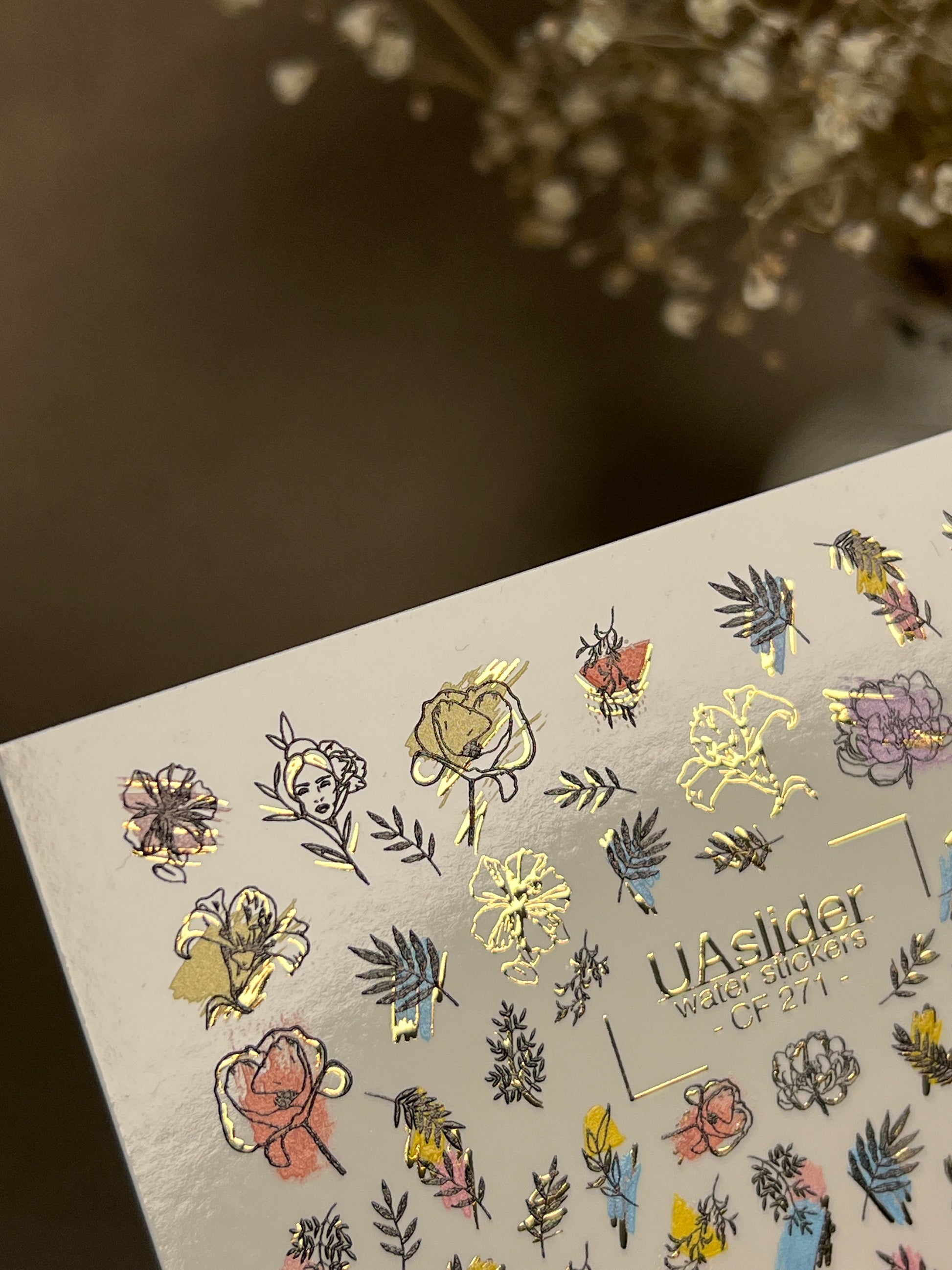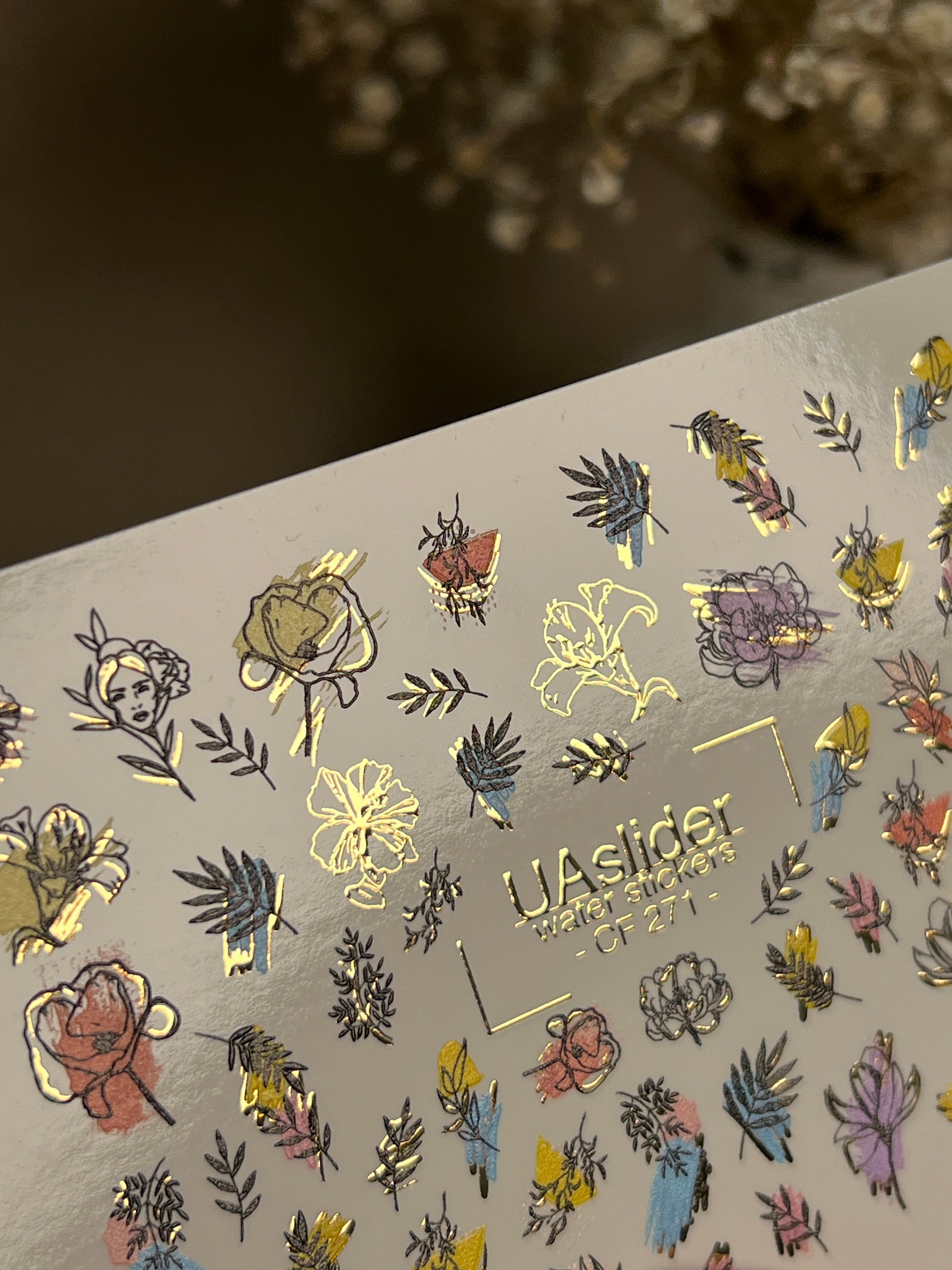 Nail Water Decal CF-271 | Floral Water Slide Nail Decals | Colorful Flowers & Gold Foil AccentsCF_271