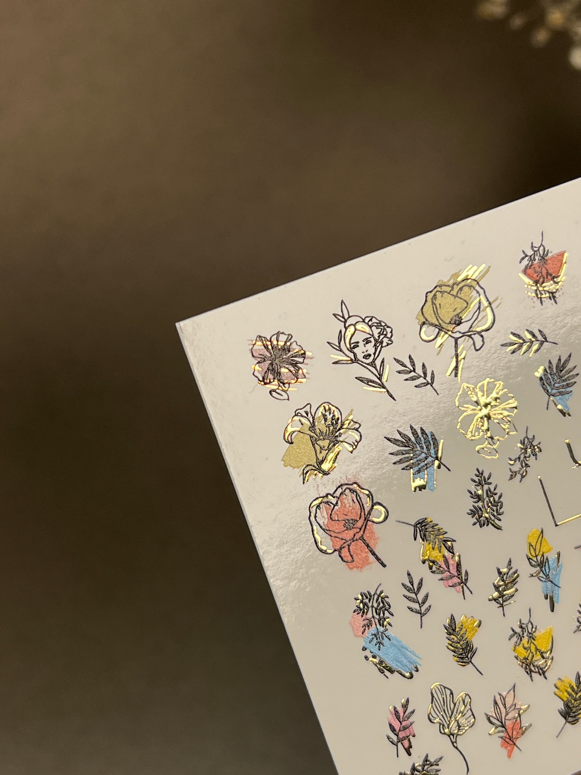 Floral water slide nail decals with delicate line-art flowers, colorful brushstroke accents, and shimmering gold foil details. A trendy botanical set that brings elegance and creativity to any manicure.