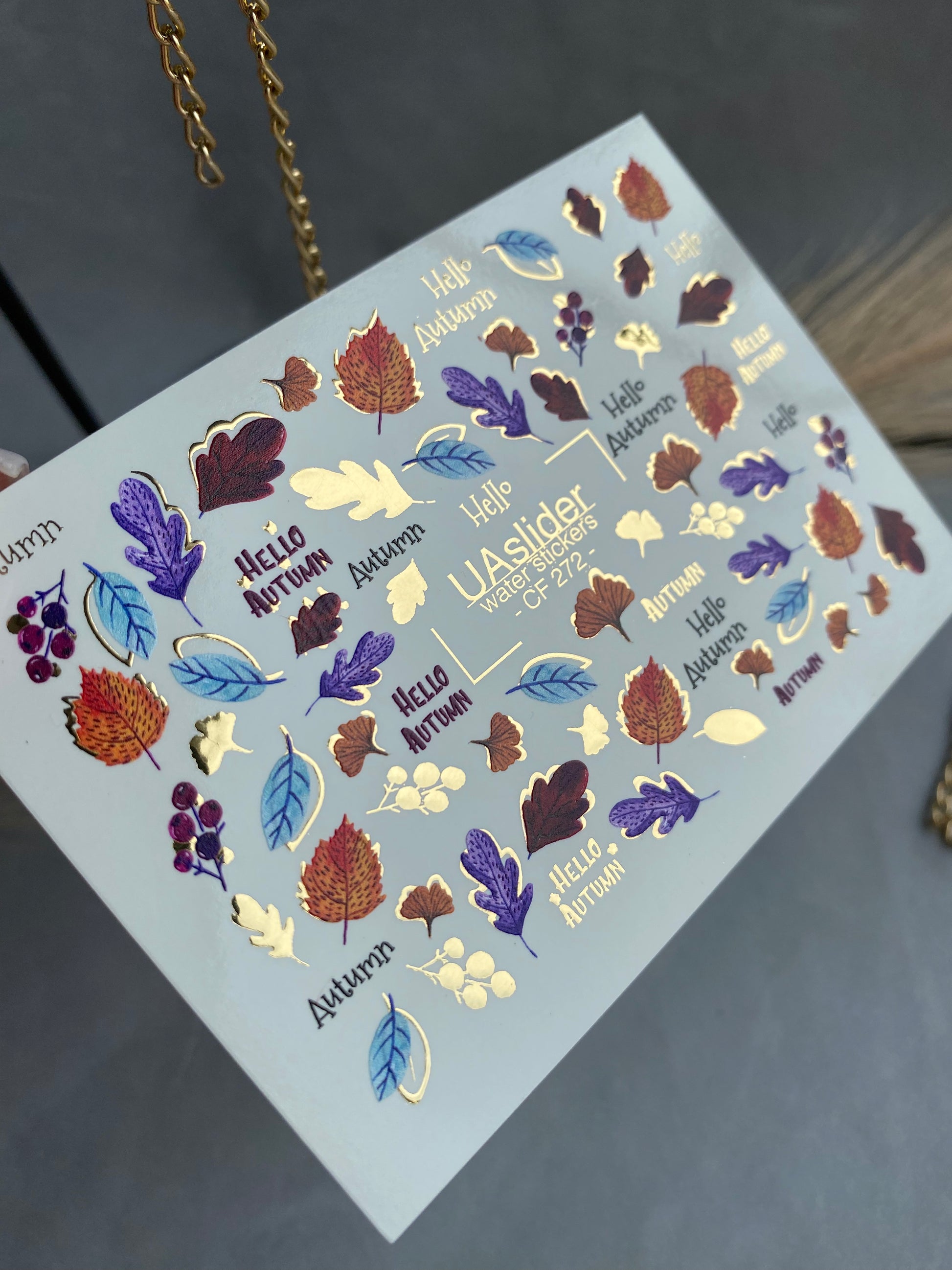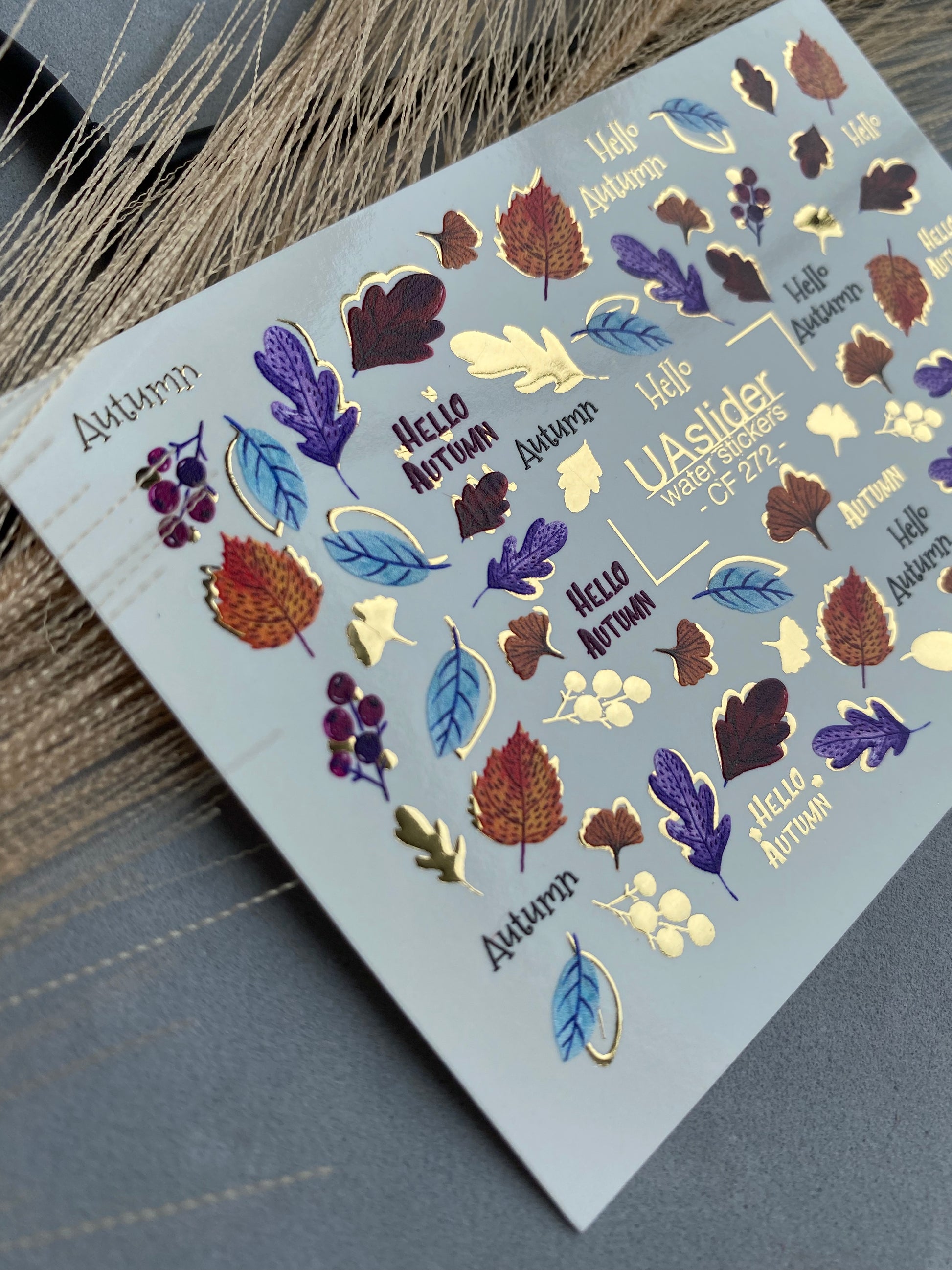 Autumn water slide nail decals with colorful fall leaves in red, yellow, purple, and blue, combined with shiny gold accents and seasonal quotes like Hello Autumn. A perfect set to capture the cozy charm of the season.