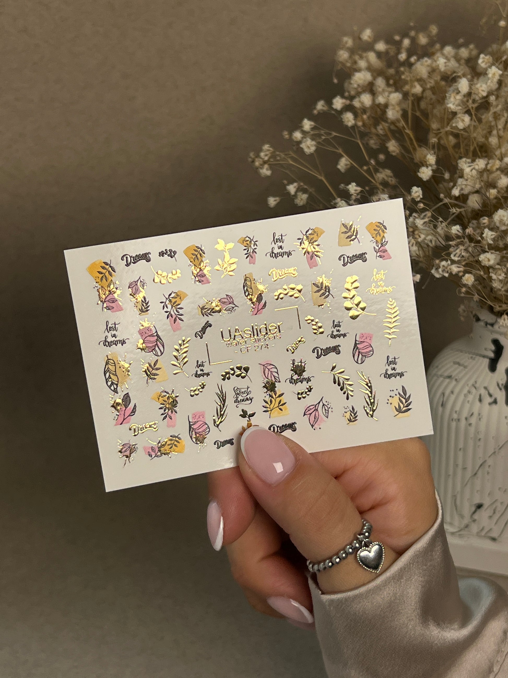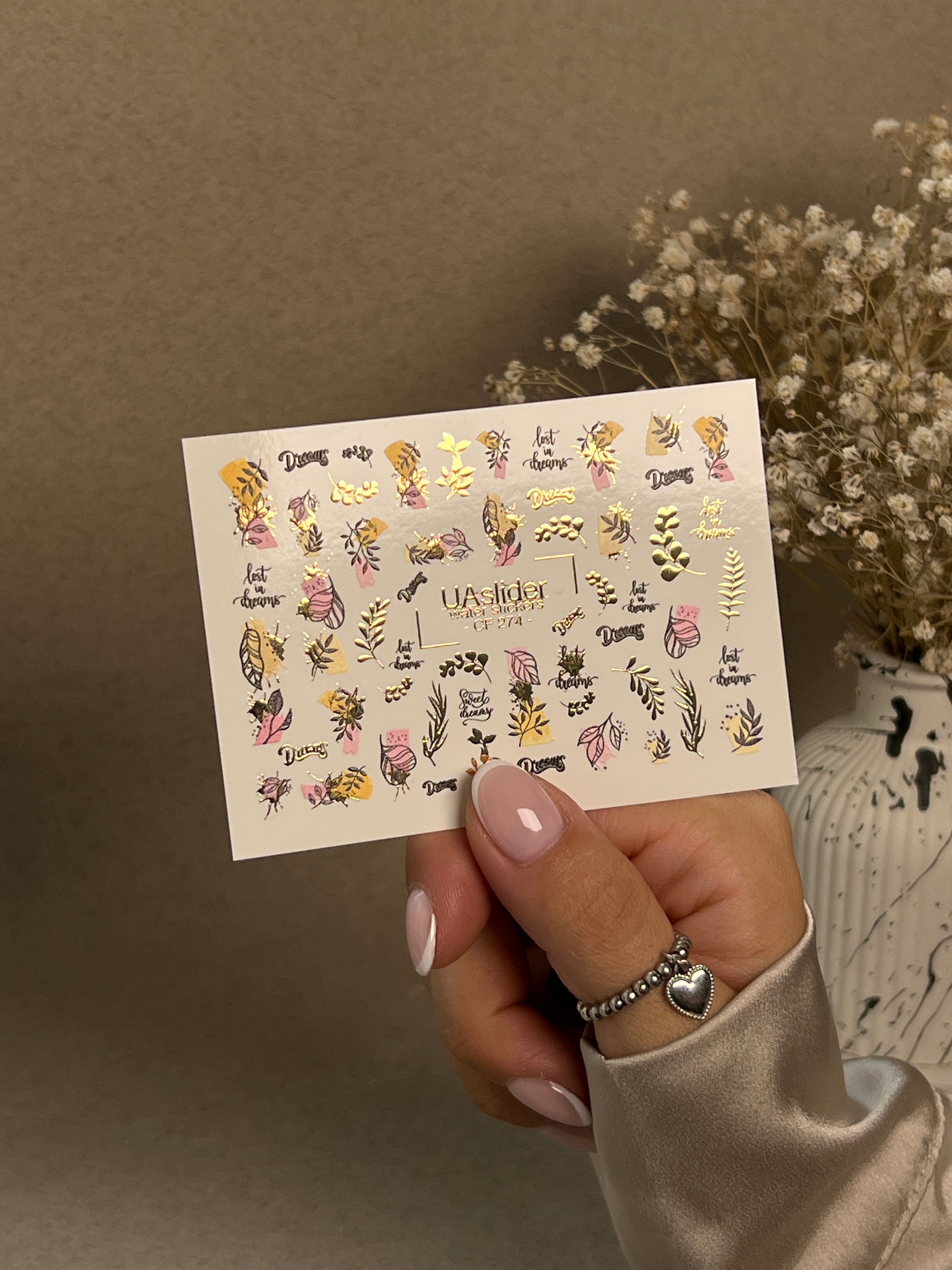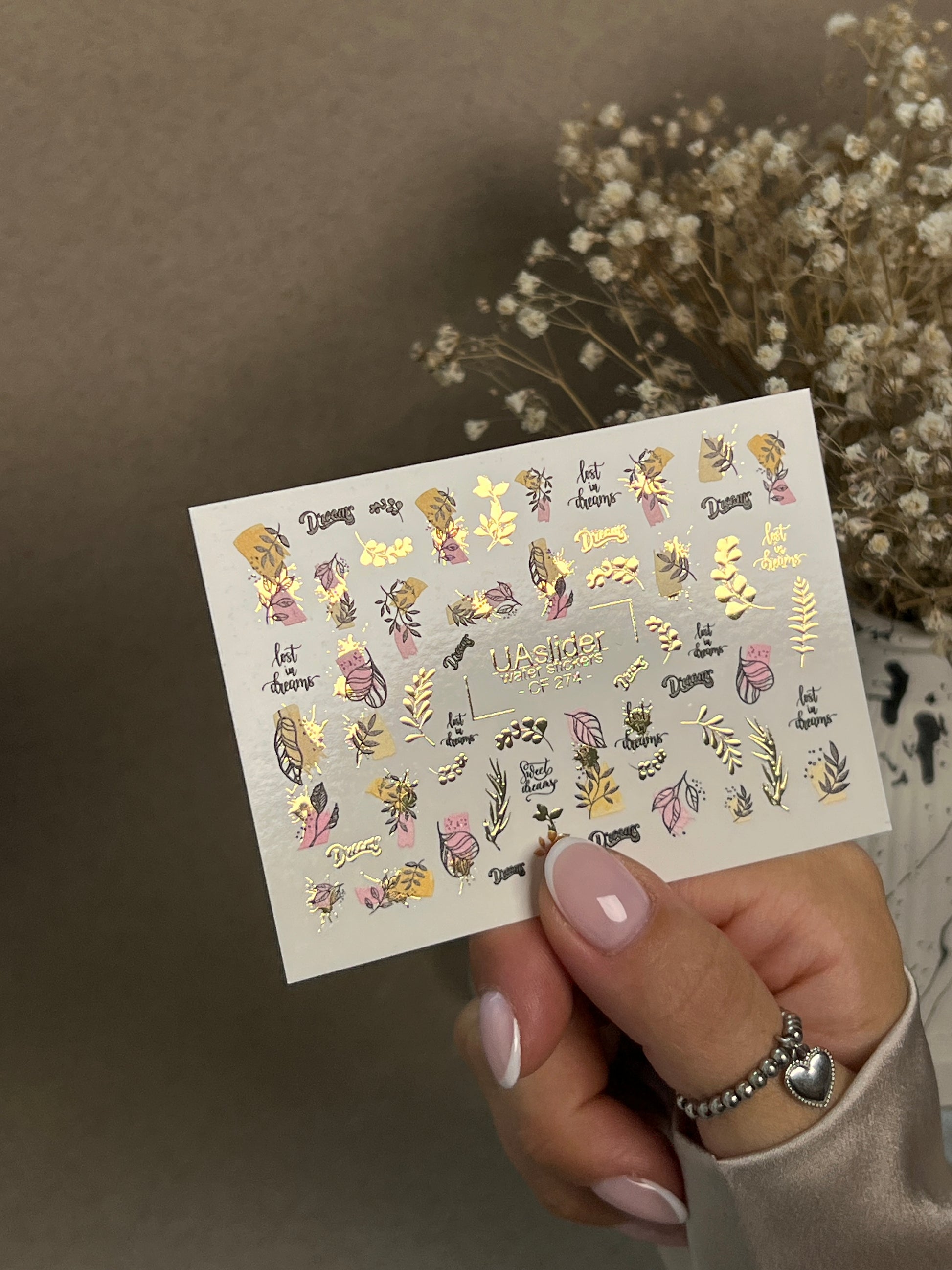 Botanical water slide nail decals featuring delicate leaves with pink and yellow brushstroke accents, highlighted by shimmering gold foil. Includes creative lettering such as Dreams and Lost in dreams for an artistic touch.