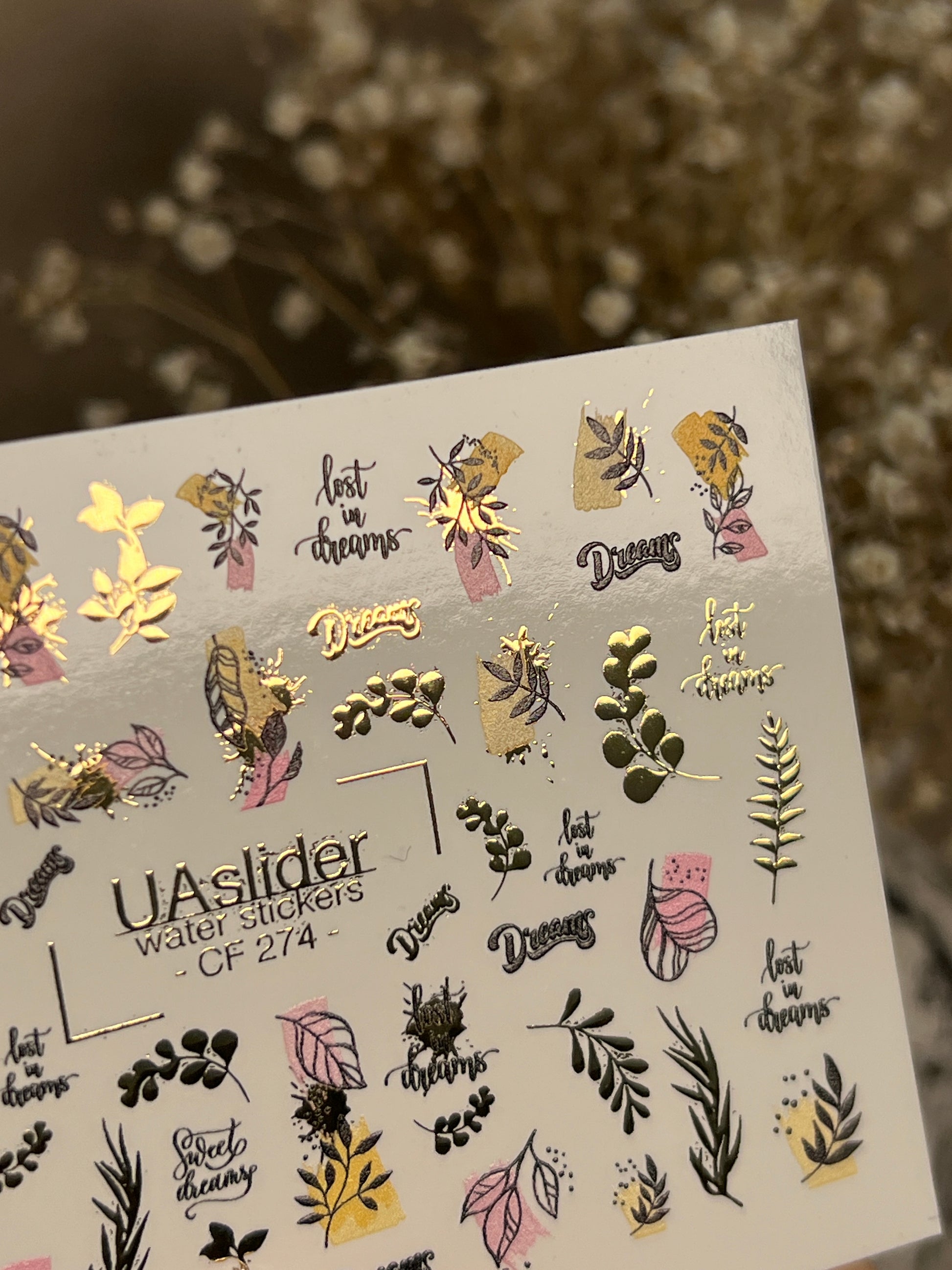 Nail Water Decal CF-274 | Botanical Water Slide Nail Decals | Leaves, Gold Accents & Dream QuotesCF_274