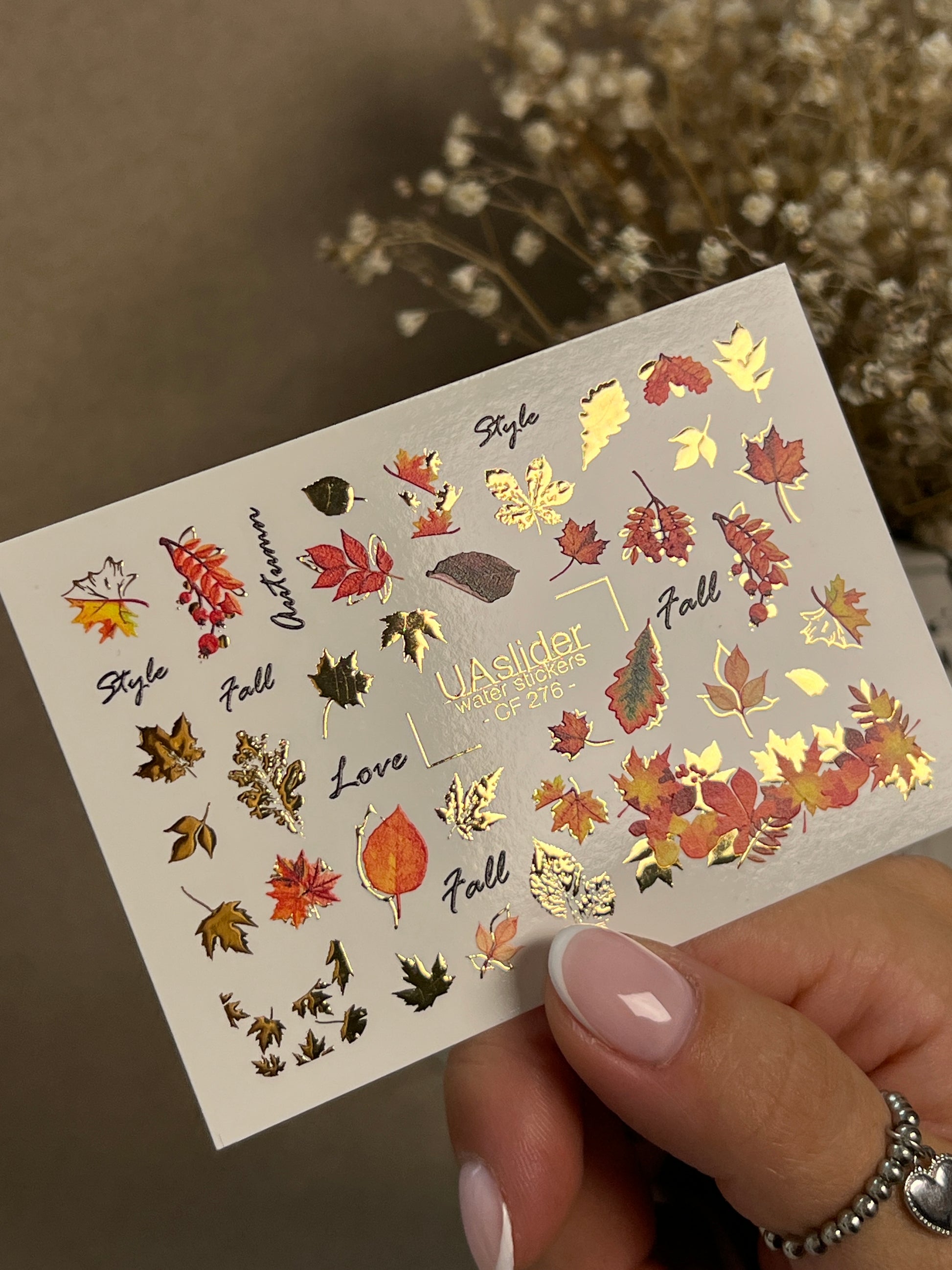 Autumn water slide nail decals with vibrant fall leaves, red and orange tones, shimmering gold foil details, and seasonal quotes like Fall, Love, Style, and Autumn. A cozy and elegant set to complete your autumn manicure.