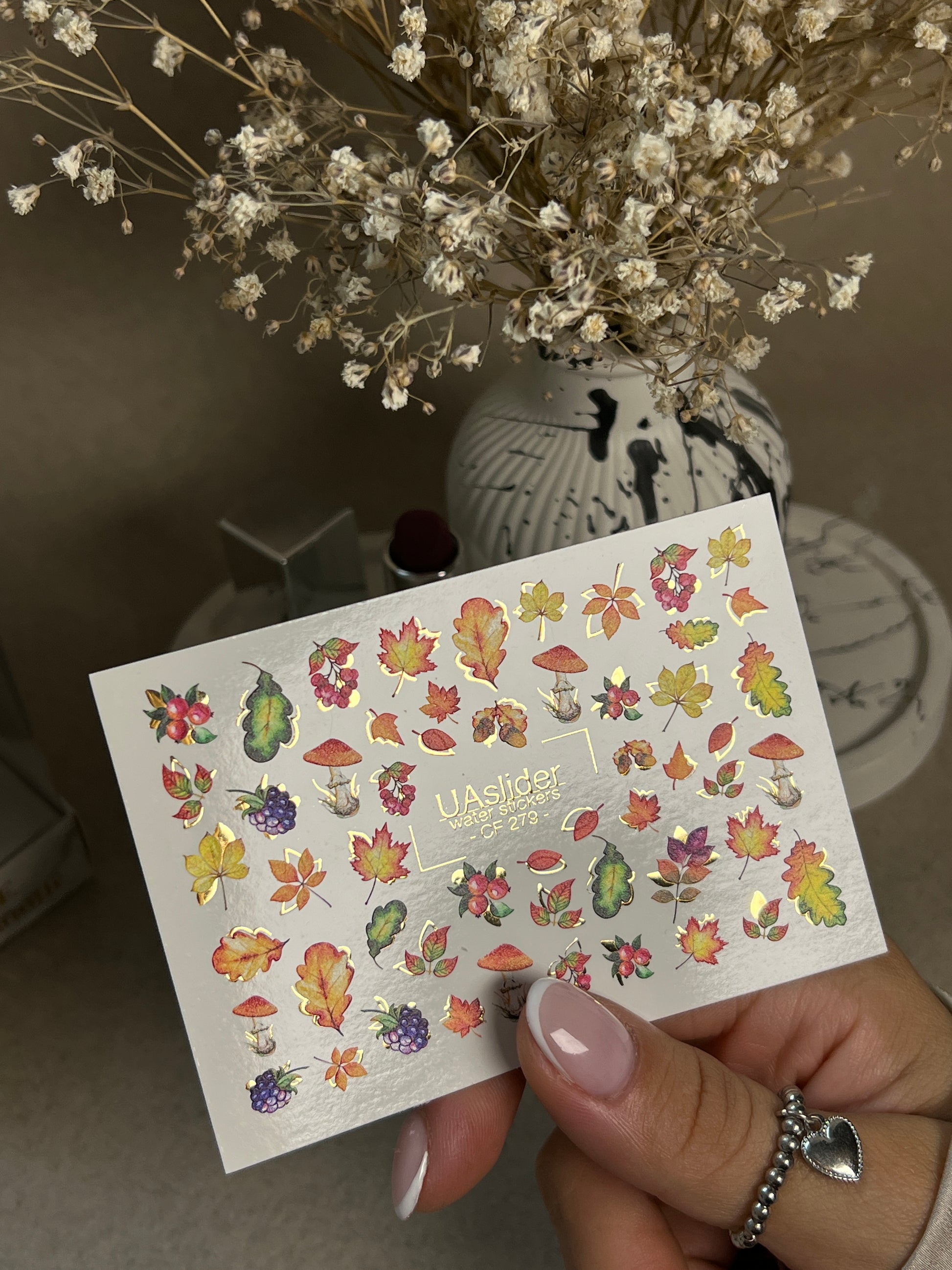 Nail Water Decal CF-279 | Autumn Water Slide Nail Decals | Fall Leaves, Mushrooms & Berries with Gold Accents