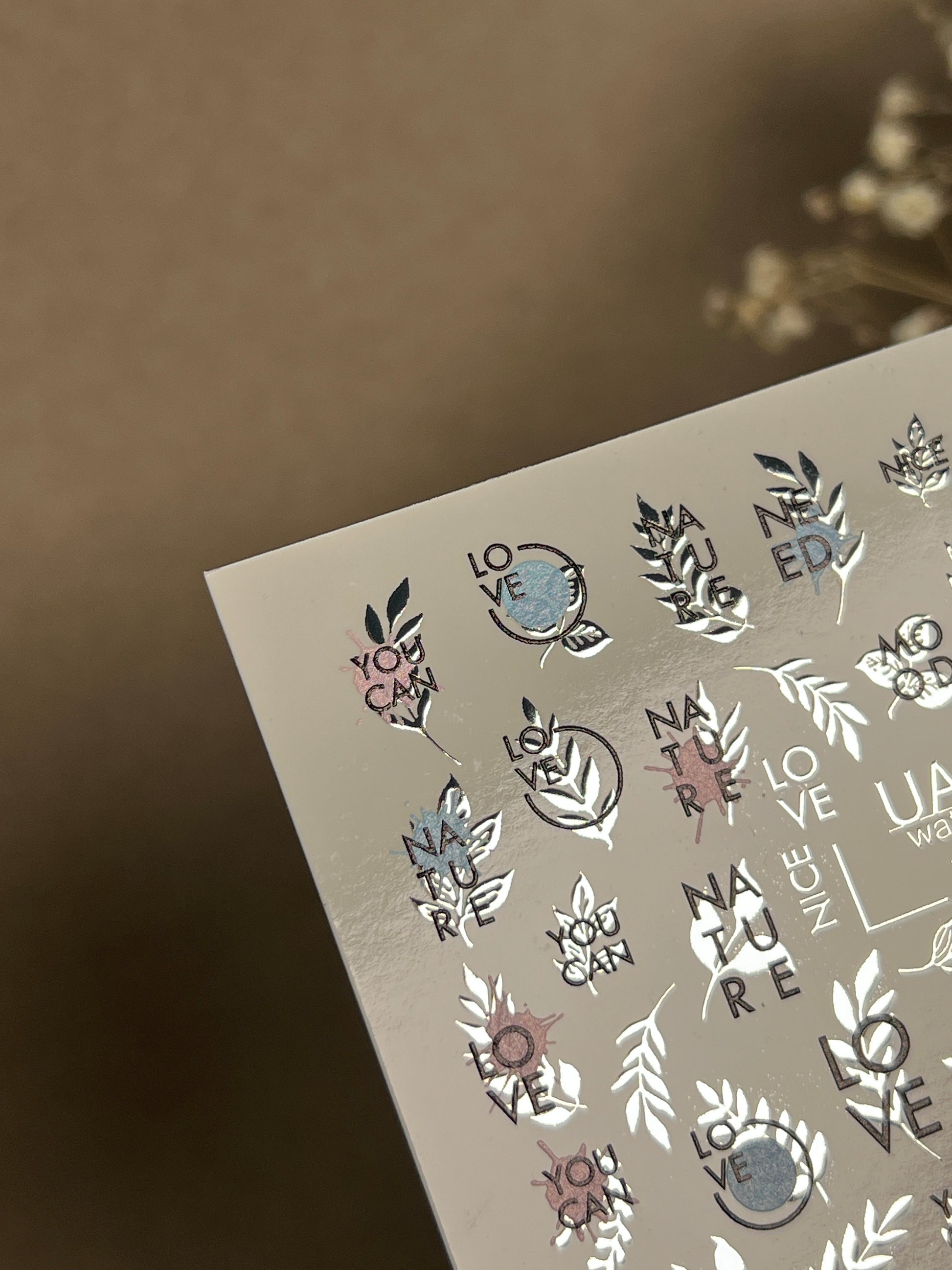 rendy minimalist water slide nail decals with stylish quotes and words like LOVE, NATURE, MOOD, YOU CAN, and BE NICE. Accented with delicate branches, leaves, and subtle pastel highlights for modern nail art.