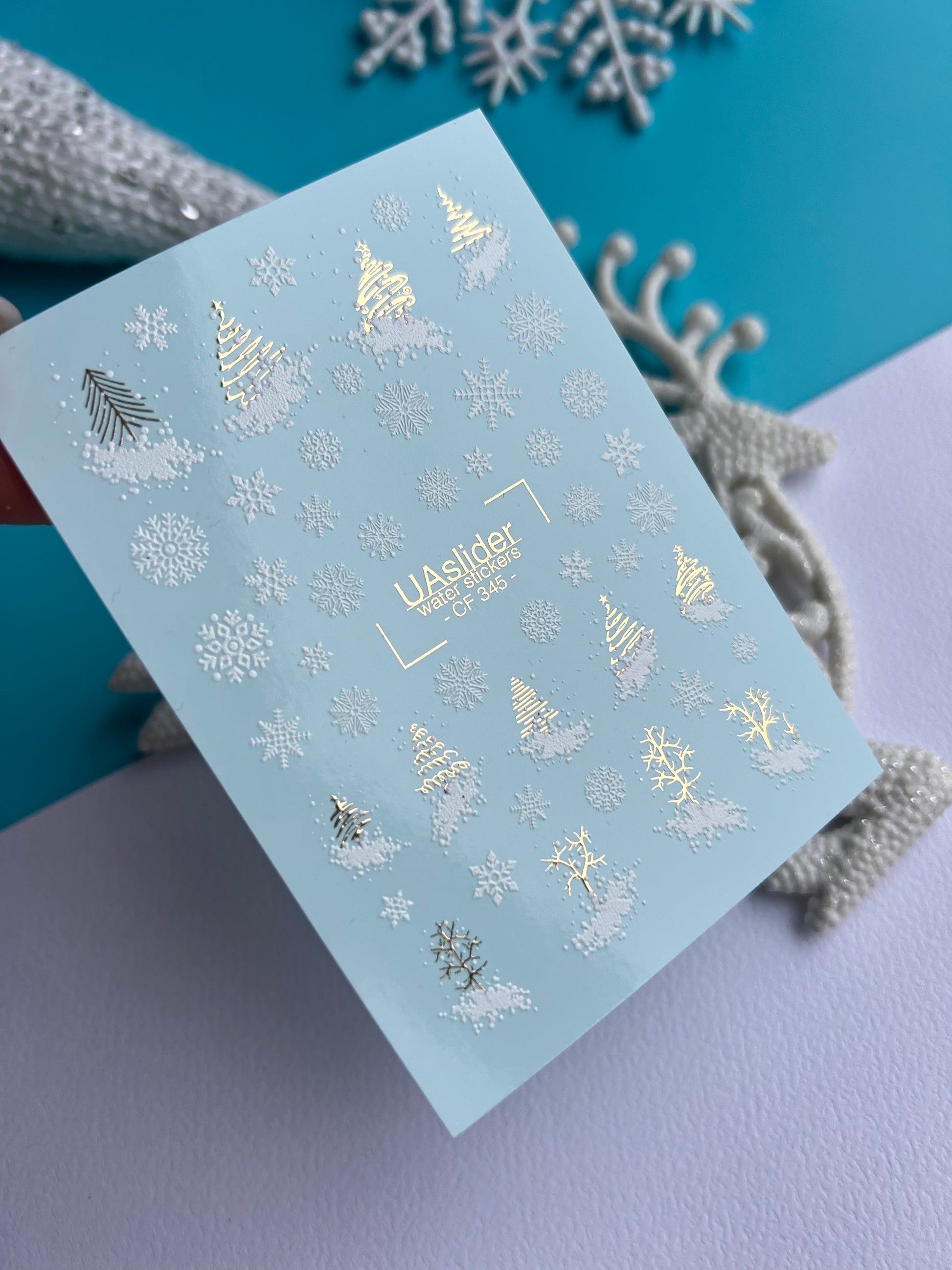 Nail Water Decal CF-345 | Water Slide Nail Decals | Christmas Trees & Snowflakes in Gold and WhiteCF_345