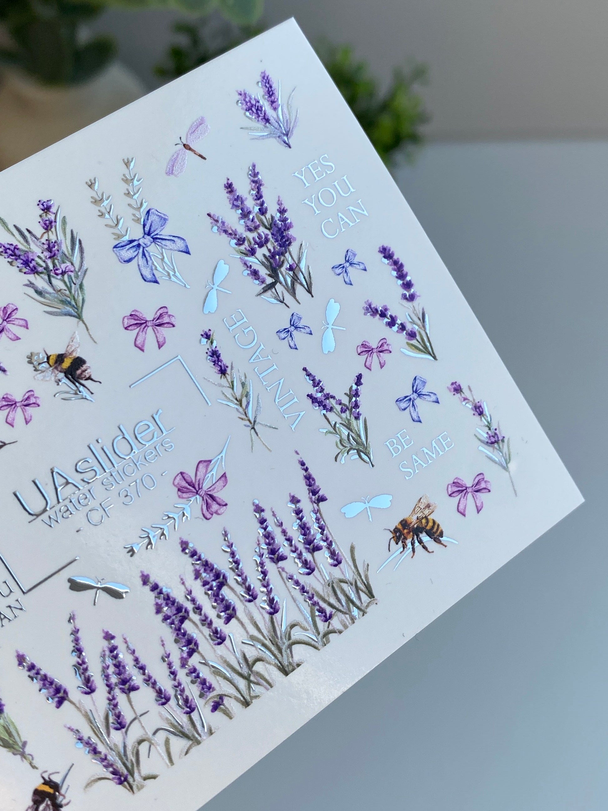 Romantic water slide nail decals with lavender branches, bees, butterflies, and dragonflies. Includes motivational and vintage-style quotes (Yes you can, Be same, Vintage). Perfect for nature-inspired, delicate, and floral nail art.