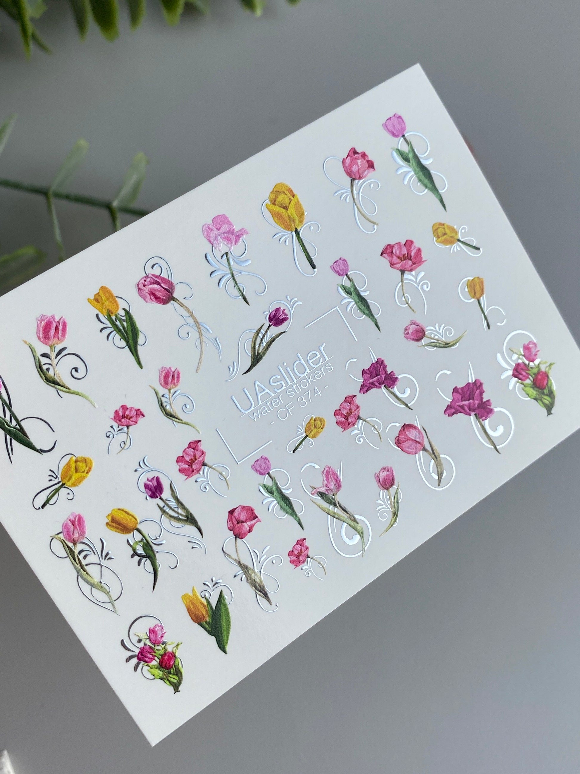 Tulip water slide nail decals with bright spring florals in pink, yellow, and red shades, complemented by elegant ornamental swirls. These nail water decals are water-activated — simply soak to apply. Cut out the selected design before soaking; for convenience, warm water may be used during application. Perfect for fresh spring manicures, floral nail art, and salon-quality designs. Suitable for gel and acrylic nails.