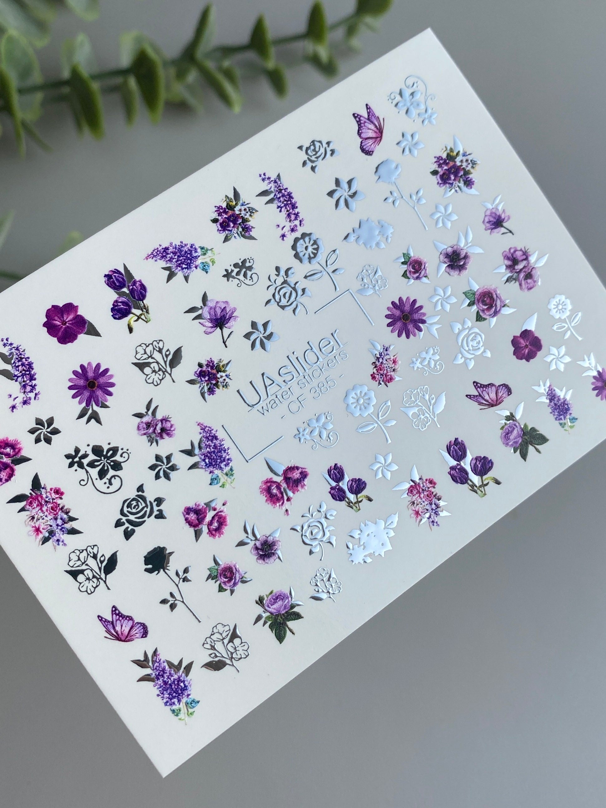 Purple floral water slide nail decals with roses, lavender, tulips, and asters, accented by butterflies and delicate floral details. These nail water decals are water-activated — simply soak to apply. Cut out the chosen design before soaking; for convenience, warm water may be used during application. Perfect for elegant floral manicures, romantic looks, and salon-quality nail art. Suitable for gel and acrylic nails.