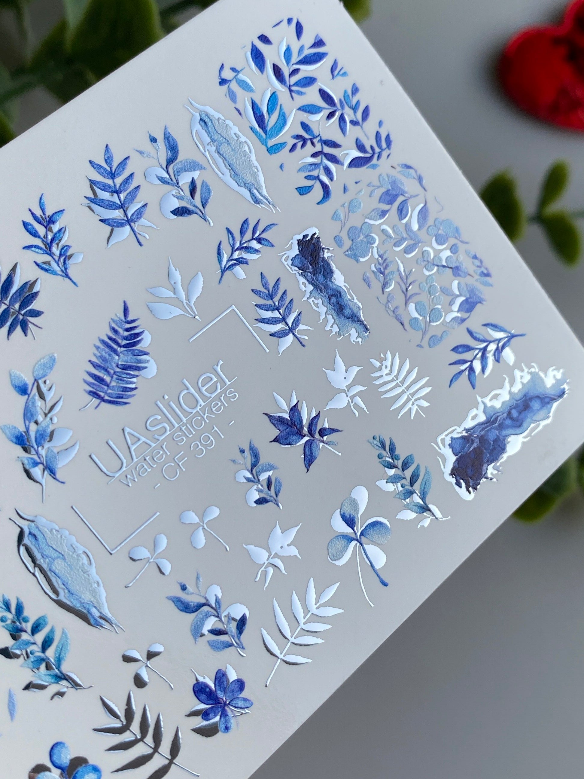 Blue leaf water slide nail decals featuring botanical branches, leaves, and natural elements in cool blue and violet shades. These nail water decals are water-activated — simply soak to apply. Cut out the chosen design before soaking; for convenience, warm water may be used during application. Perfect for minimalist manicures, botanical nail art, and salon-quality designs. Suitable for gel and acrylic nails.