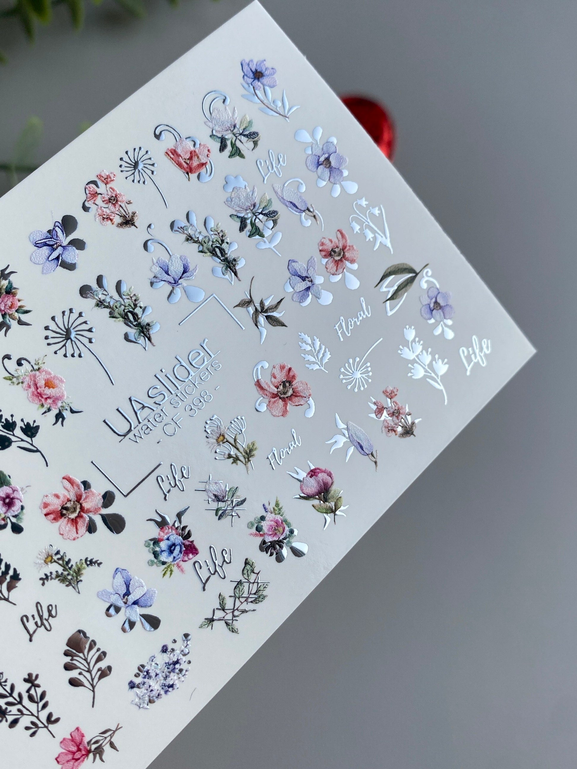 Colorful floral water slide nail decals with roses, wildflowers, and botanical sprigs in pink, blue, violet, and red shades, accented with lettering such as Life and Floral. These nail water decals are water-activated — simply soak to apply. Cut out the chosen design before soaking; for convenience, warm water may be used during application. Perfect for botanical manicures, romantic nail art, and salon-quality floral designs. Suitable for gel and acrylic nails.