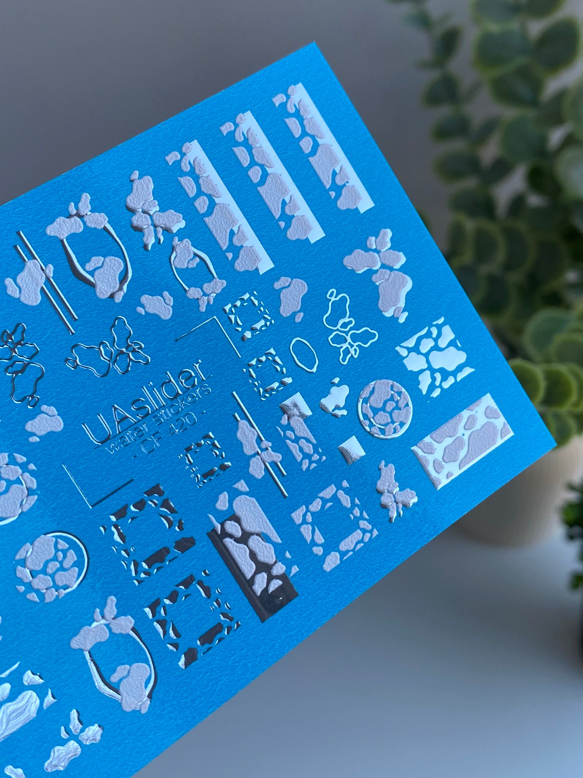 These water slide nail decals are water-activated — simply soak to apply. Cut out the chosen element before soaking; for easier application you may use warm water. Each design applies smoothly onto the nail surface. Perfect for gel and acrylic nails.
