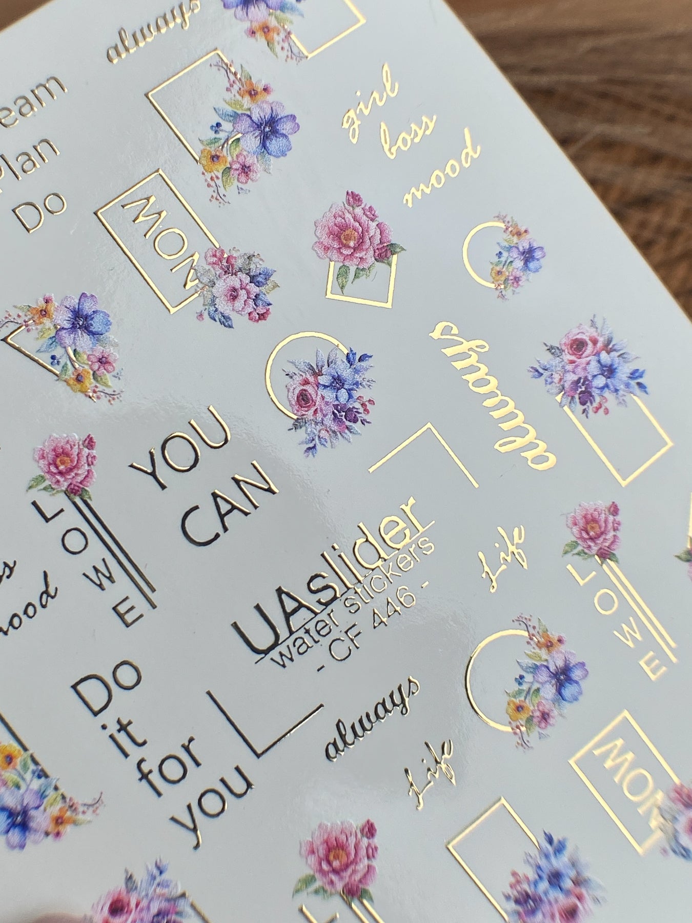 Nail Water Decal CF-446 | Water Slide Nail Decals | Mini Floral Elements & Gold Lettering