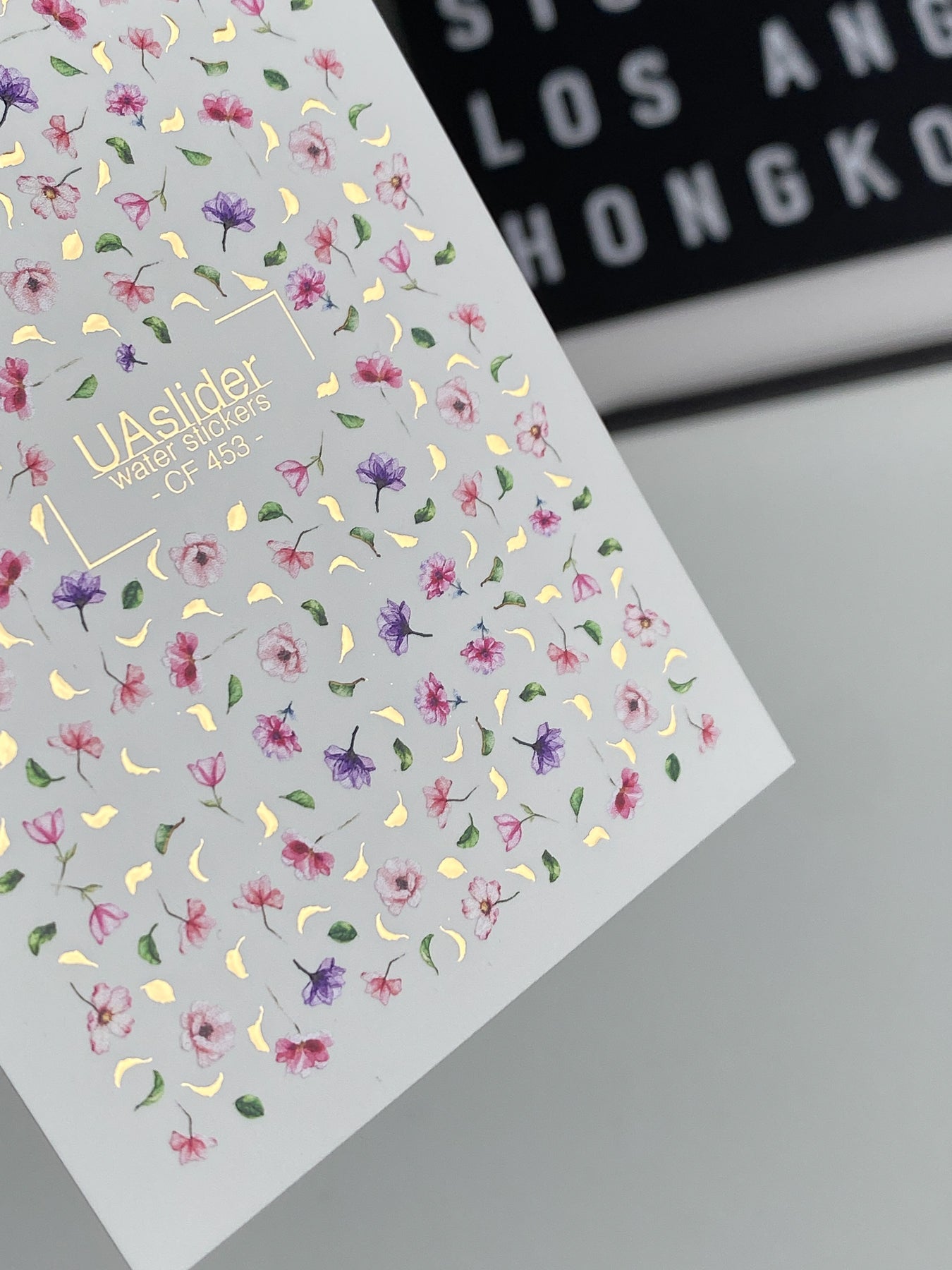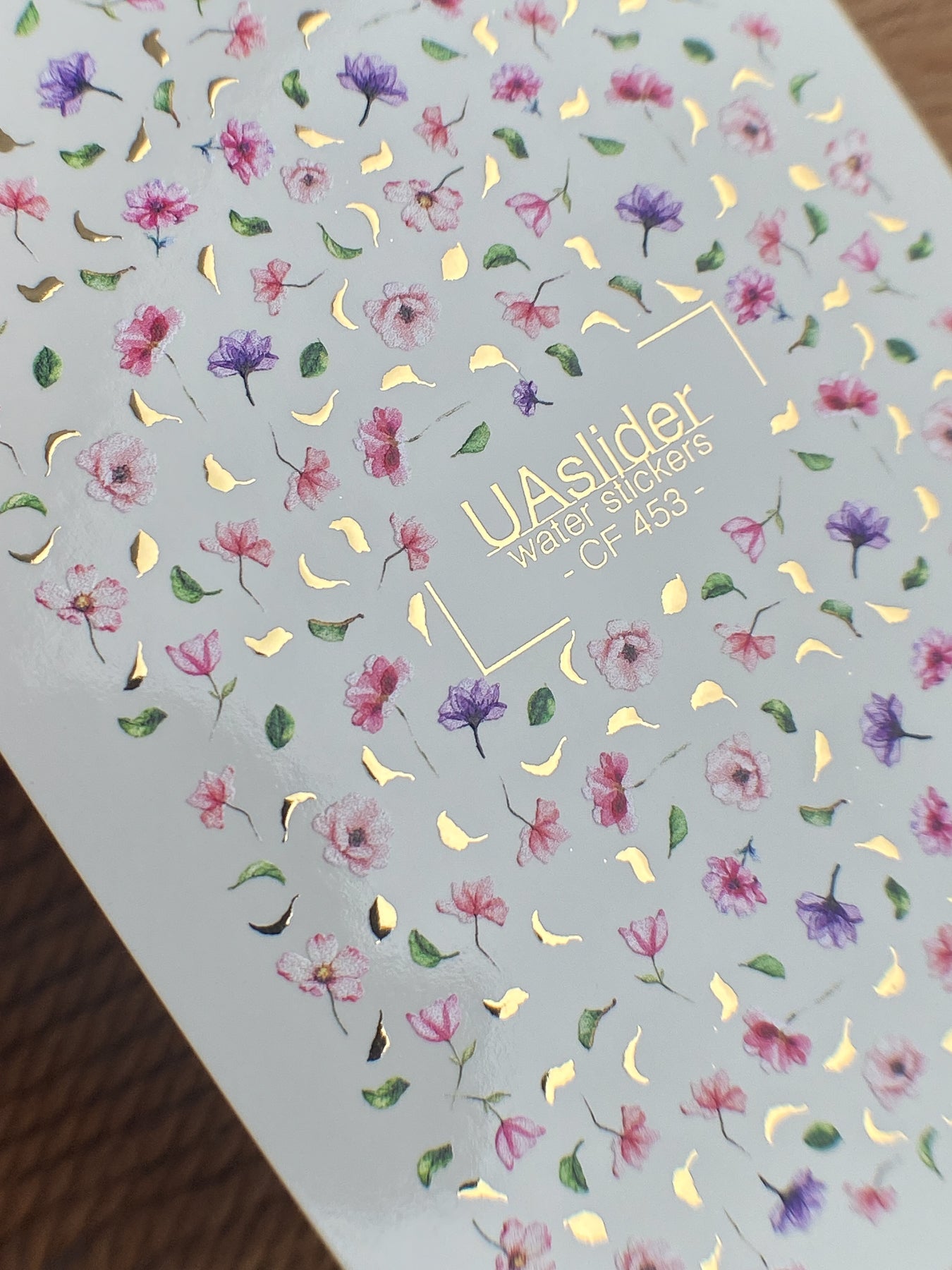 Floral water slide nail decals with delicate tiny flowers in pink and purple shades, accented with golden details and soft green leaves. These nail water decals are water-activated — simply soak to apply. Each motif releases in water and transfers smoothly onto the nail surface.