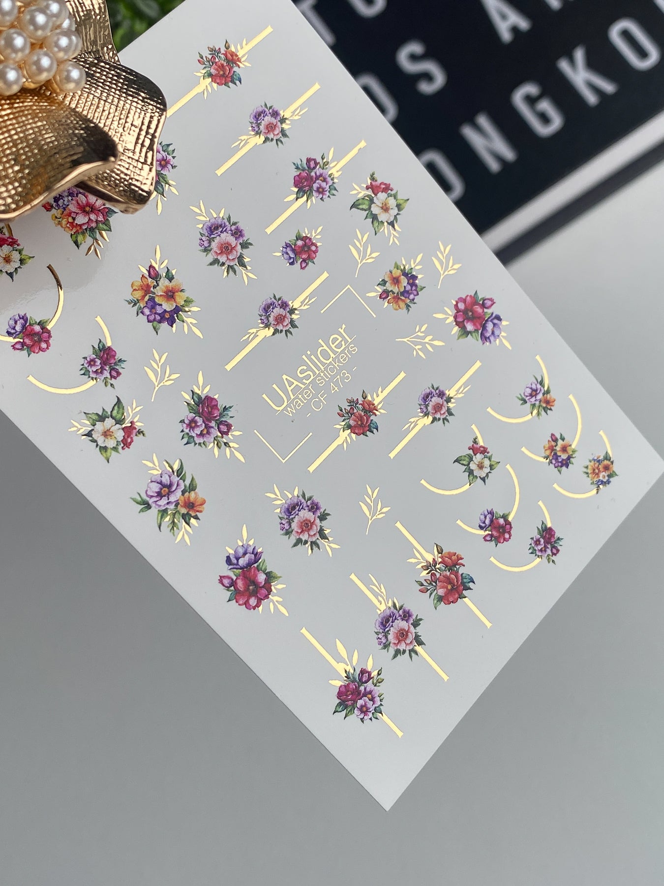 Nail Water Decal CF-473 | Floral Nail Decals | Colorful Flower Stickers with Gold Lines