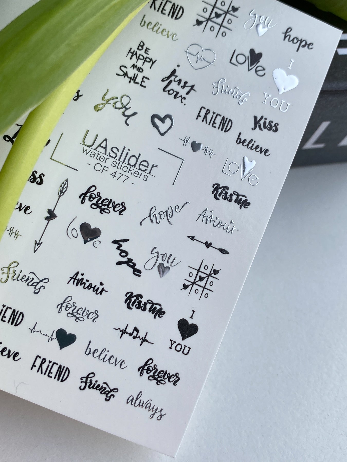 Stylish silver nail water decals featuring romantic quotes, hearts, and minimal graphic accents. Includes words like Love, Kiss, Hope, Believe, Friend, Forever and delicate illustrations to elevate your manicure.
