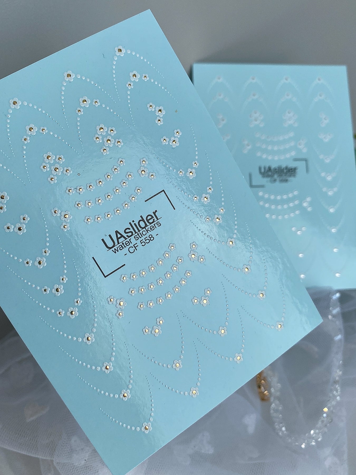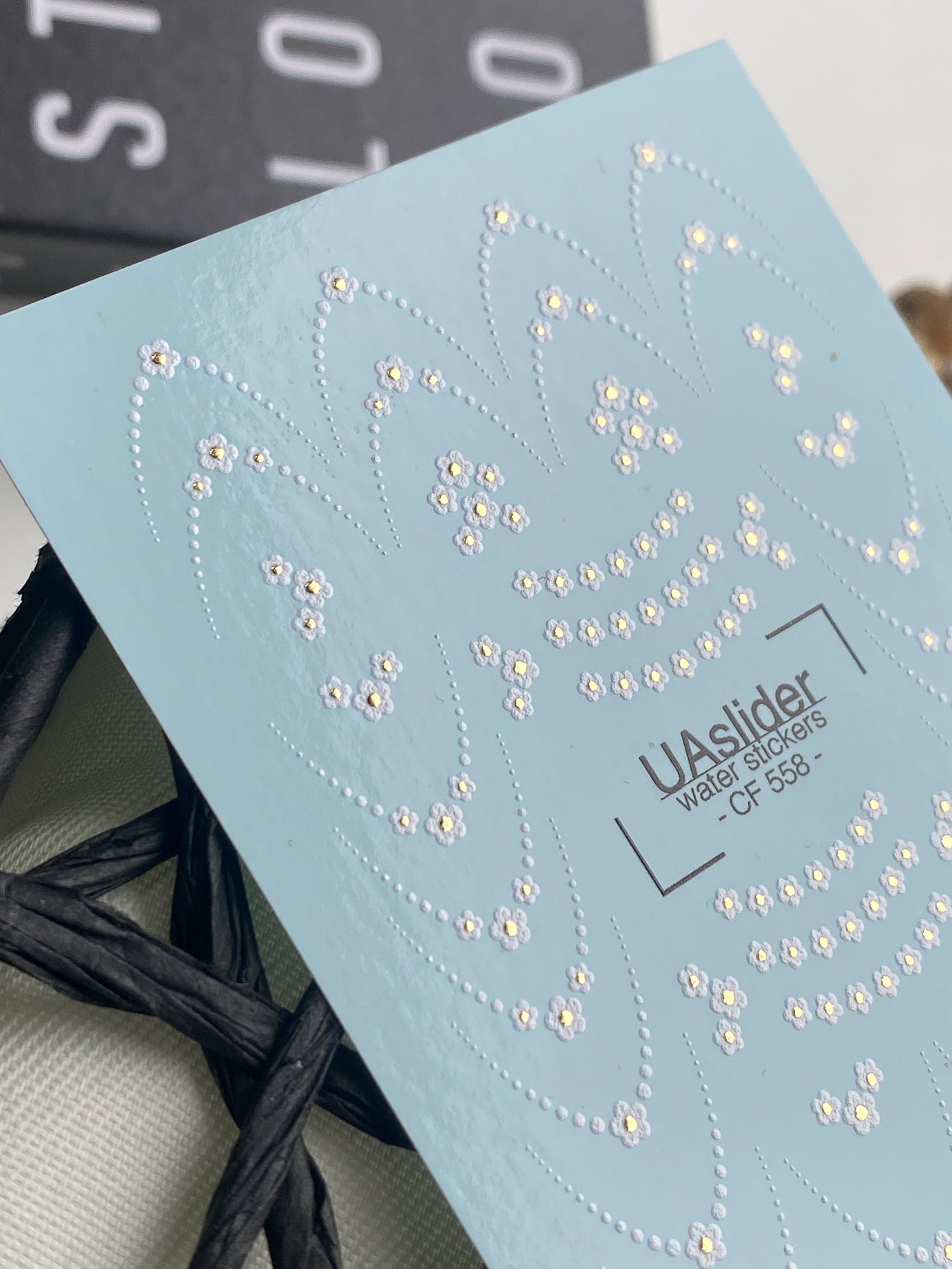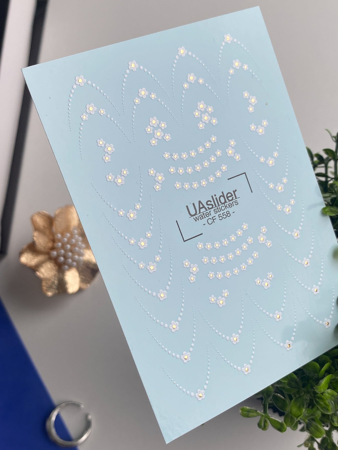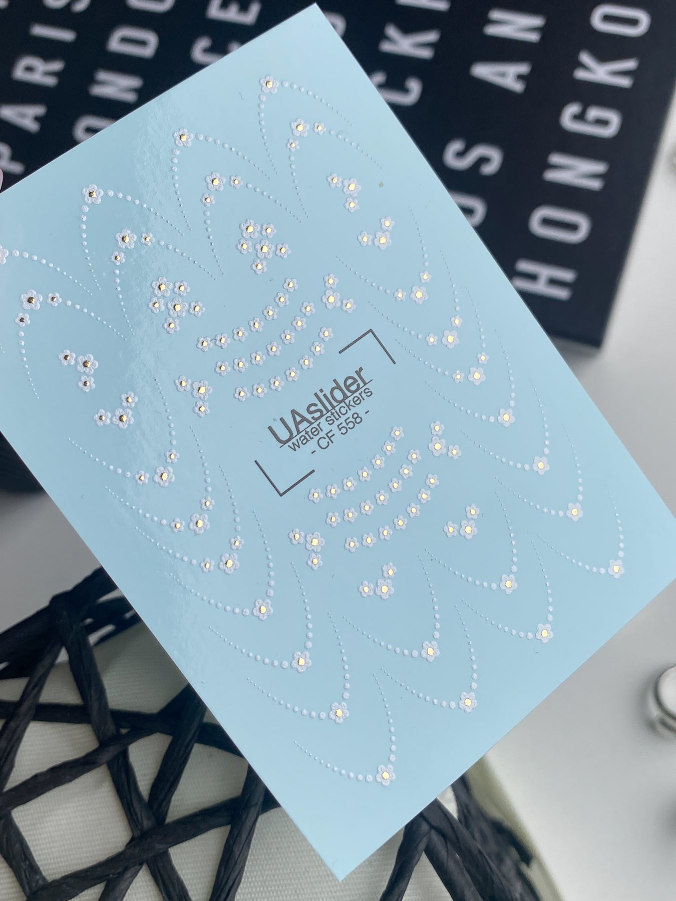 Nail Water Decal CF-558 | French Water Slide Nail Decals with Floral Dots | White Flowers and Delicate LinesCF_558