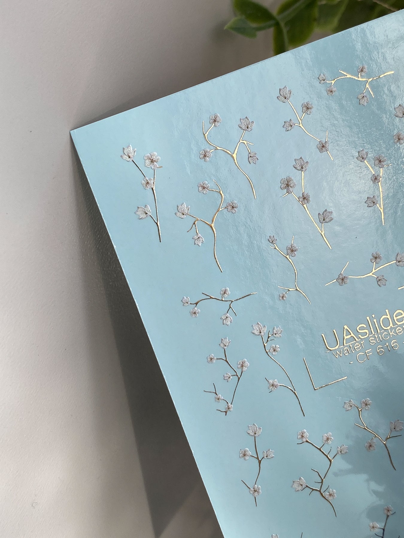 Minimalist floral water slide nail decals with delicate white blossom branches for soft and elegant nail art. These nail water decals are water-activated — cut out the element you like, place it in water, and it slides off the backing for seamless application.