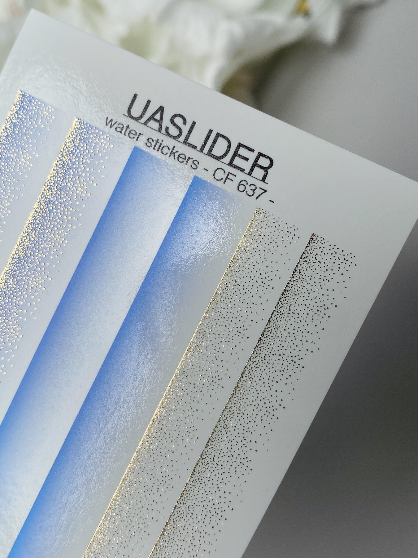 Gradient water slide nail decals with a stylish blue ombre and shimmering gold glitter accents. These nail water decals are water-activated — cut out the strip you need, place it in water, and it slides off the backing for smooth application.