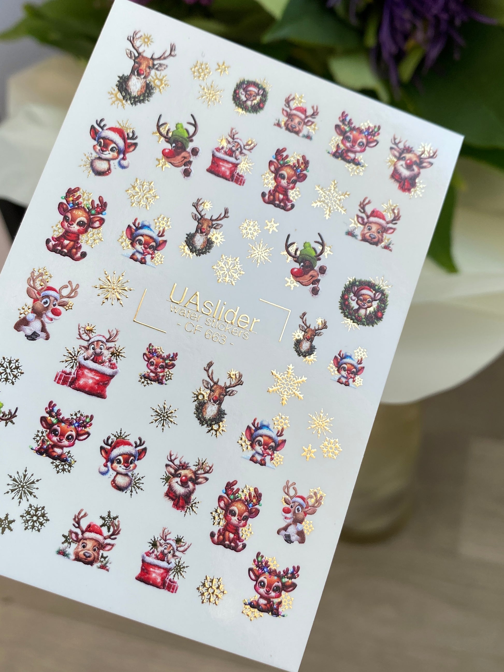 Nail Water Decal CF-663 | Water Slide Nail Decals with Christmas Reindeer & Gold Snowflakes | Festive Holiday SetCF_663