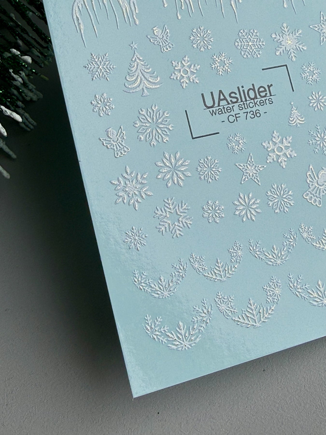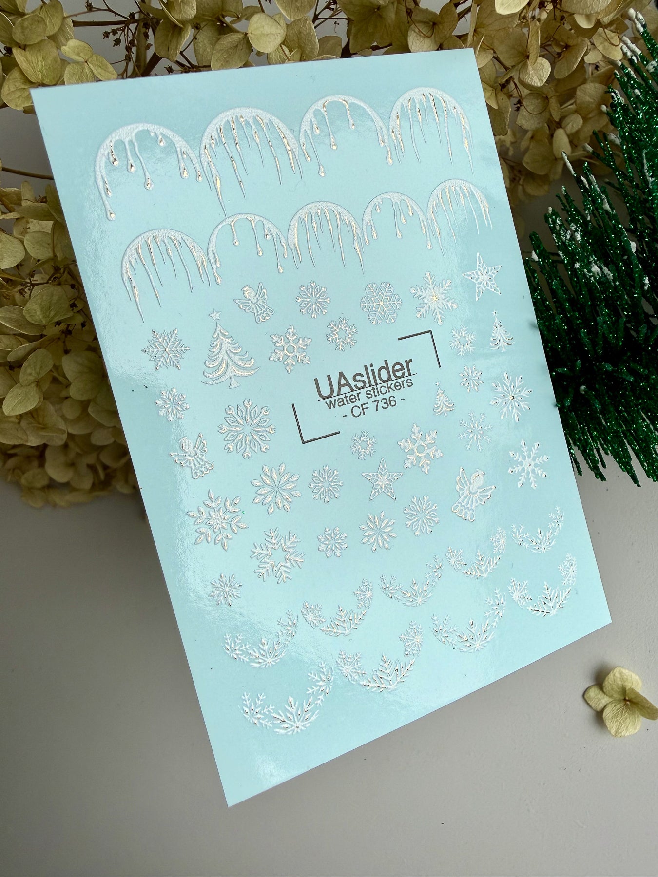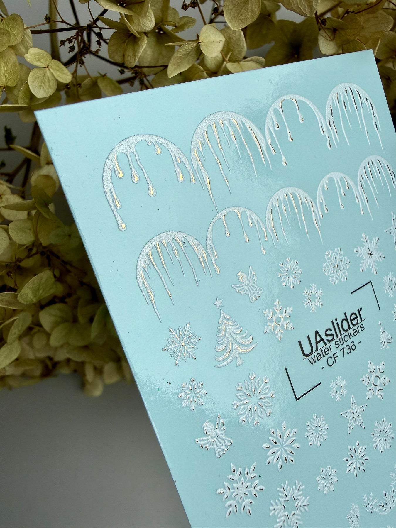 These Water Slide Nail Decals (also known as water transfer nail decals or nail tattoos) feature a frosty winter design with elegant silver snowflakes, icicles, and tiny festive details. Perfect for creating magical holiday manicures and shimmering winter nail art.