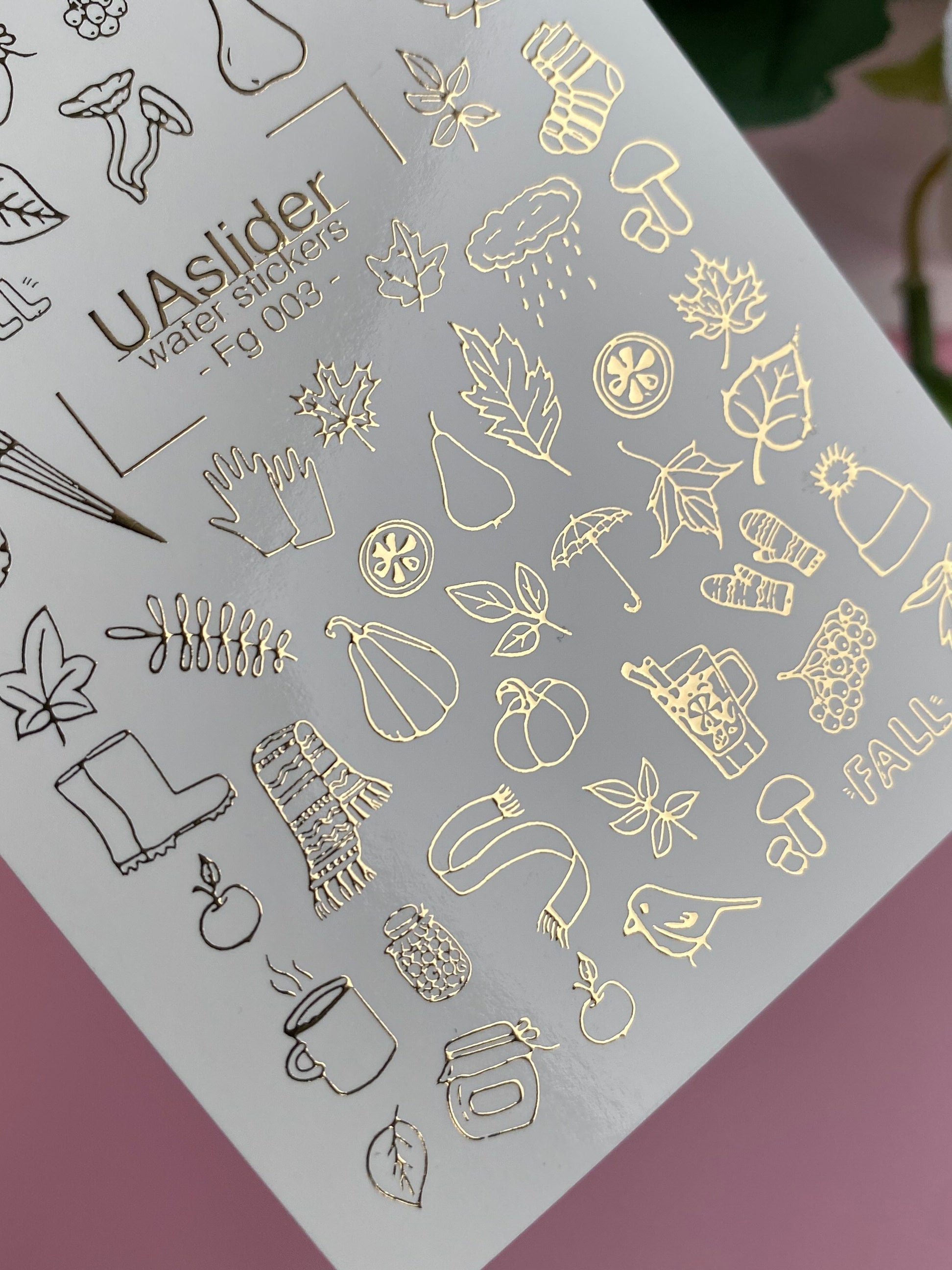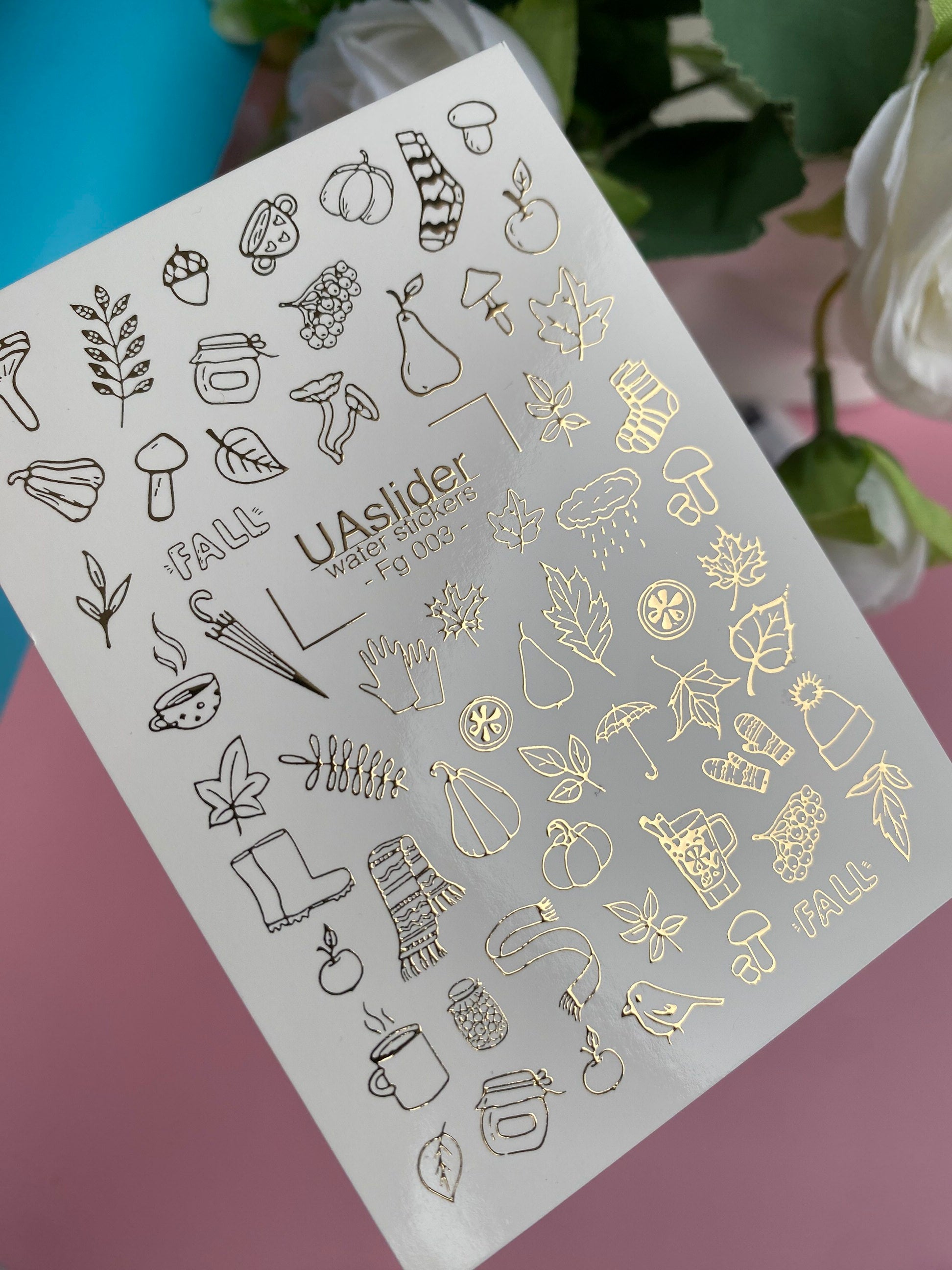Cozy autumn-inspired water slide nail decals featuring scarves, socks, hot drinks, pumpkins, mittens, umbrellas, and golden leaves. Each design is highlighted with shiny gold foil for a chic seasonal look. These nail water decals are water-activated — soak to apply and the motif slides off smoothly for transfer.