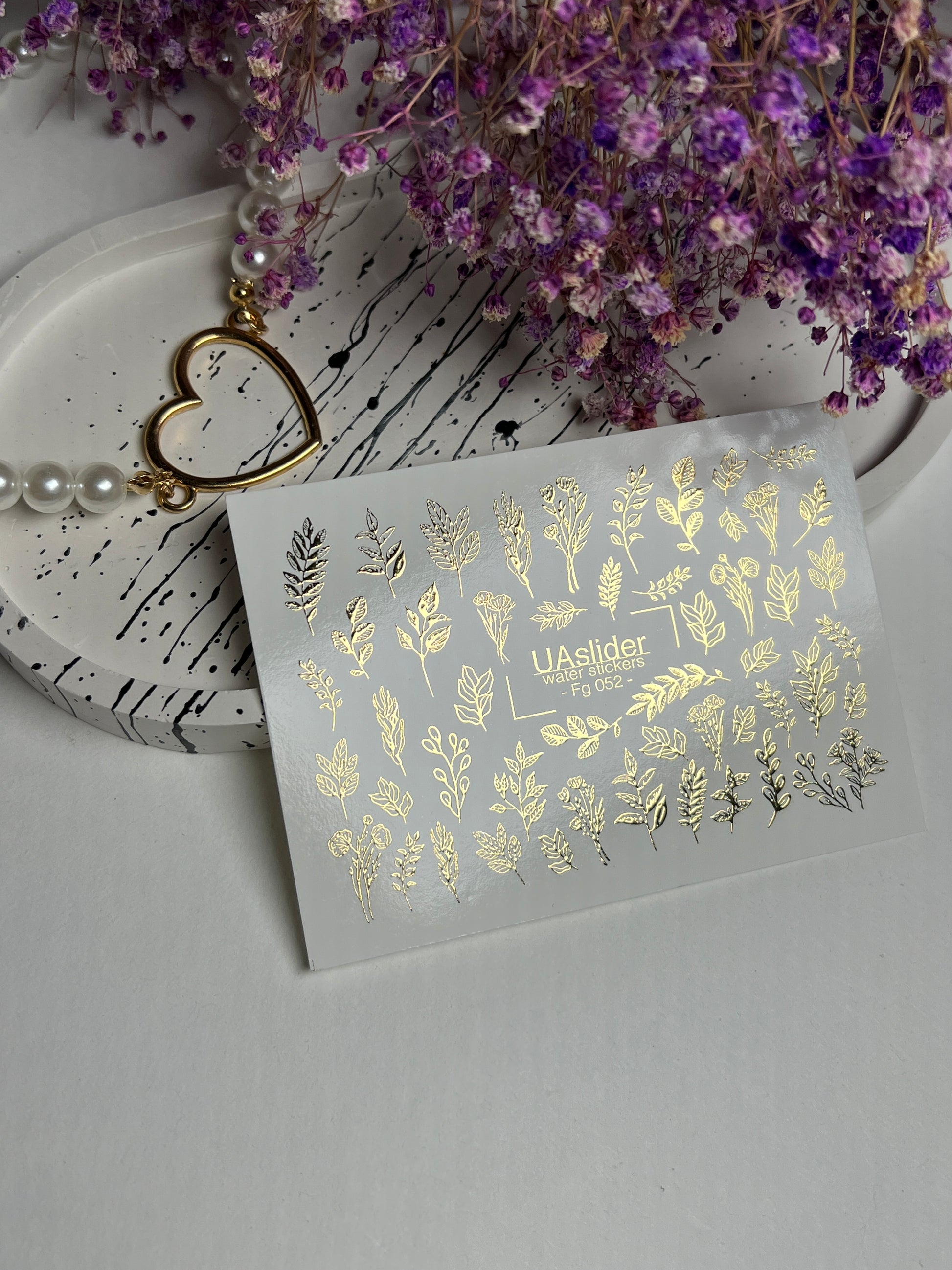 Water Slide Nail Decals featuring delicate golden leaves and botanical branches. These Nail Water Decals apply effortlessly with warm water, gliding onto the nail surface to create refined and natural nail art.