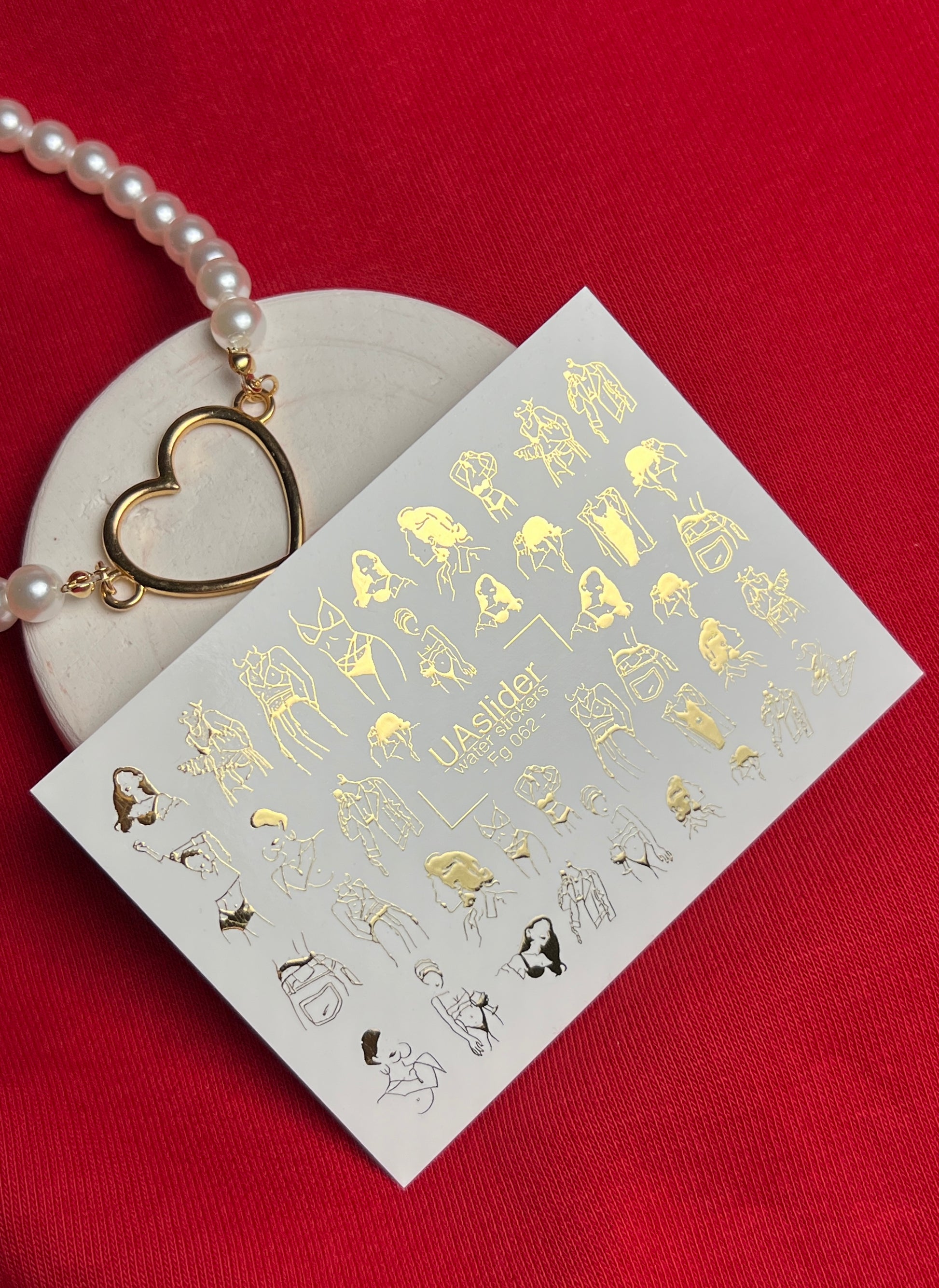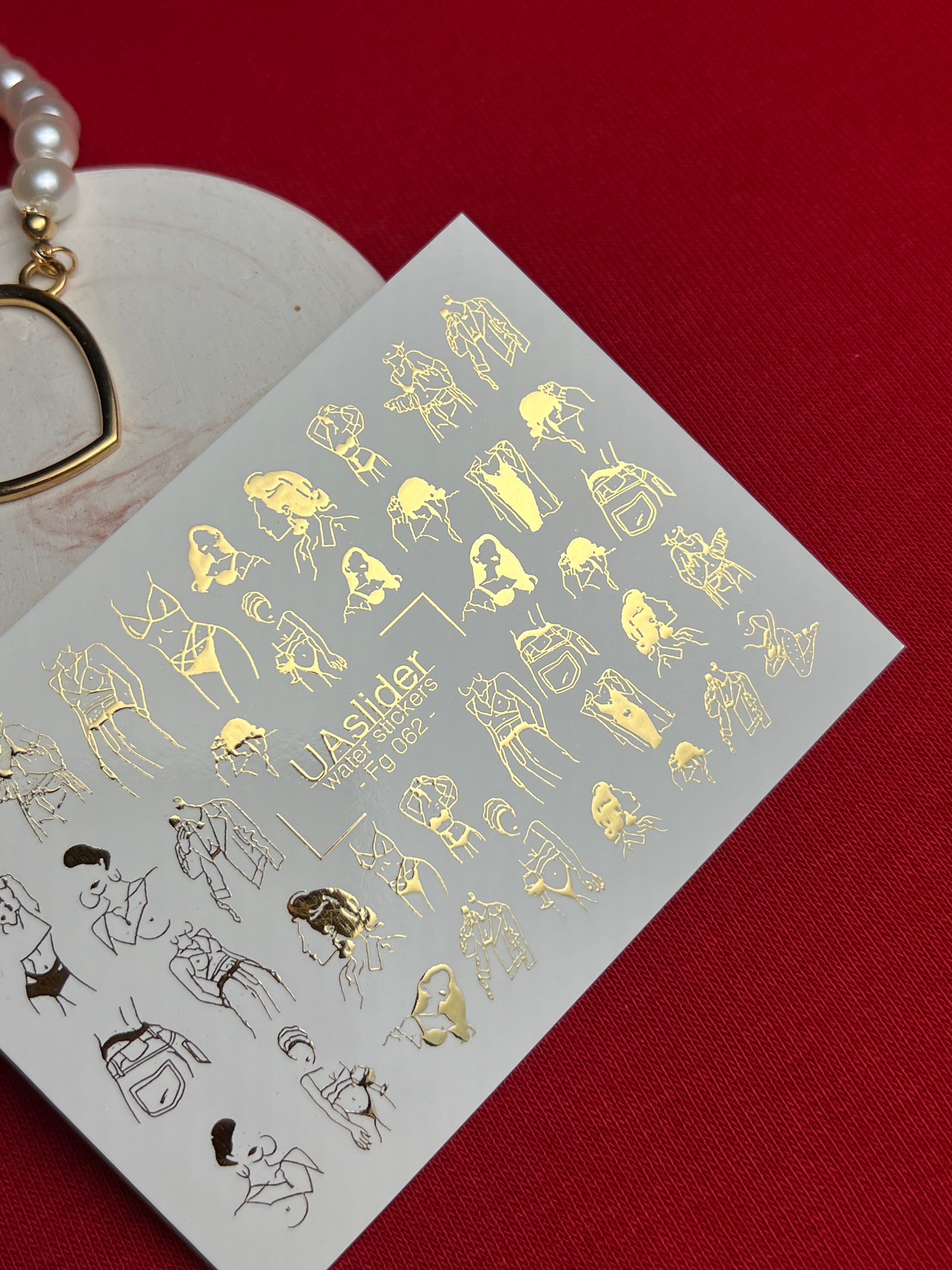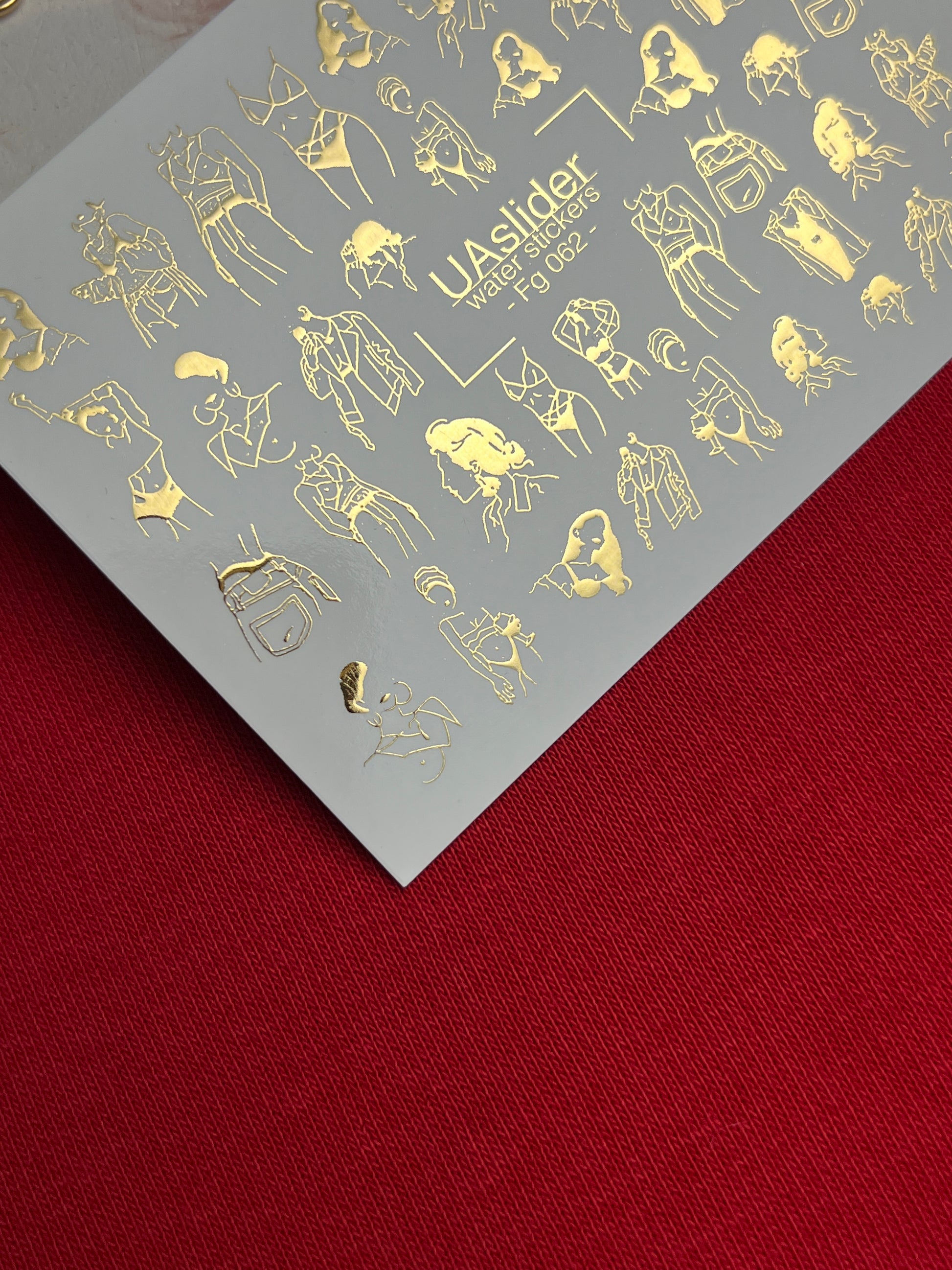 Gold foil water slide nail decals with elegant fashion sketch motifs — feminine silhouettes, abstract portraits, lingerie outlines, and stylish accessories. These metallic designs bring an artistic and trendy vibe, perfect for modern and fashion-inspired manicures.