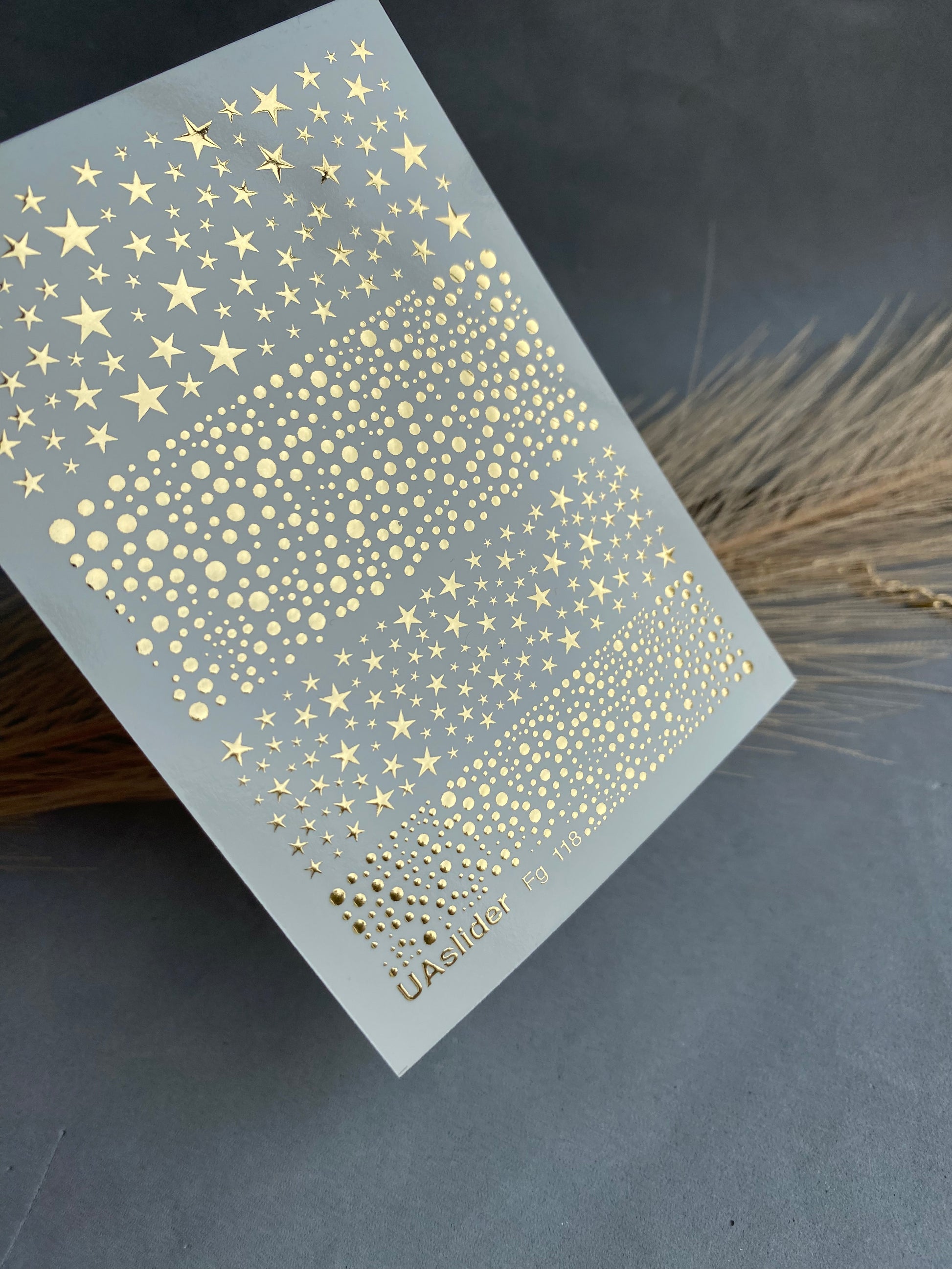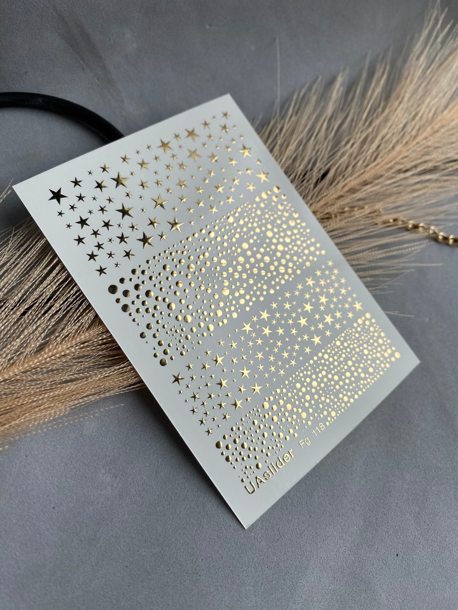 Gold foil stars and dotted patterns create a sparkling celestial effect for your manicure. These water slide nail decals are water-activated — soak in water, and each design releases and transfers smoothly onto the nail surface. Cut the chosen element before soaking, as this is a required step of the application process. Warm water may be used for convenience. Perfect for festive nail art, cosmic-inspired looks, or accent designs that shine like the night sky.