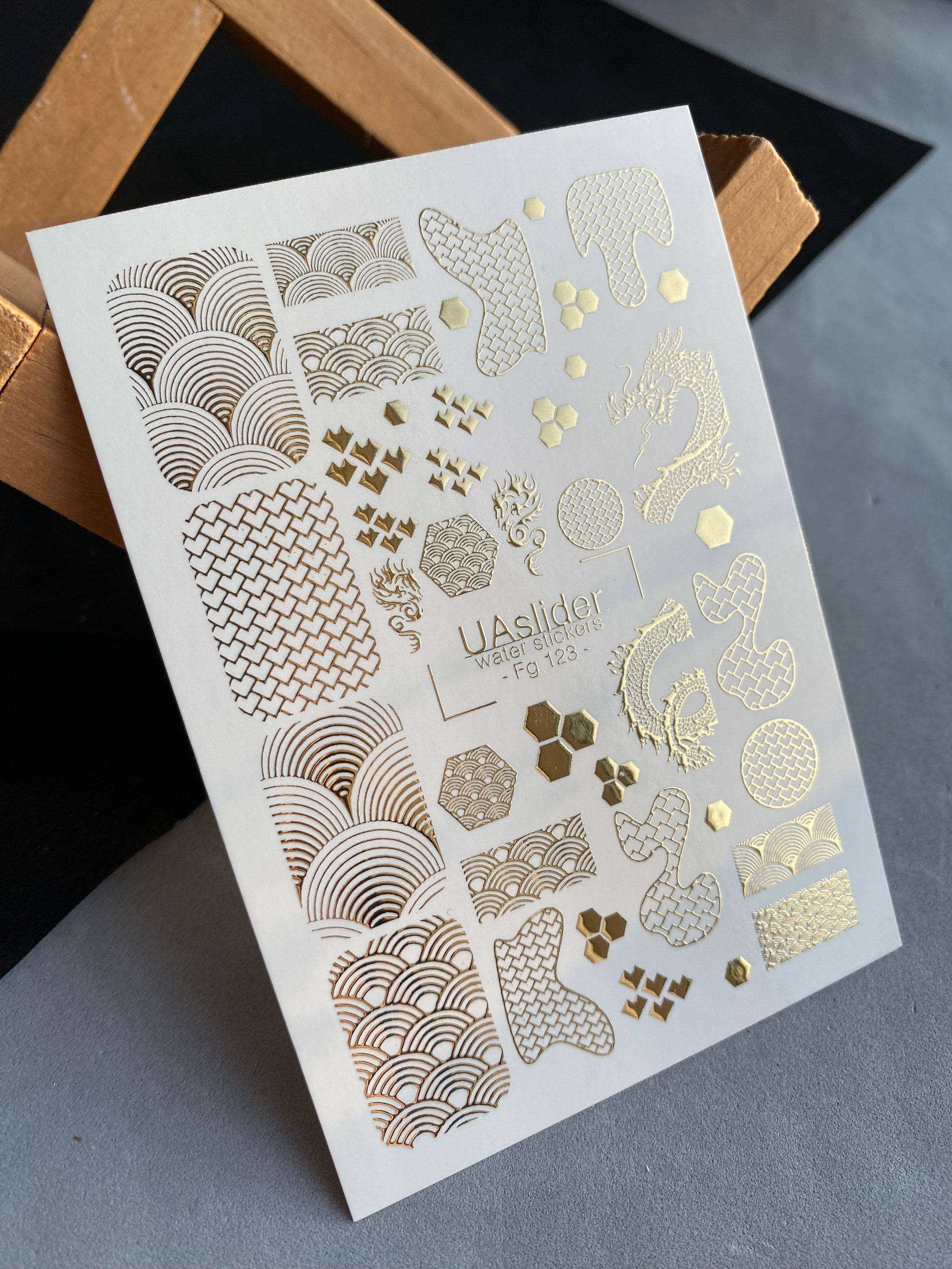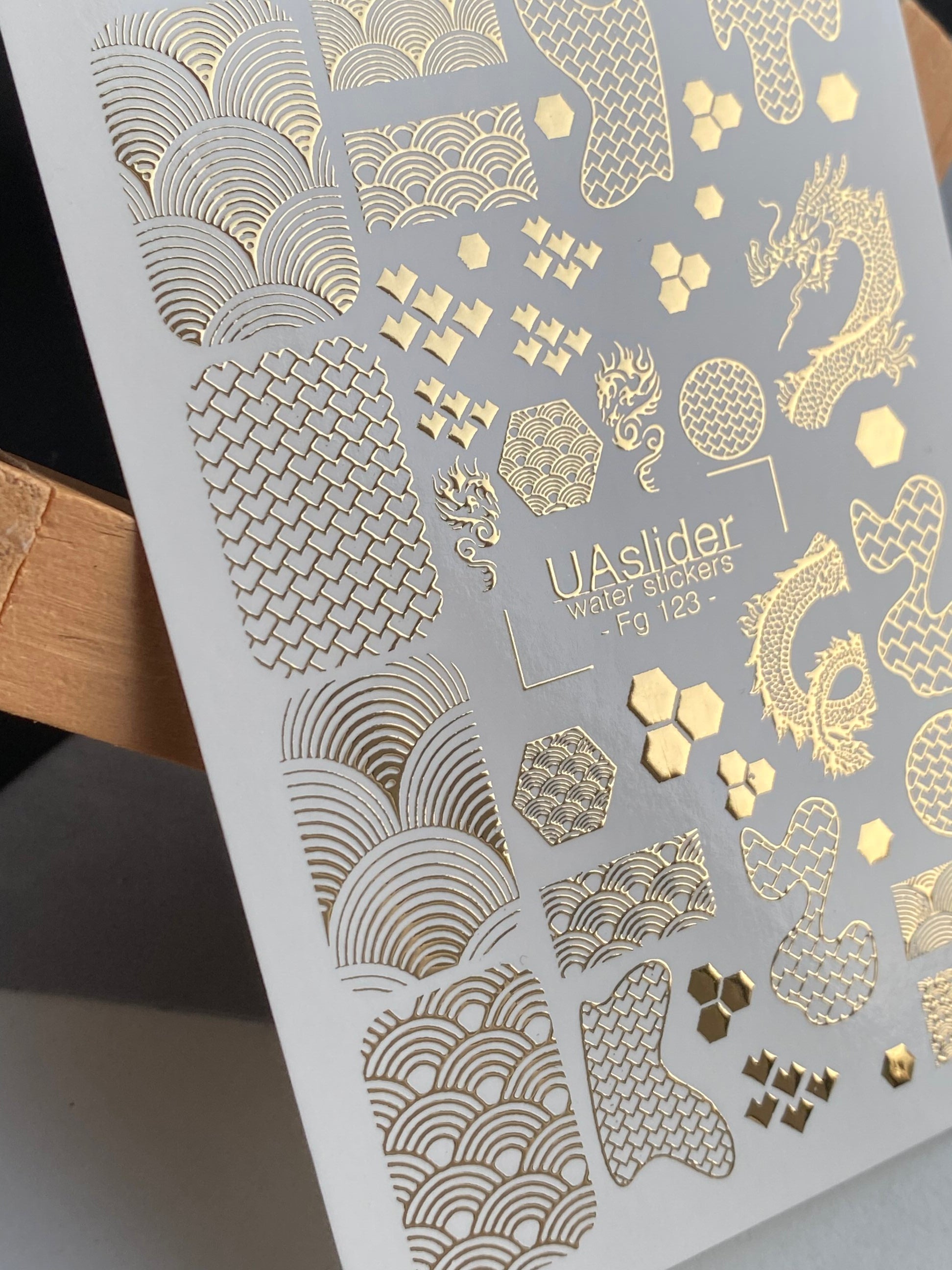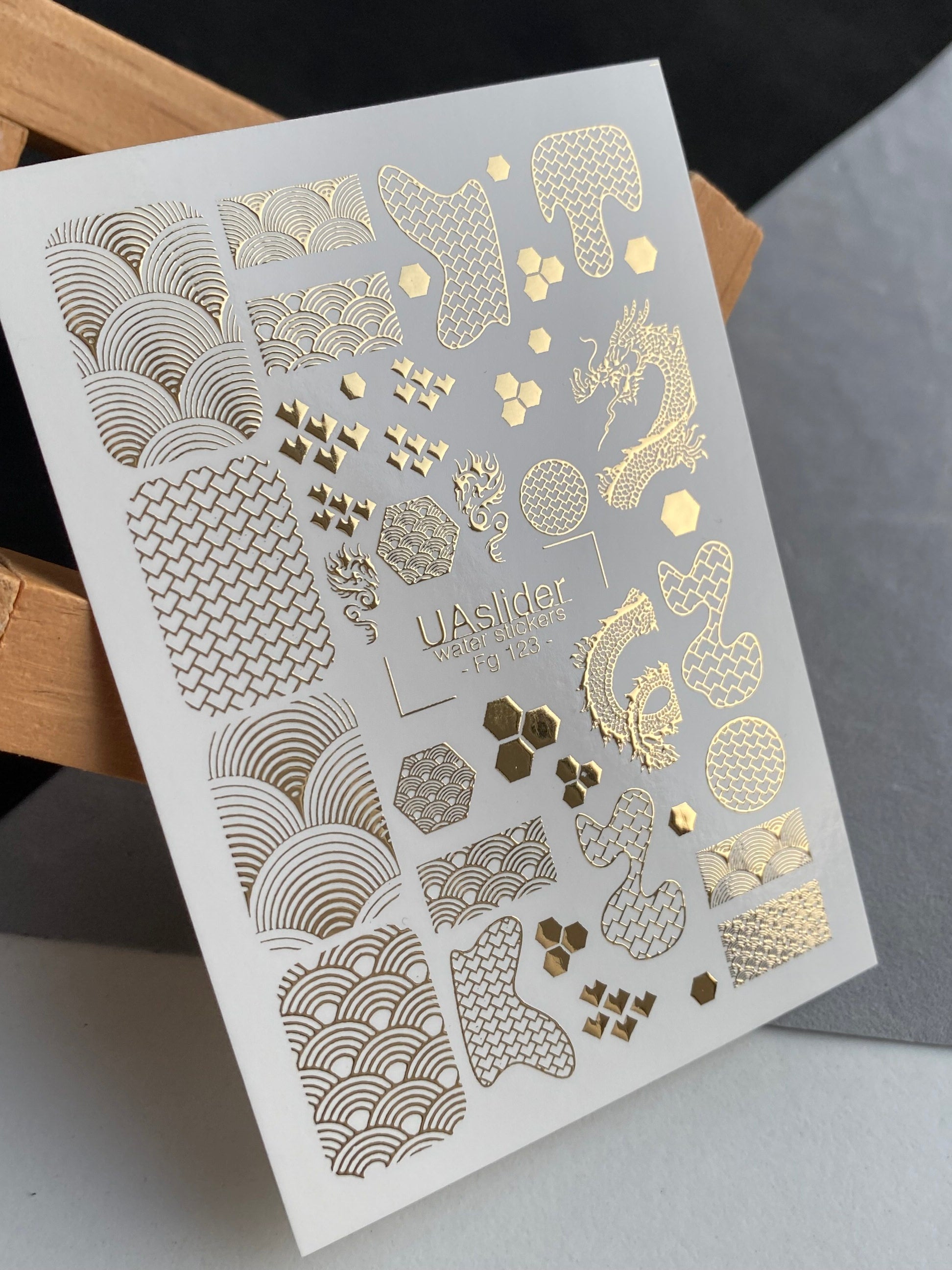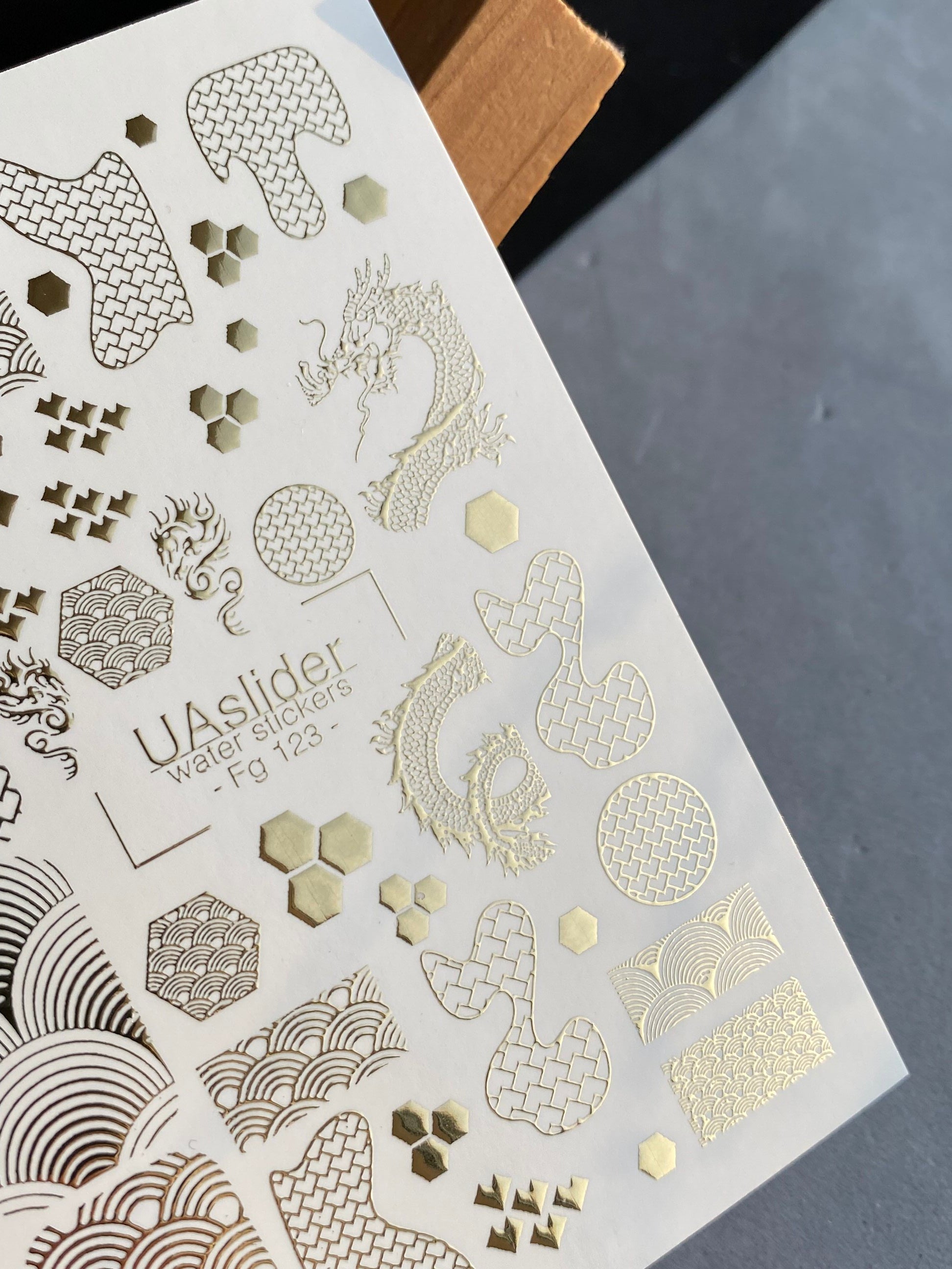 Nail Water Decal Fg-123 | Water Slide Nail Decals with Gold Asian Patterns & Dragon | Oriental StyleFg_123