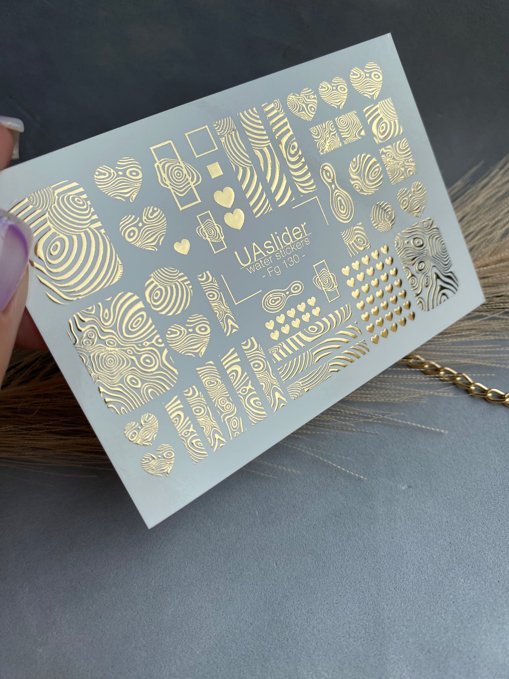 Unique golden patterns inspired by wood grain, circles, waves, and hearts create an artistic, modern manicure look. These water slide nail decals are water-activated: simply soak in water, and the chosen design will detach and transfer smoothly to the nail. Be sure to cut out the desired element before soaking, as this step is required. Warm water may be used for convenience. Perfect for abstract nail art, geometric accents, or creative manicure styles.