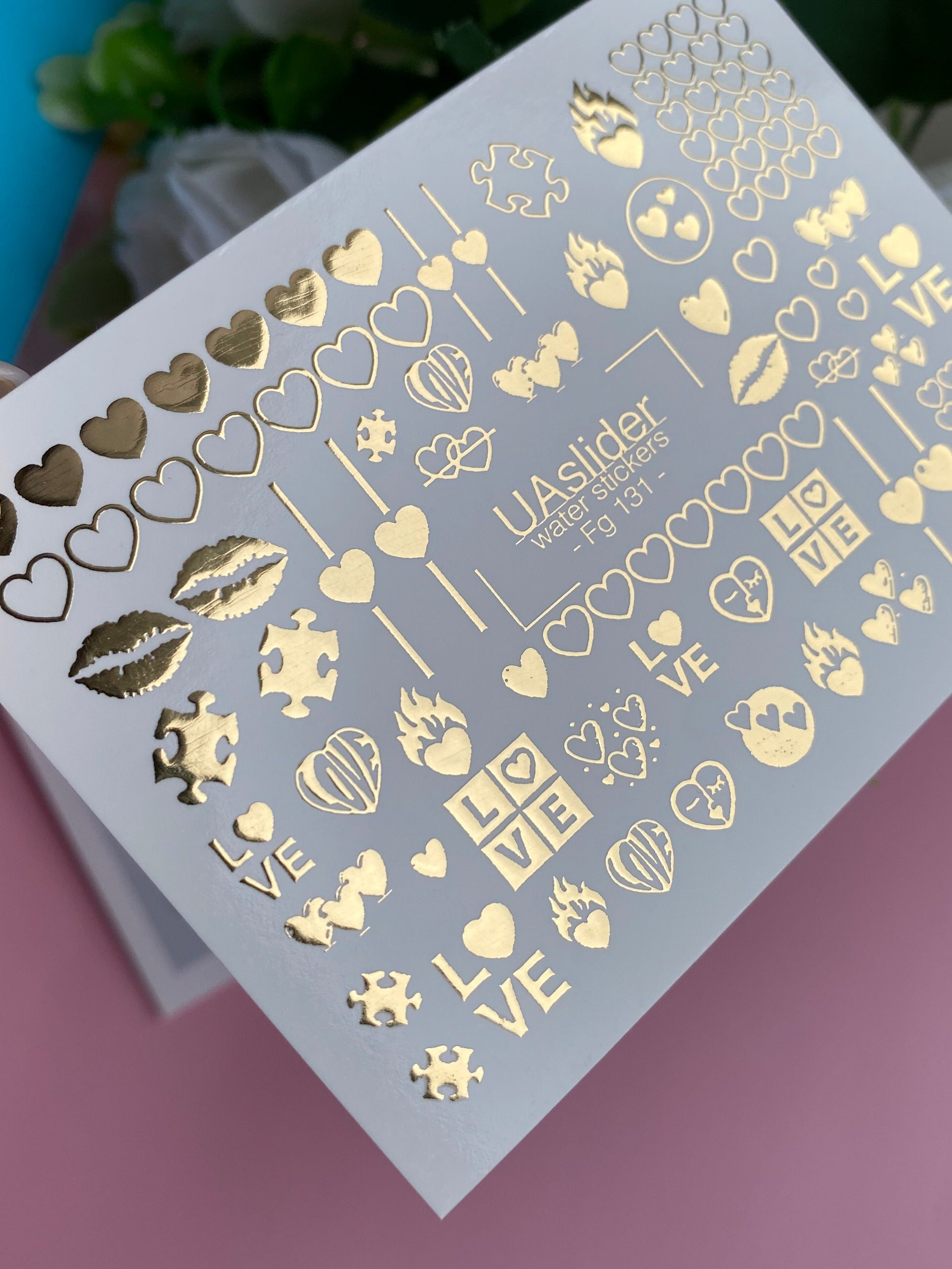 Nail Water Decal Fg-131 | Water Slide Nail Decals with Gold Hearts and Love Symbols | Romantic Nail Tattoos
