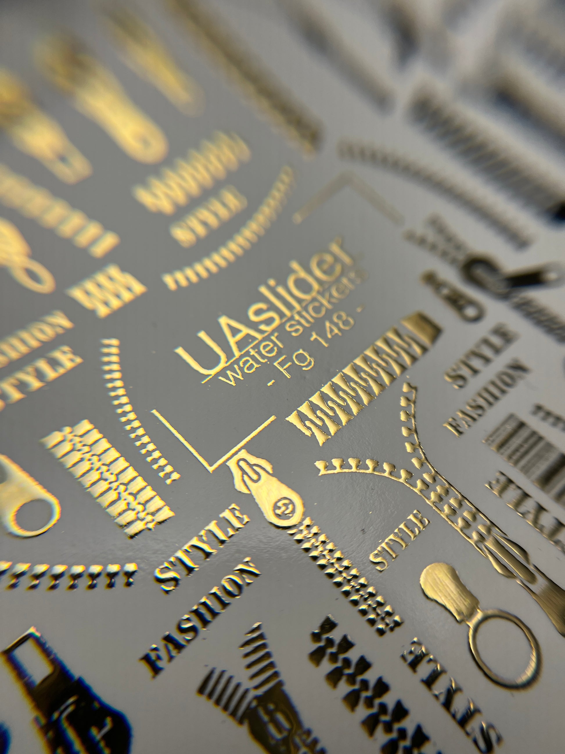 These water slide nail decals feature stylish gold zipper designs, barcode lines, and “STYLE / FASHION” lettering for a bold and trendy manicure. Perfect for adding a unique fashion-inspired detail to your nails. Water-based application: cut the selected design, soak in water, and transfer onto the nail. Warm water can be used for extra comfort.