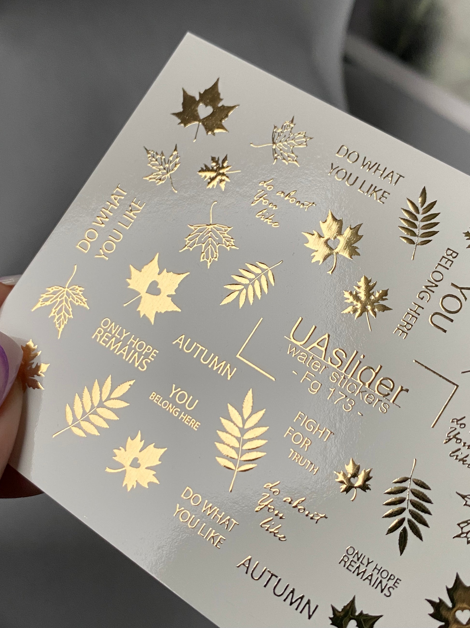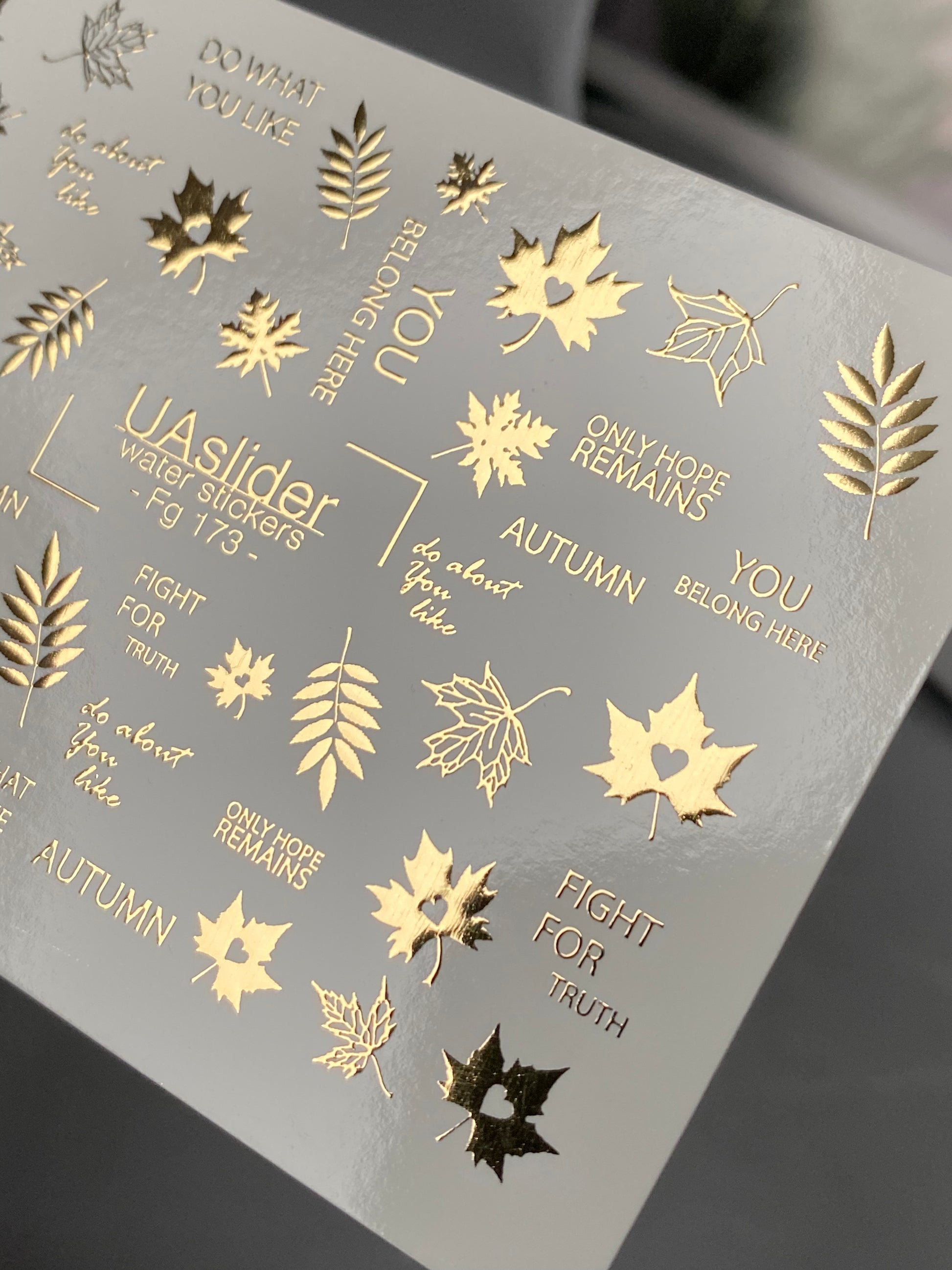Stylish gold foil water slide nail decals with autumn leaves, botanical branches, and motivational inscriptions like "Autumn", "Do What You Like", and "Fight for Truth". These Nail Water Decals combine seasonal charm with inspiring details.