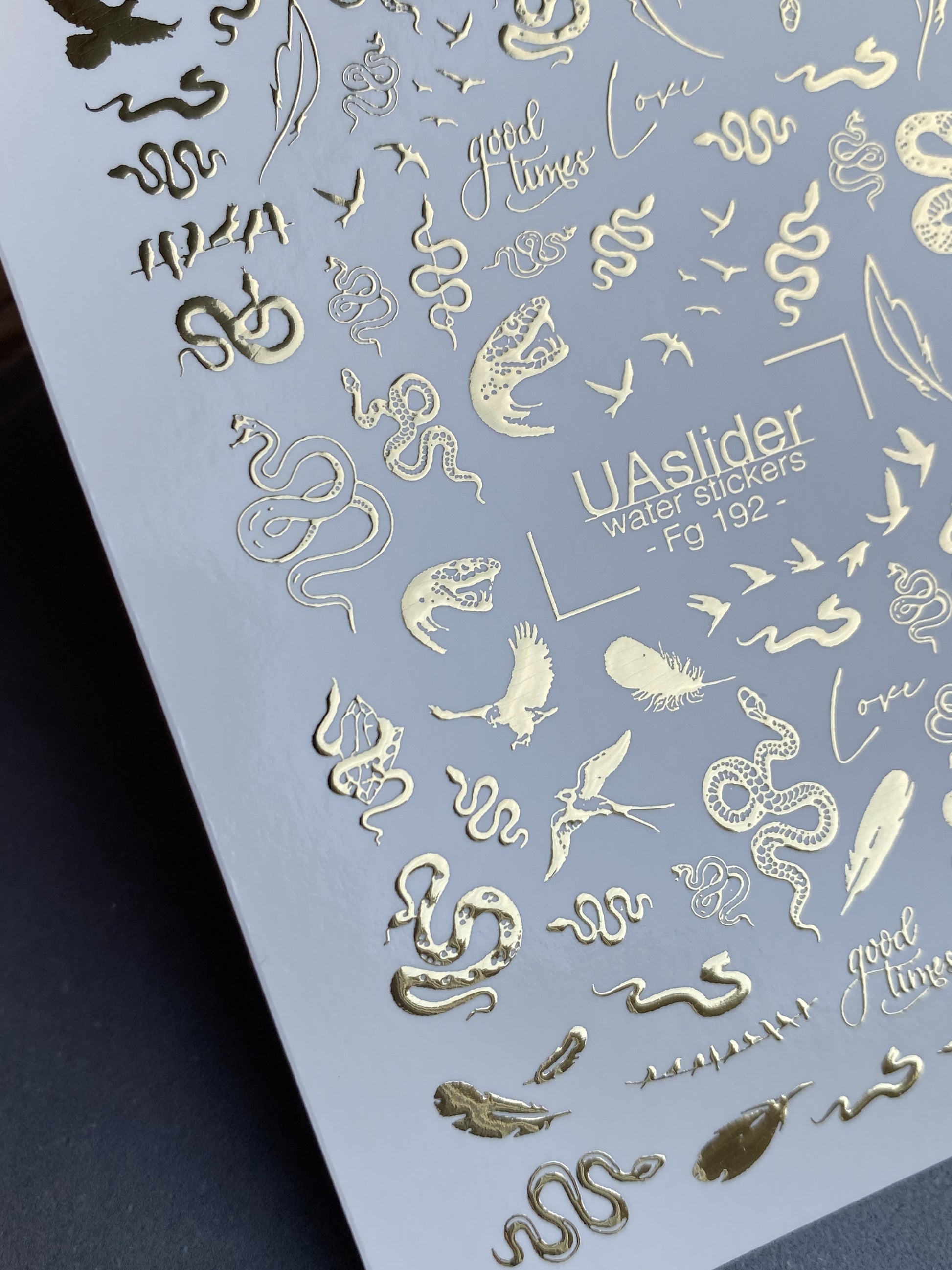 Unique gold foil water slide nail decals with artistic snake patterns, flying birds, feathers, and mystical details. These Nail Water Decals bring a bold and symbolic style to your manicure, making every nail look mysterious and stylish.