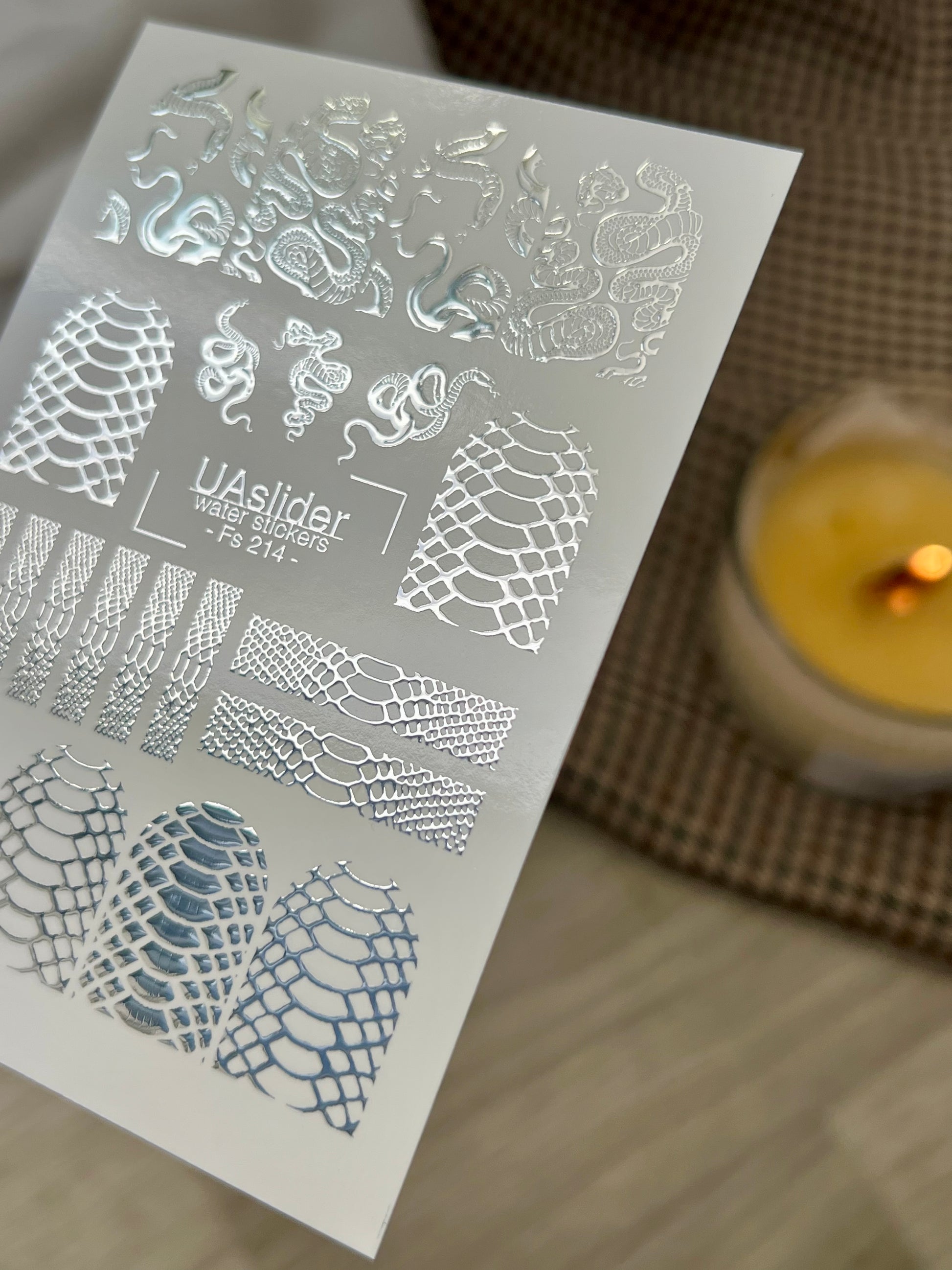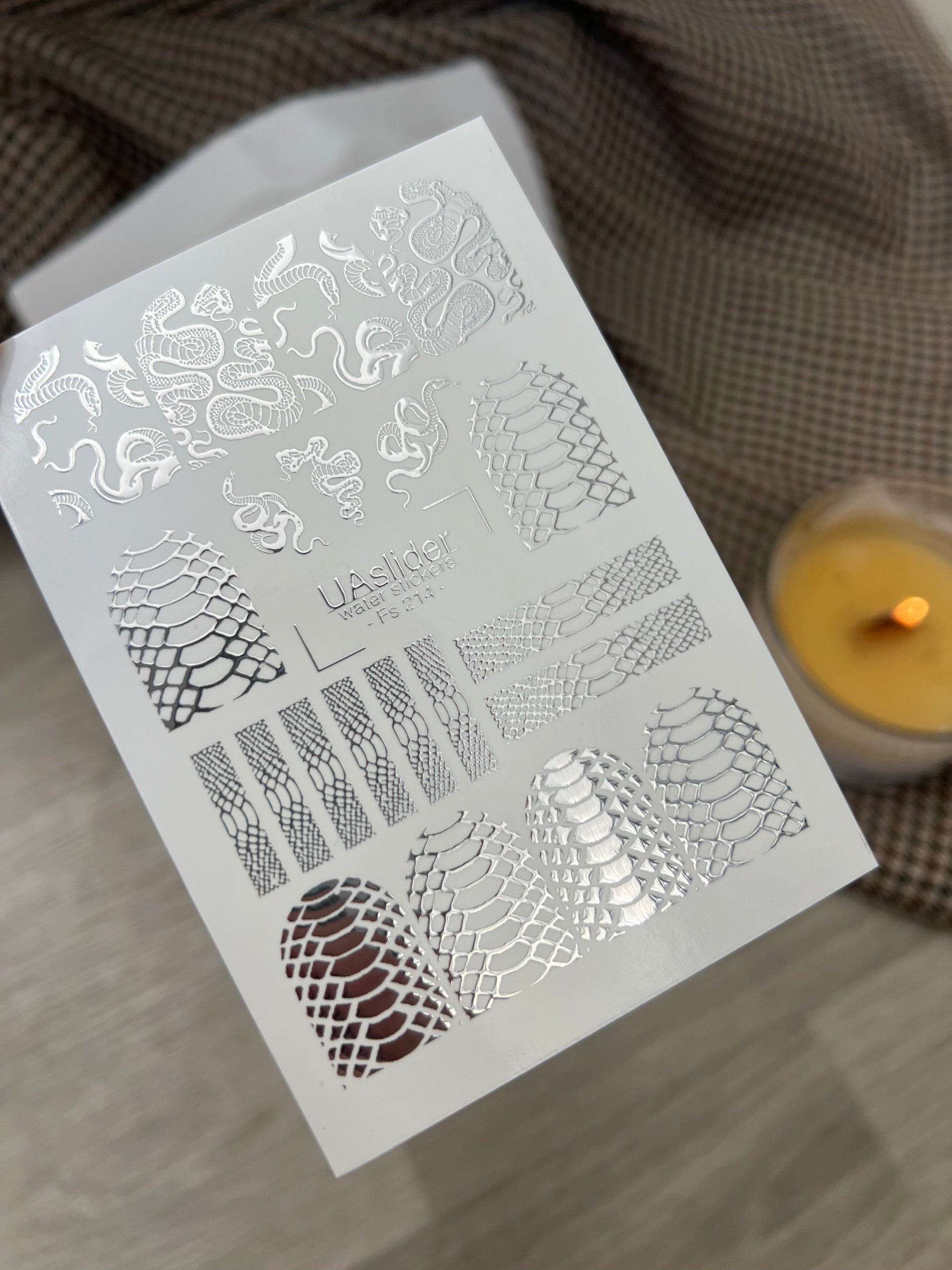 Water slide nail decals with exotic snake skin patterns and snake illustrations, including full cover designs. These nail water decals create bold and stylish manicures, adding a touch of wild elegance to your nail art.