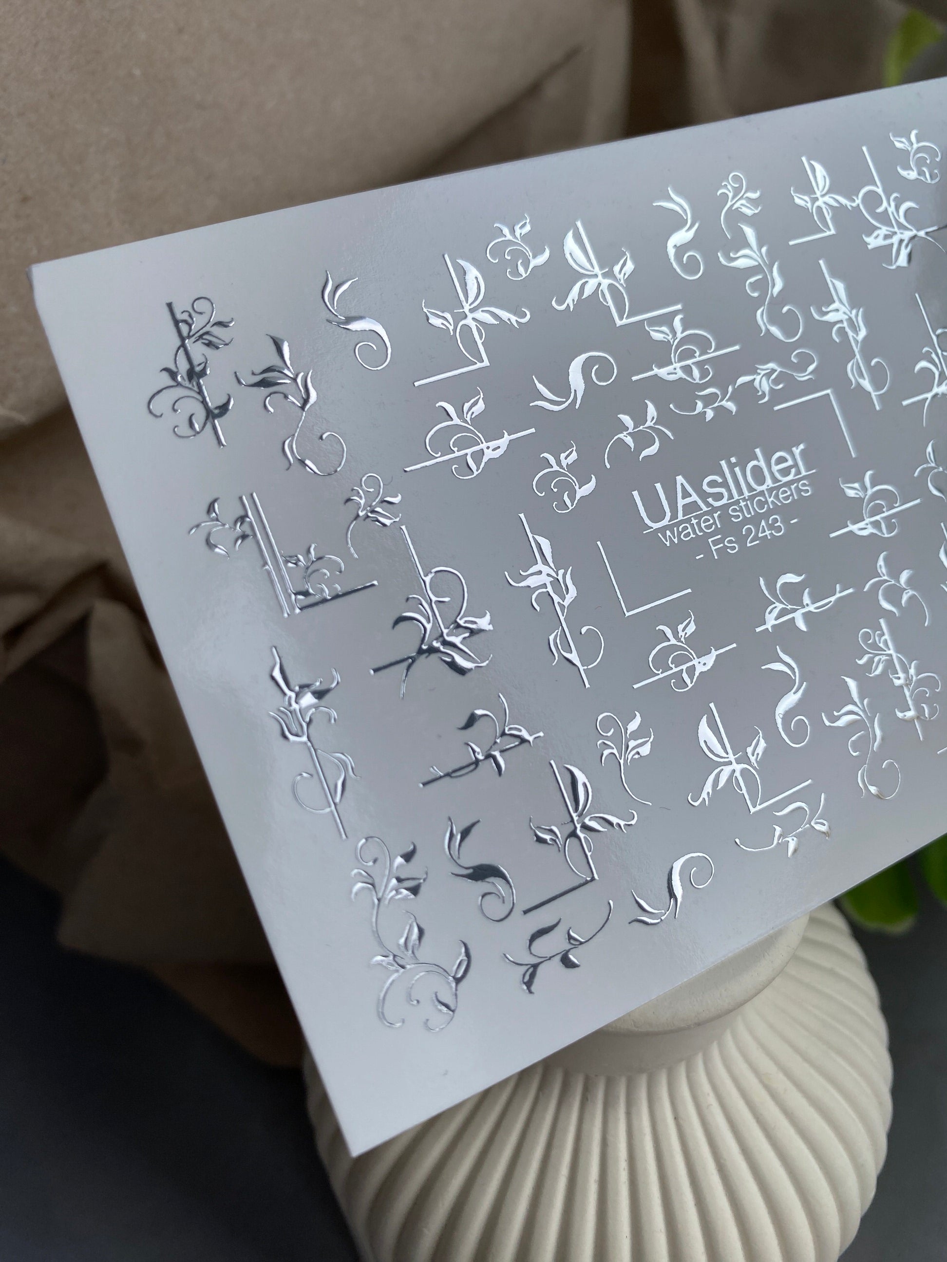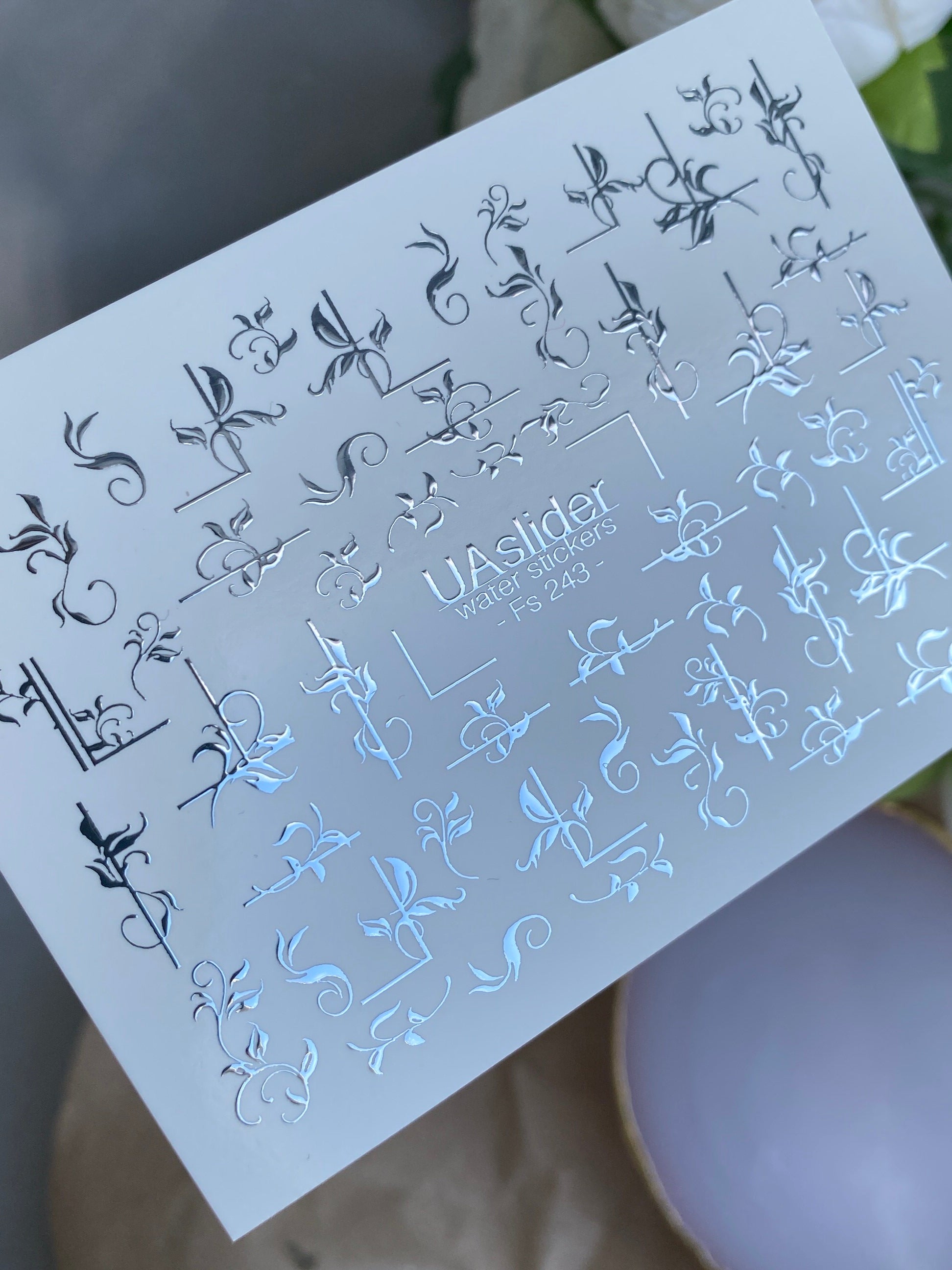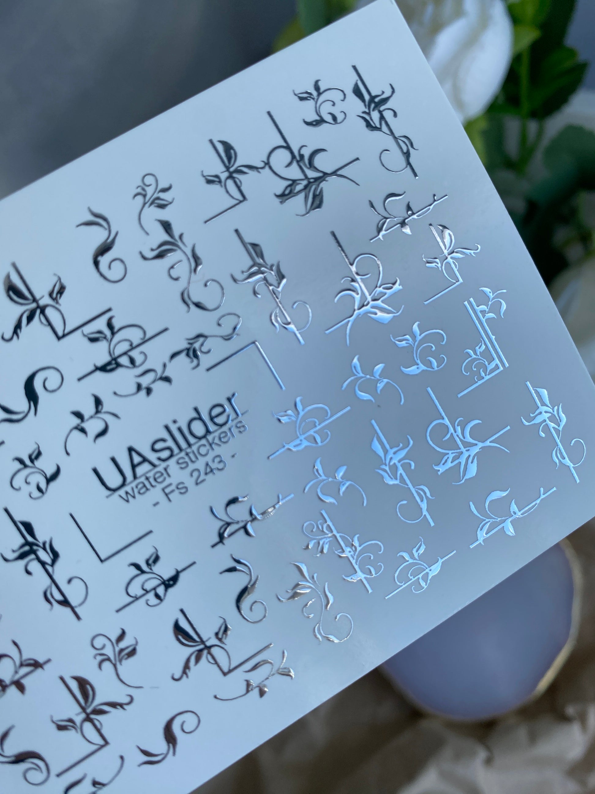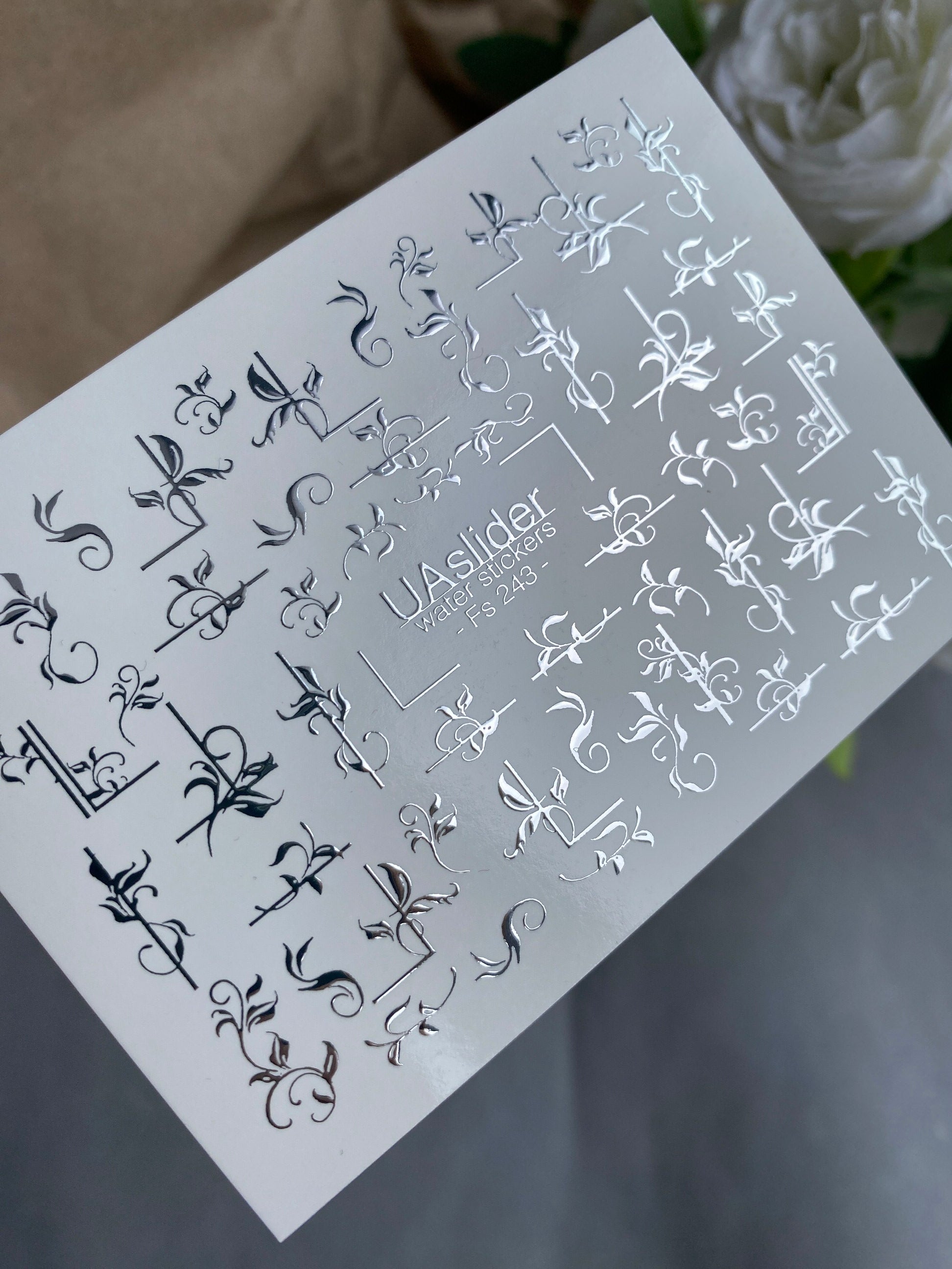 Elegant water slide nail decals with metallic silver foil — featuring ornamental swirls, delicate branches, and floral-inspired accents. These nail water decals are water-activated: immerse in water and the design slides off smoothly for effortless transfer.