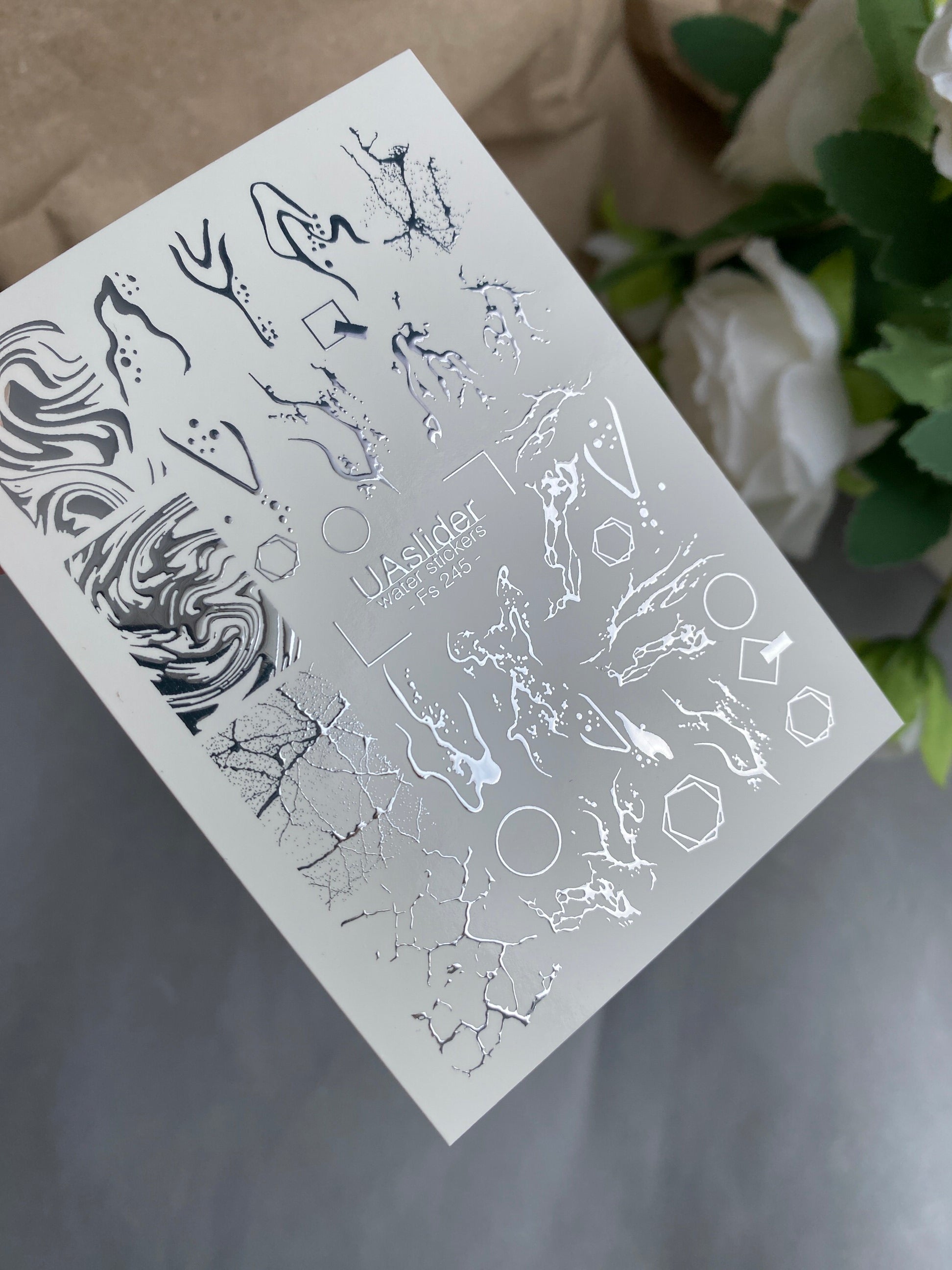 Nail Water Decal Fs-245 | Abstract Water Slide Nail Decals | Silver Foil Marble & Crackle Designs