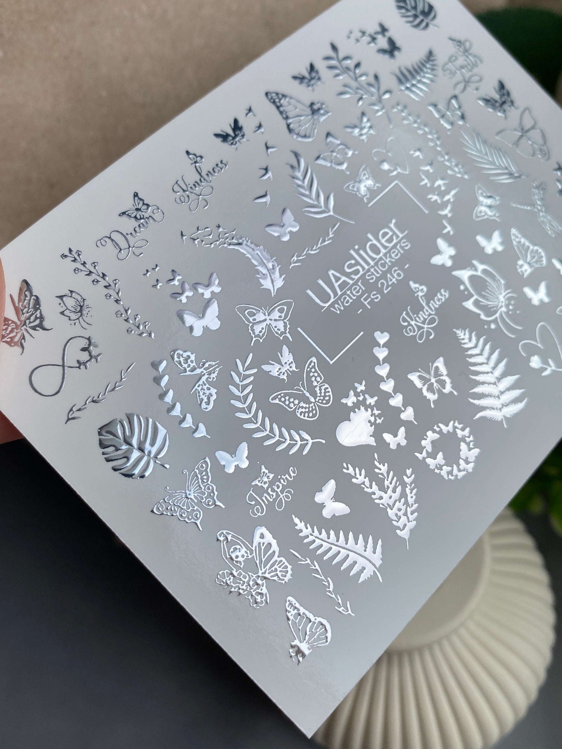 Nail Water Decal Fs-246 | Butterfly Water Slide Nail Decals | Silver Foil Leaves & Inspirational Words