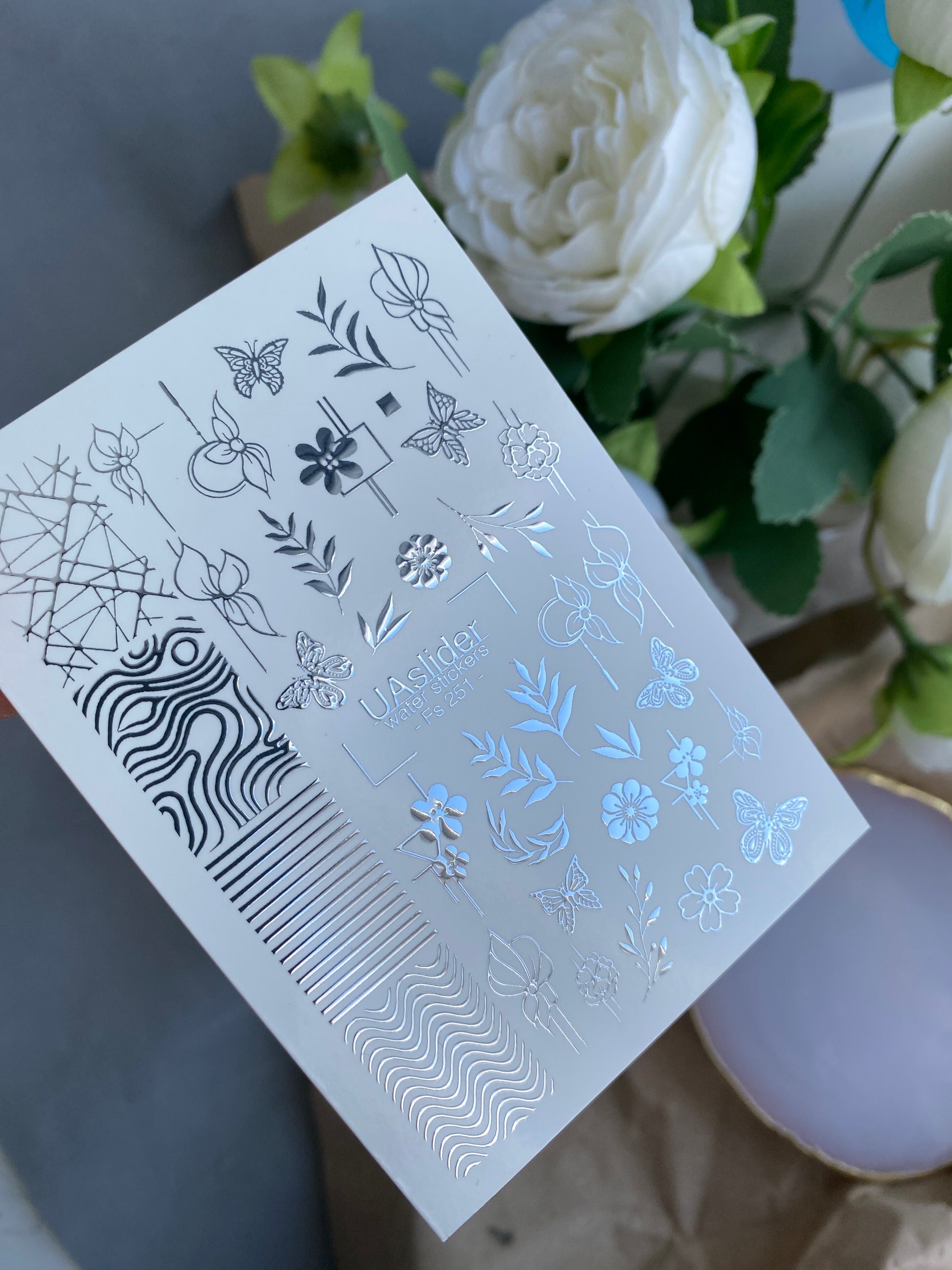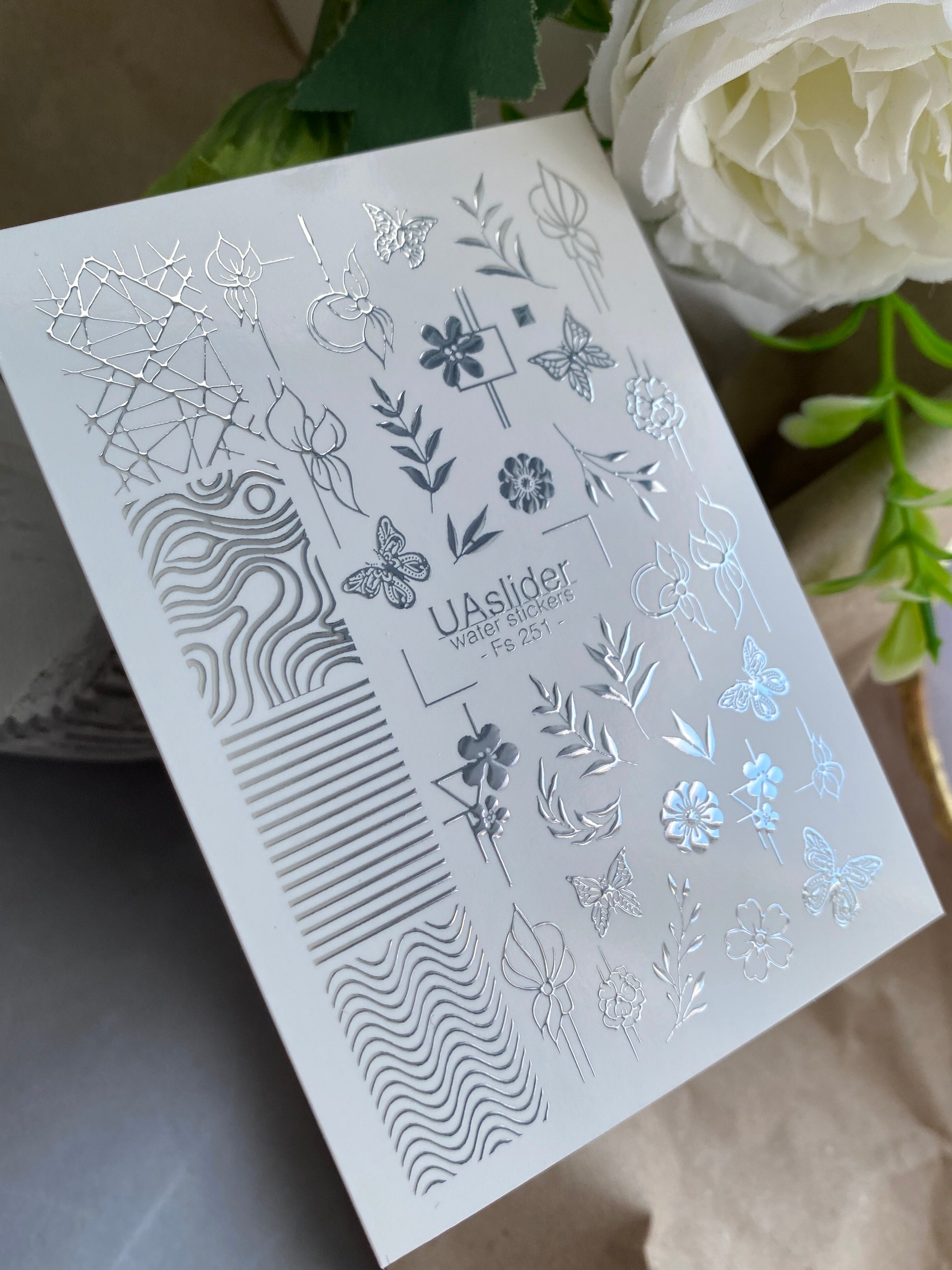 Nail Water Decal Fs-251 | Mixed Water Slide Nail Decals | Silver Foil Flowers, Butterflies & Abstract Lines