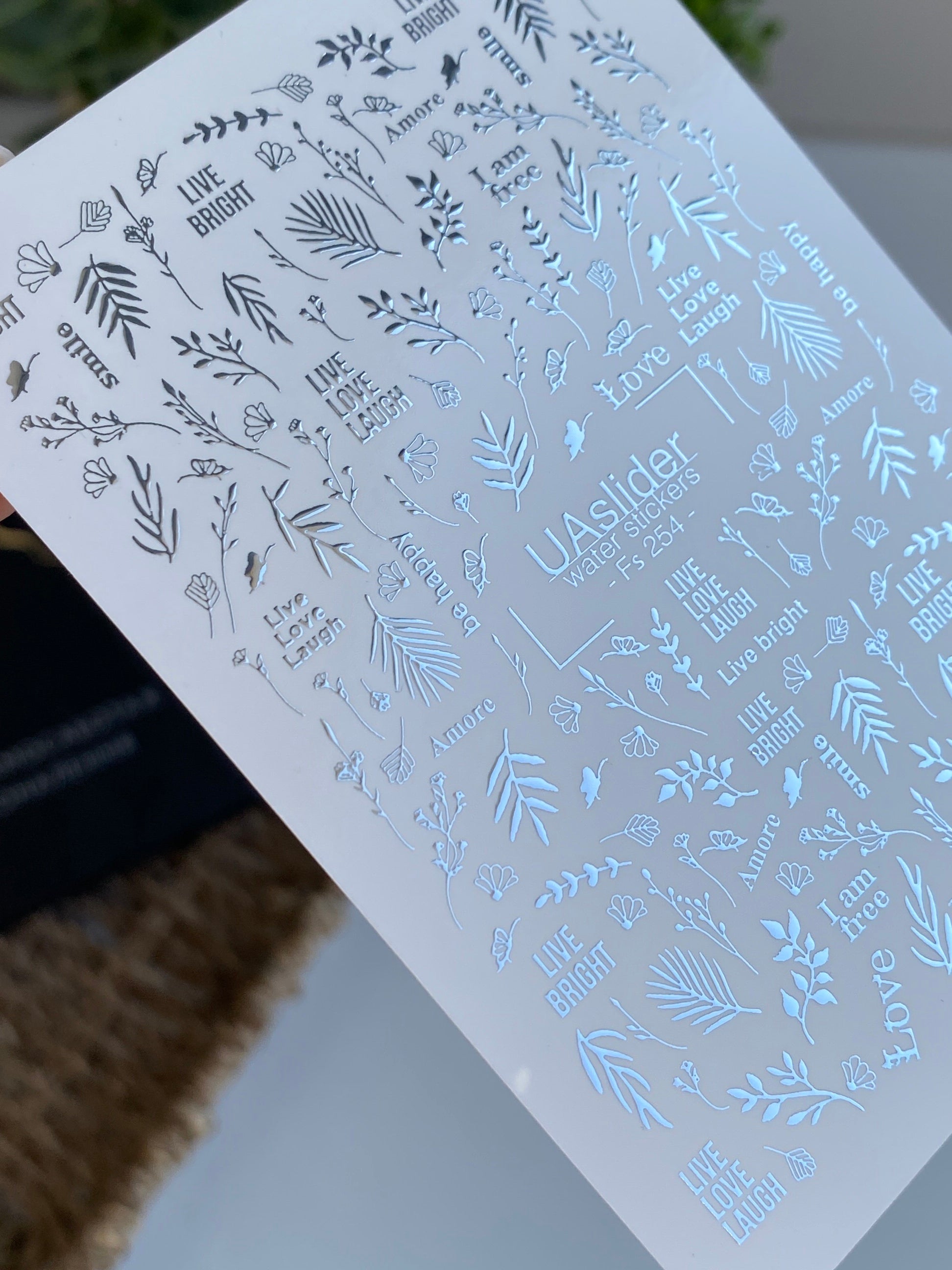 nspirational water slide nail decals with metallic silver foil — featuring uplifting words like Love, Be Happy, Live Love Laugh, alongside delicate leaves and floral sprigs. These nail water decals are water-activated: soak in water and the design slides off smoothly for effortless transfer.