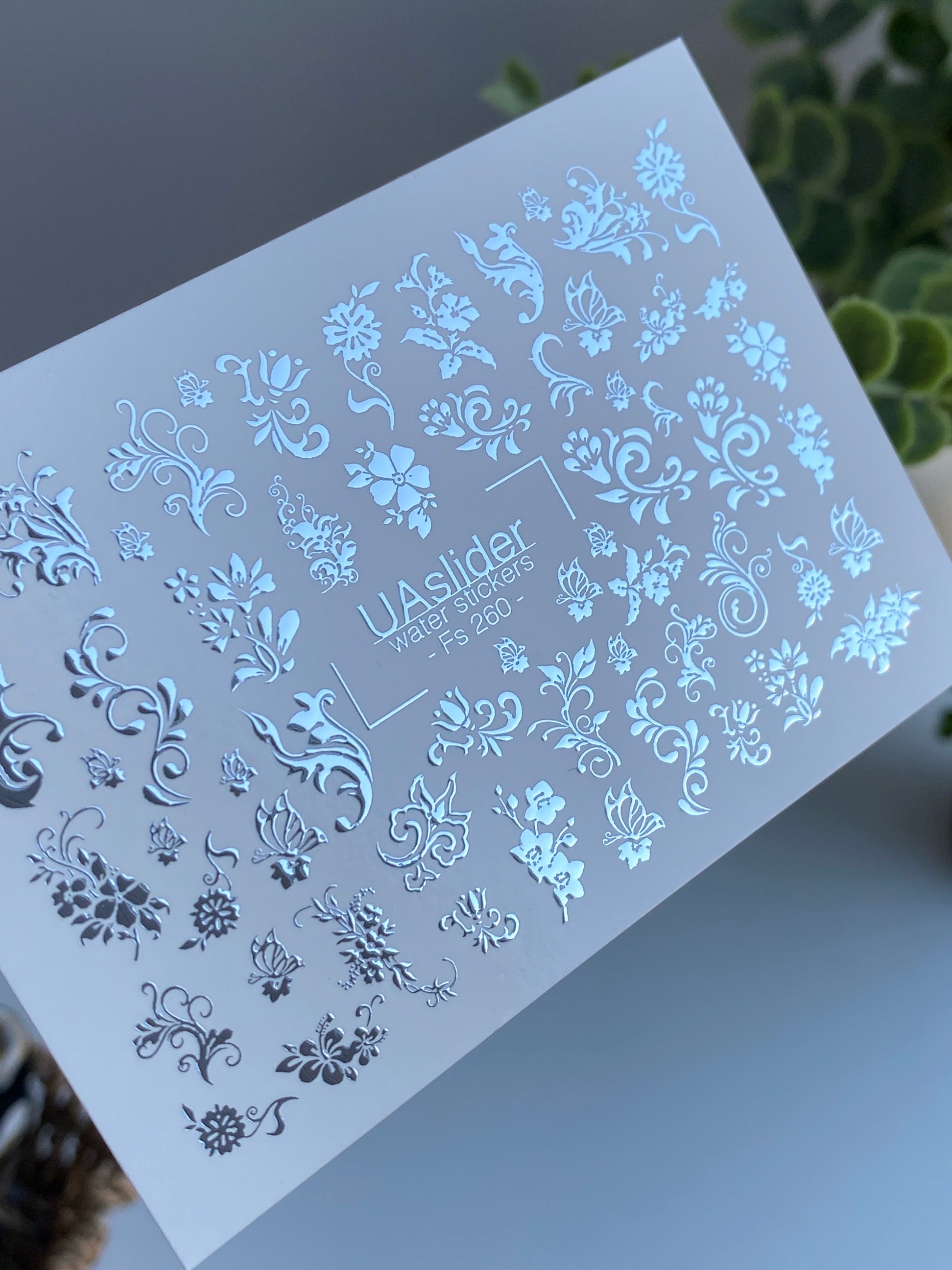 Nail Water Decal Fs-260 | Ornamental Water Slide Nail Decals | Silver Foil Floral Swirls & Patterns