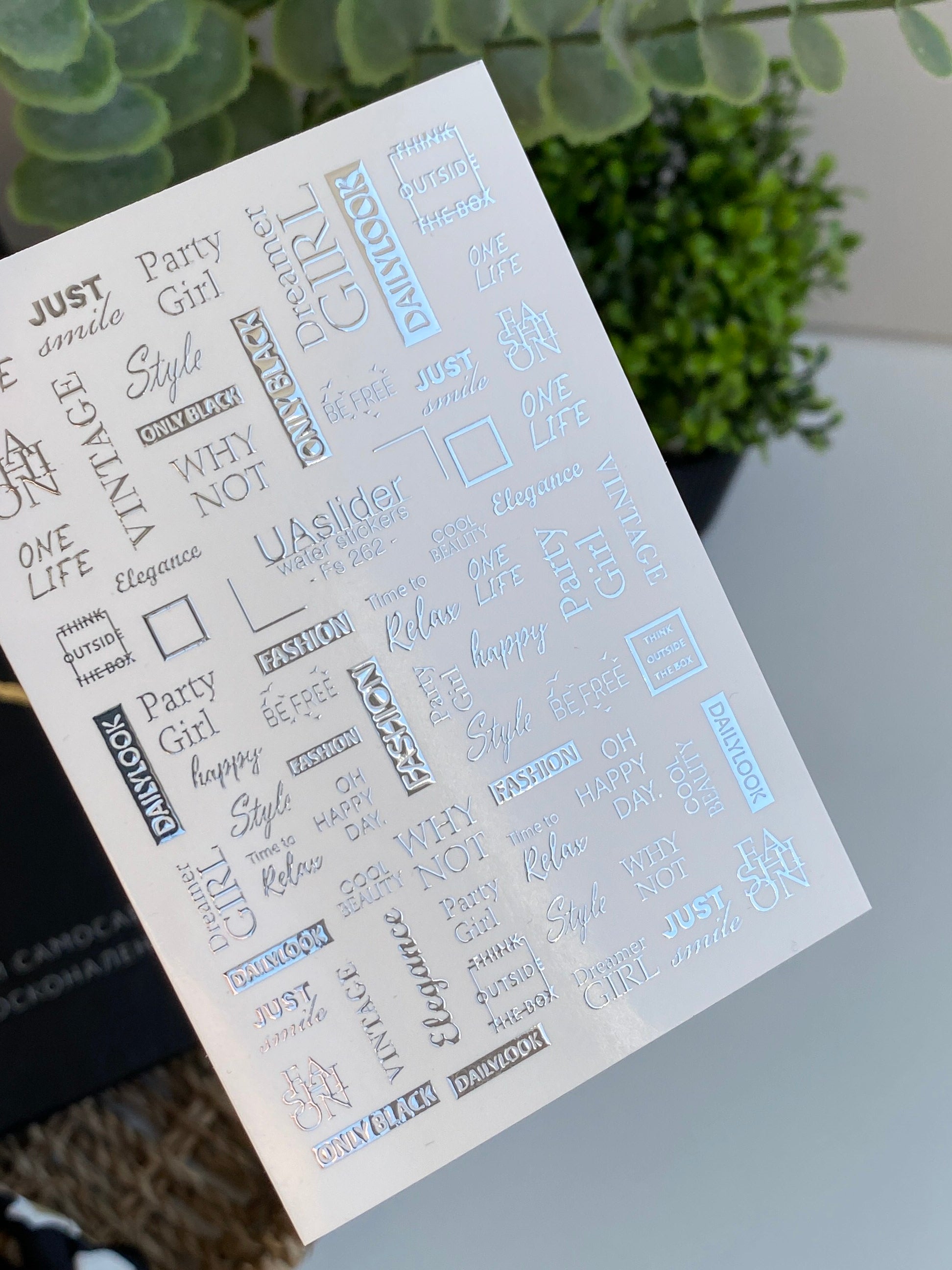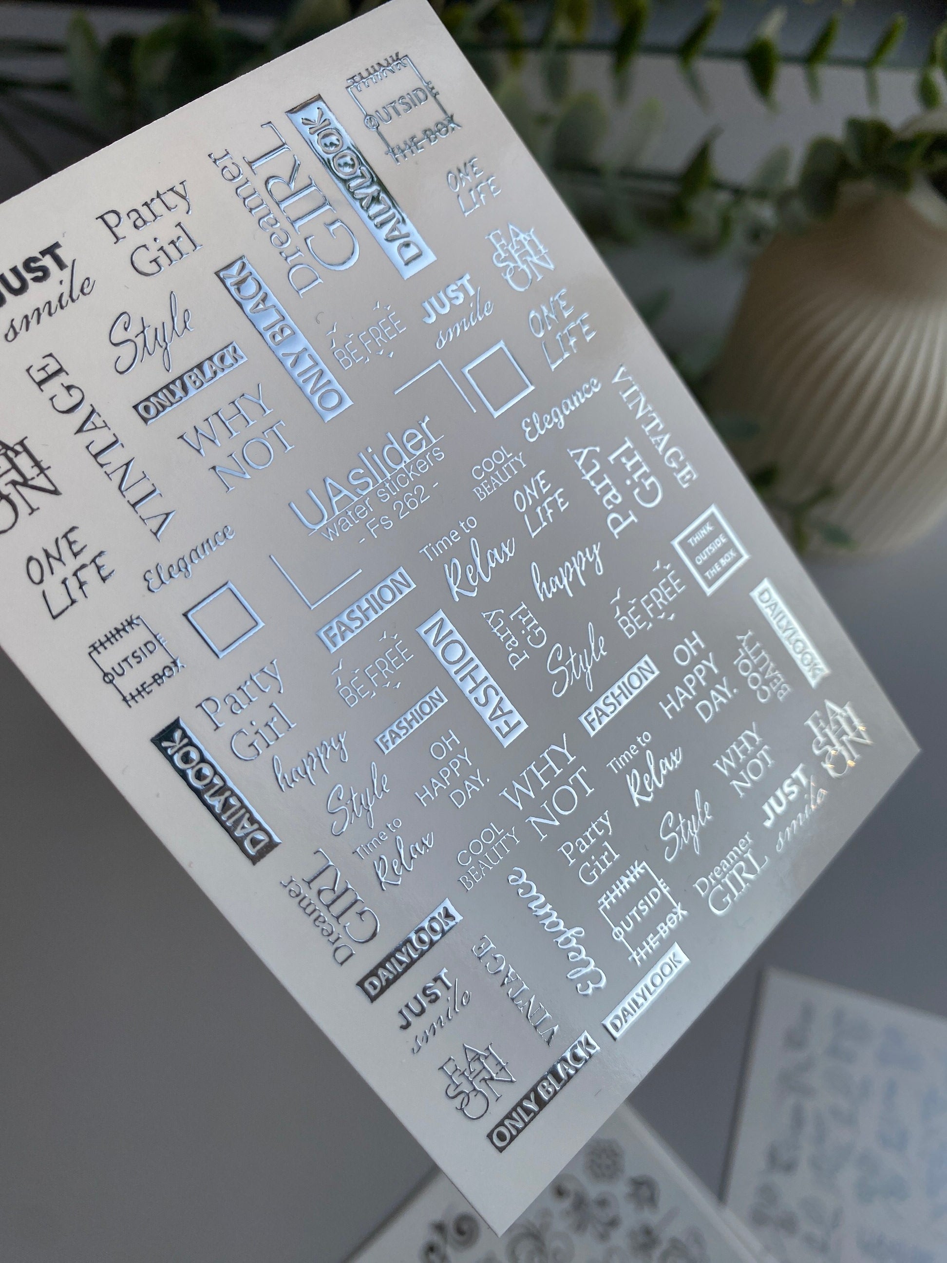 Nail Water Decal Fs-262 | Fashion Text Water Slide Nail Decals | Silver Foil Words & Trendy Phrases