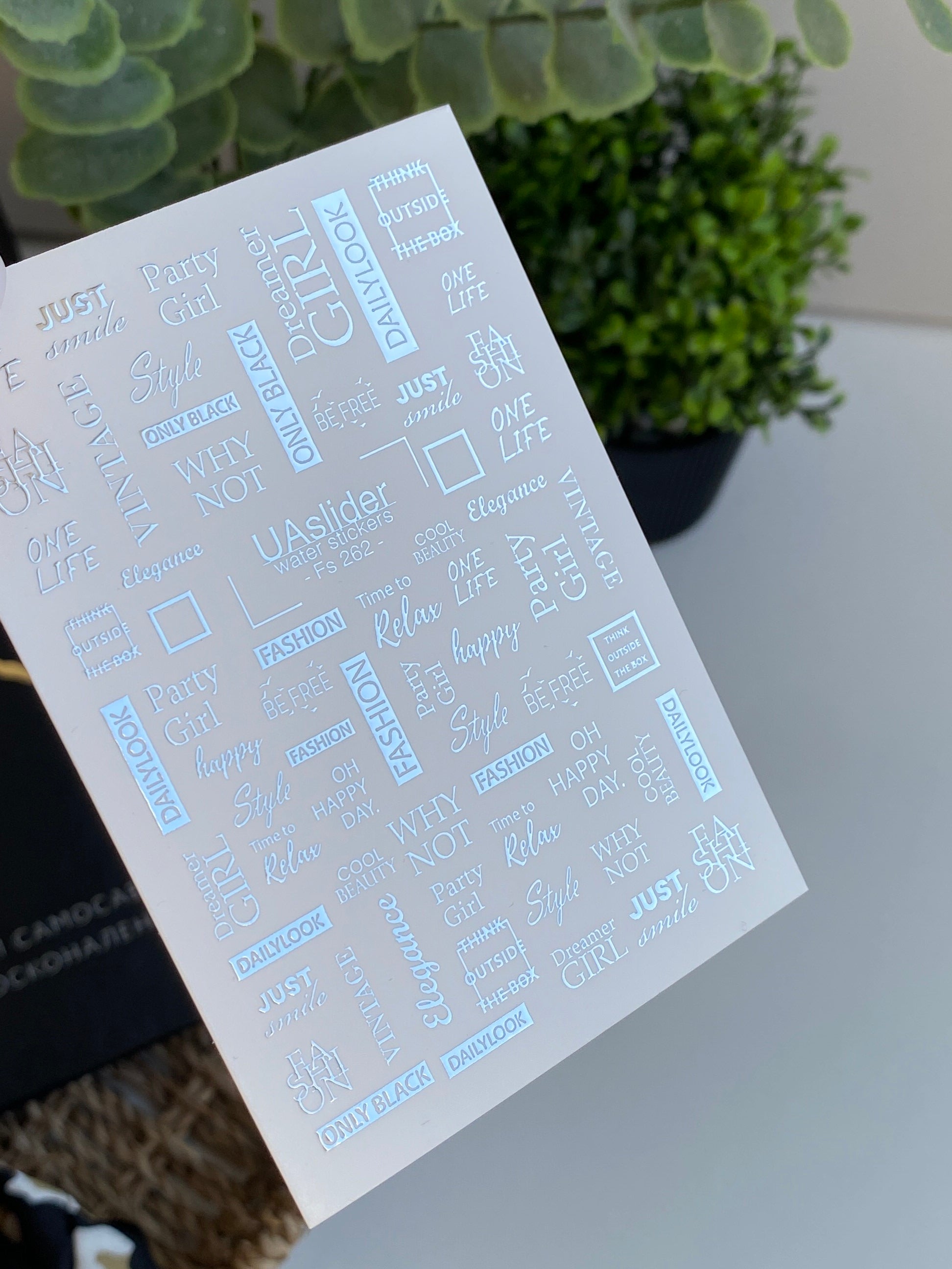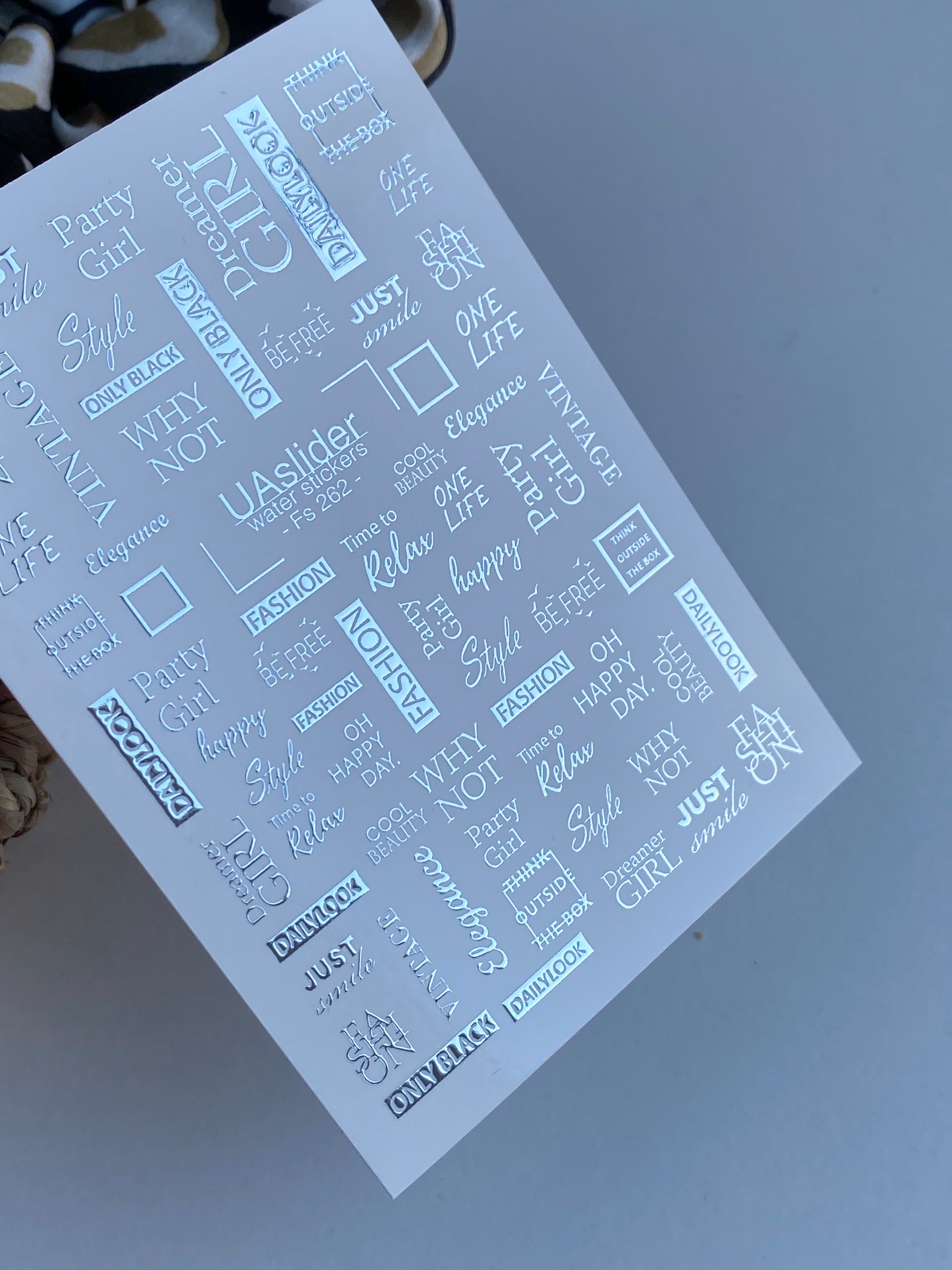 Fashion-inspired text water slide nail decals with metallic silver foil — featuring trendy words and phrases like One Life, Fashion, Party Girl, Just Smile, Be Free, Dreamer, and more. These nail water decals are water-activated: soak in water and the design slides off smoothly for an effortless transfer.