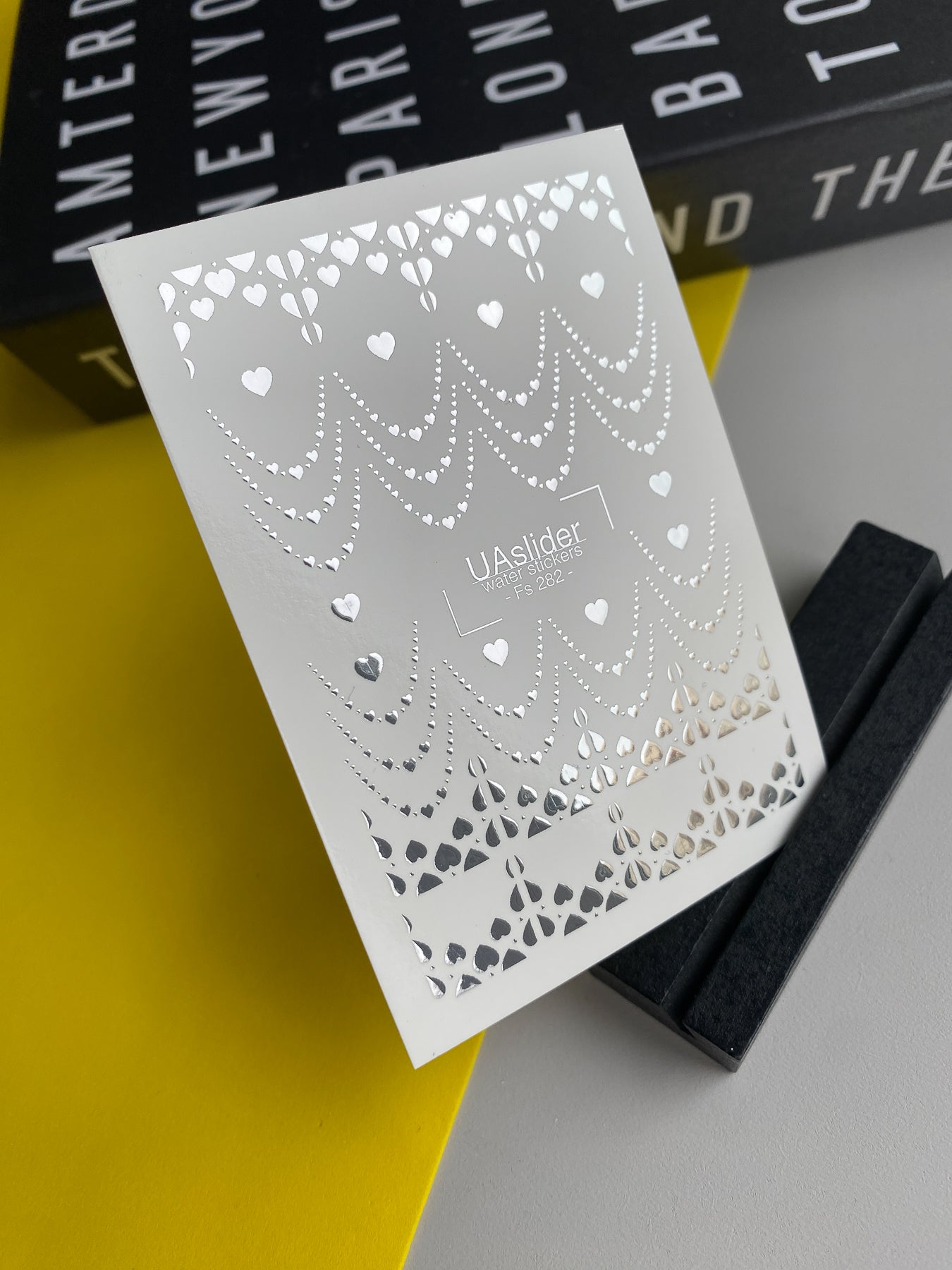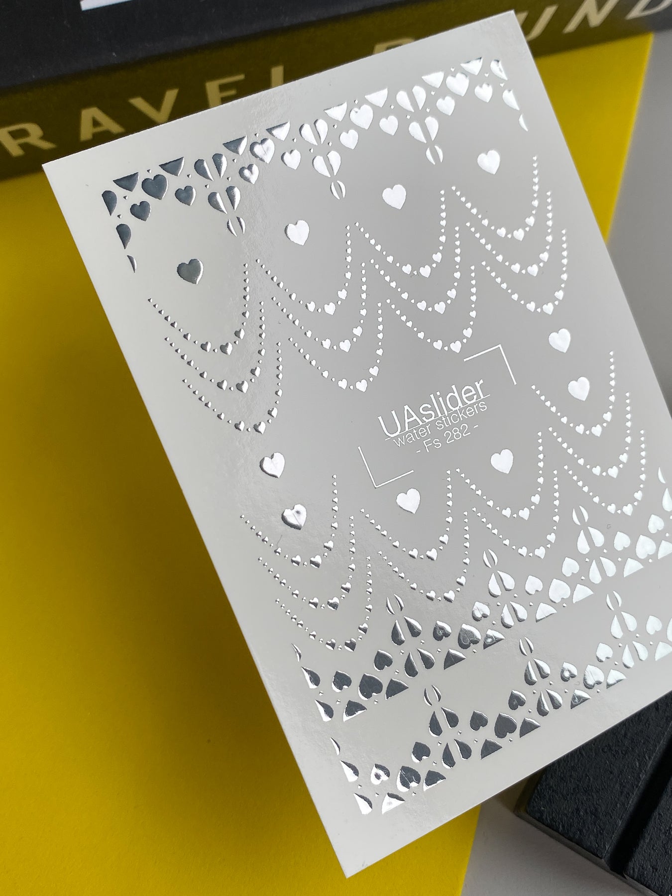 Romantic water slide nail decals with silver foil heart chains and dotted curved ornaments. These Nail Water Decals are easy to apply: simply soak in water and transfer the design onto your nails.