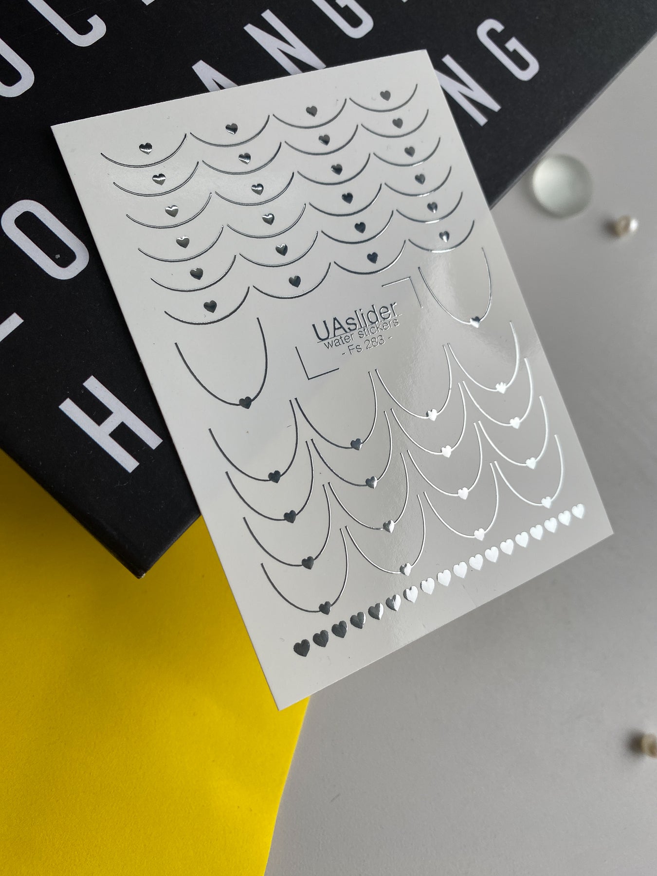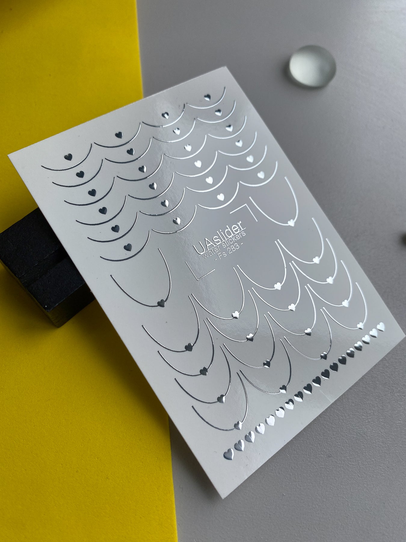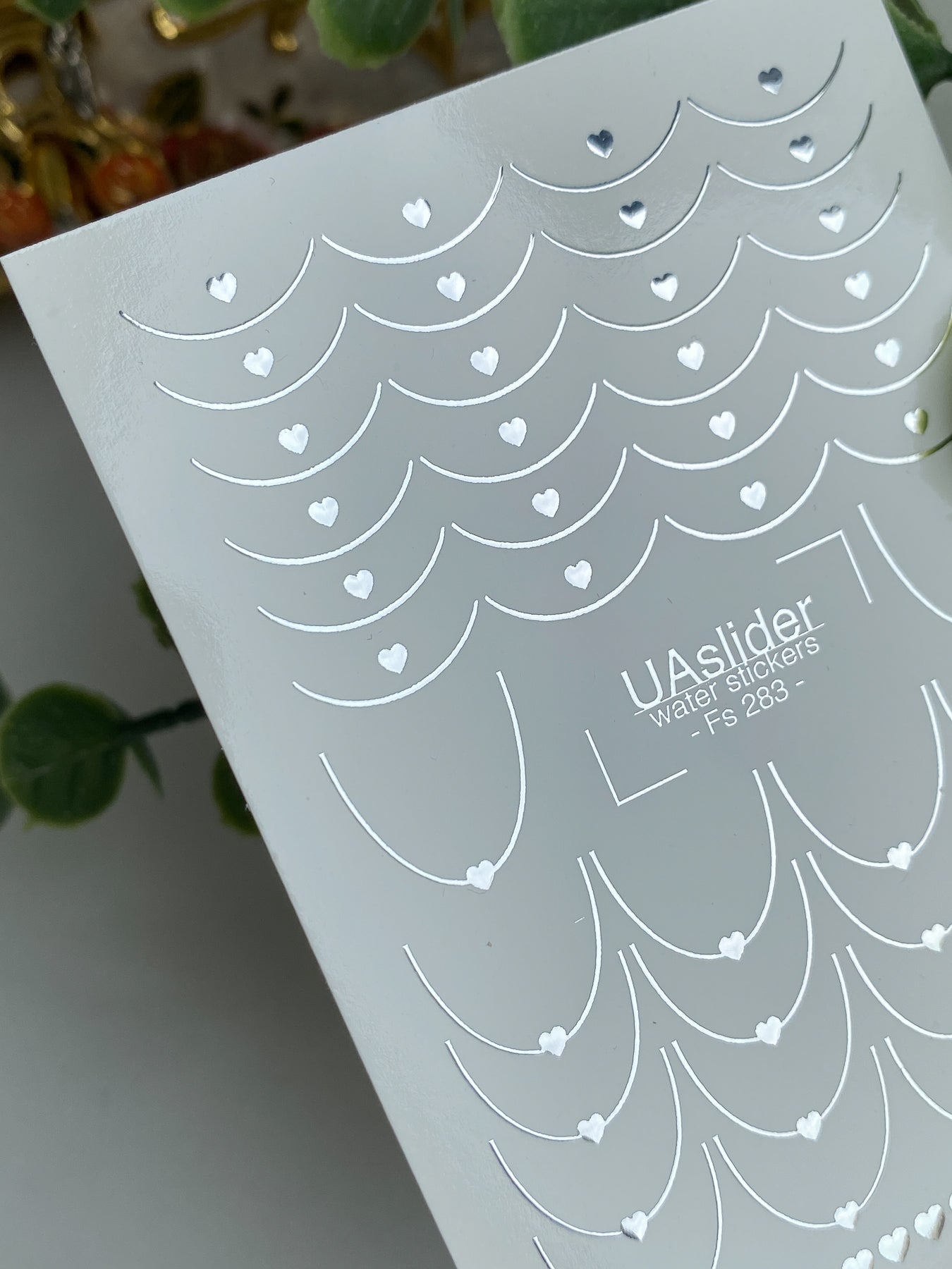 Delicate water slide nail decals with silver foil heart chains and curved arc ornaments. These Nail Water Decals apply easily — soak in water and transfer onto your nails.